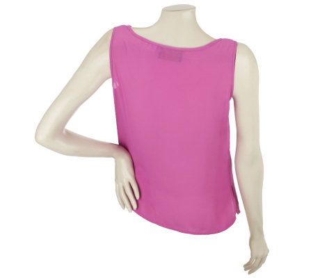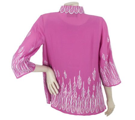 Ruffle some feathers. This embroidered button-front shirt and tank set boasts a bevy of fashionable features. The classic collar and 3/4-length sleeves are pitch perfect, but embroidered feather details are what really make this look take flight. From Bob Mackie.