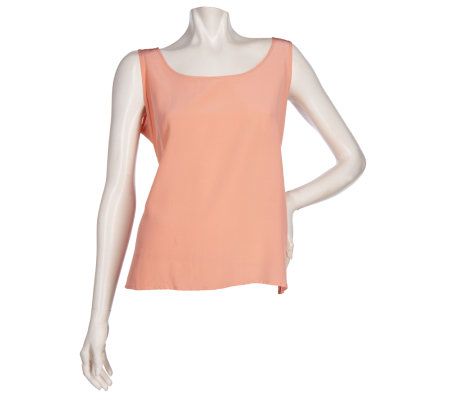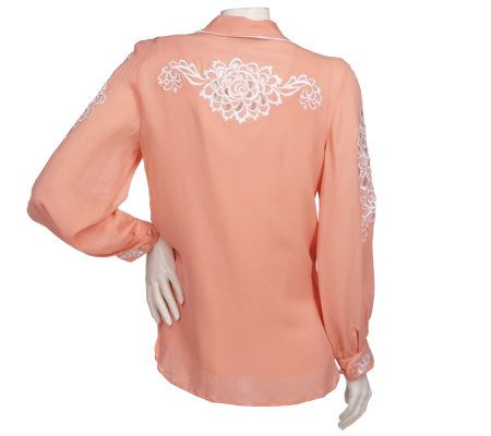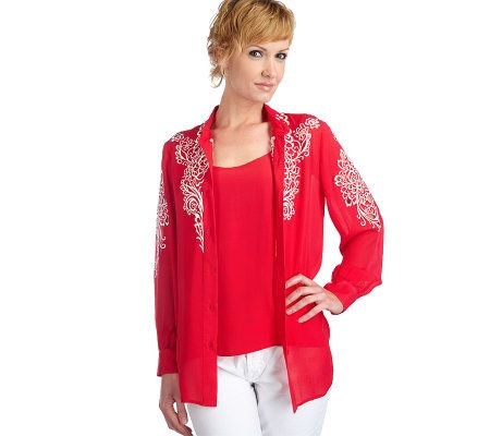 Create instant drama with this gauzy-glam, silk georgette twinset. The blouse is expertly detailed with embroidery on the front, collar, sleeves, back, and yoke. A dyed-to-match tank completes the look. From Bob Mackie.