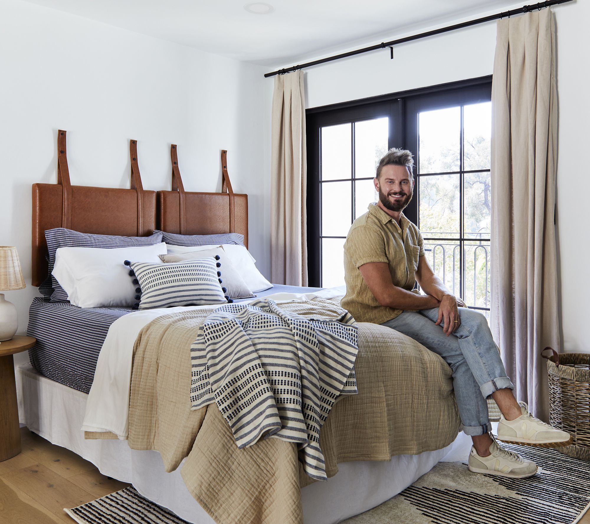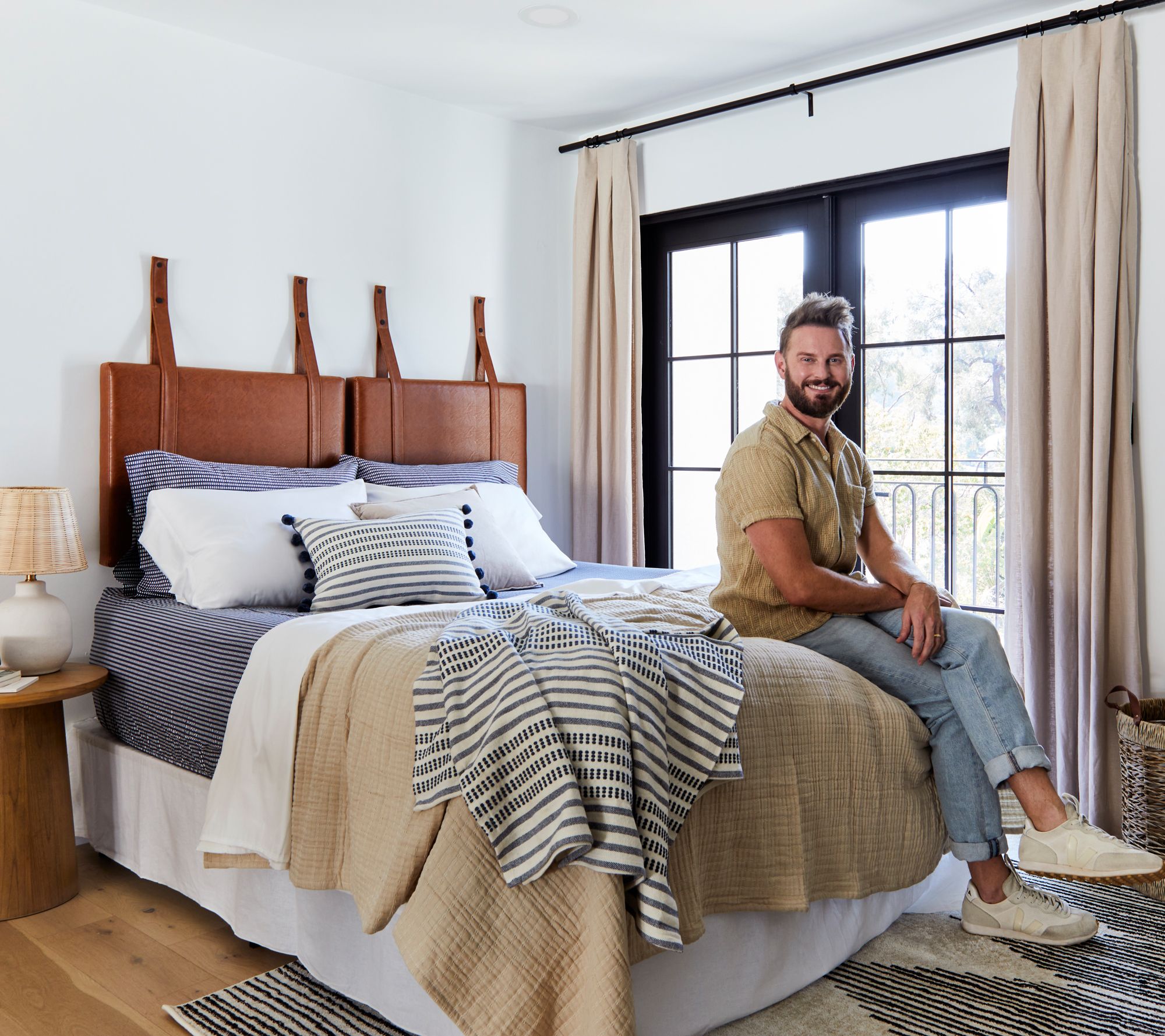 Instantly boost your bedroom's style with the addition of this handsome hanging headboard, complete with four stitched straps and a faux leather construction. From Bobby Berk.