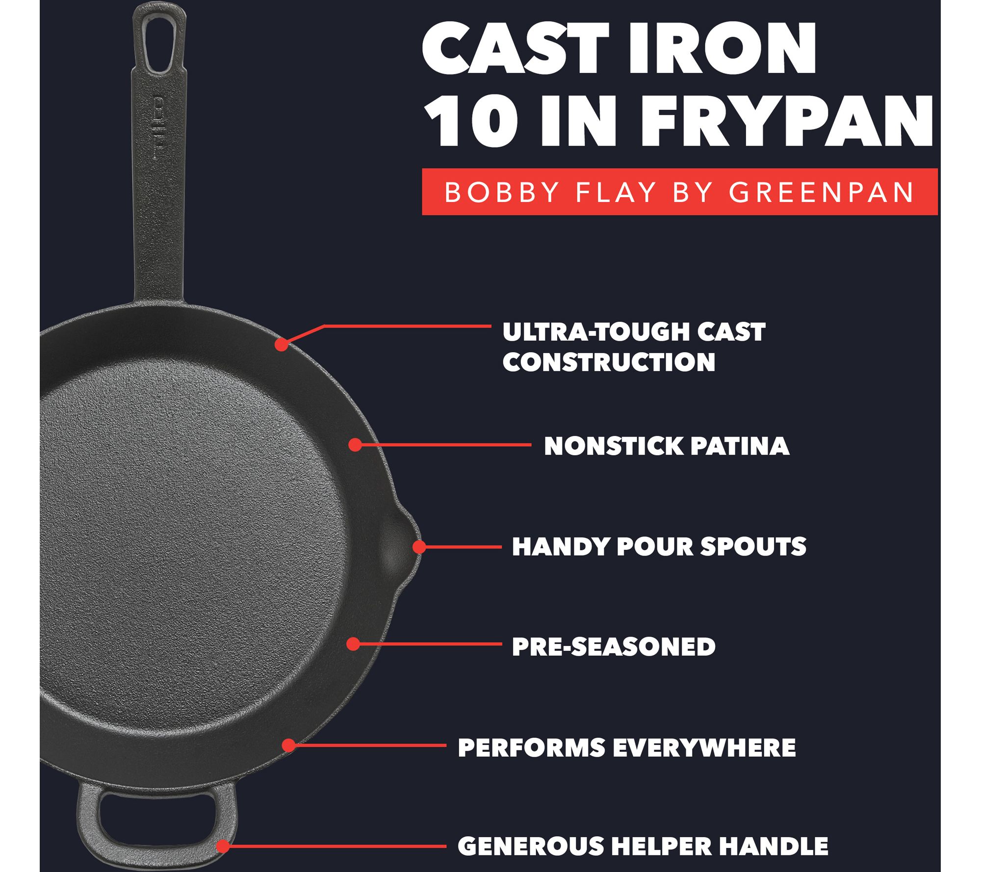 From the kitchen of Bobby Flay, this 10" cast-iron frypan by GreenPan brings robust cooking prowess to your home. Perfect for golden-brown finishes or timeless down-home baking, its pre-seasoned body develops a nonstick patina with every use. The wide helper handle ensures balance and control, while handy pour spouts make draining and transferring a breeze. Whether on the stovetop, grill, oven, or open flame, this skillet is designed for exceptional cooking experiences. From Bobby Flay by GreenPan.