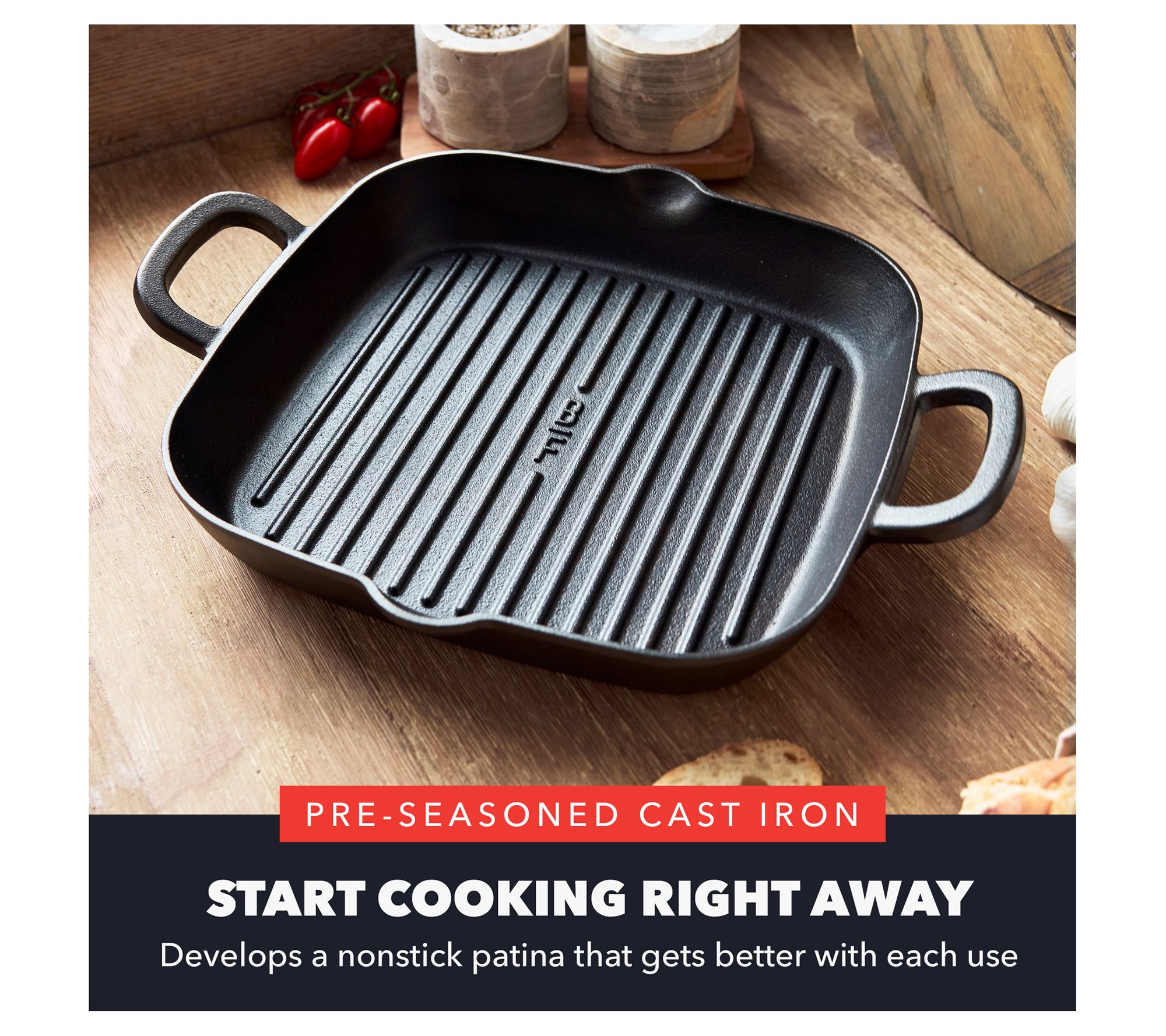 • Pre-seasoned cast-iron body develops nonstick patina with each use