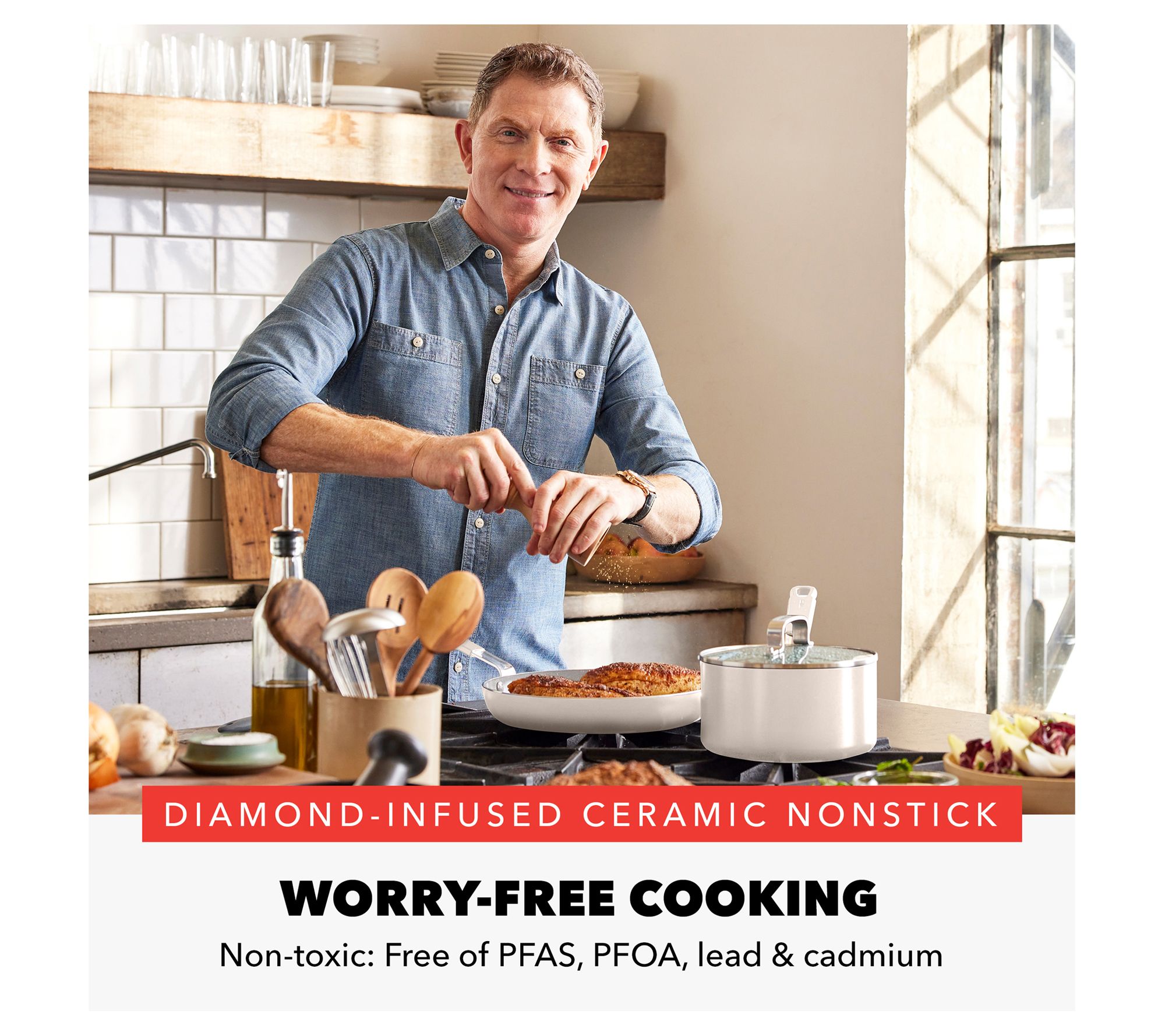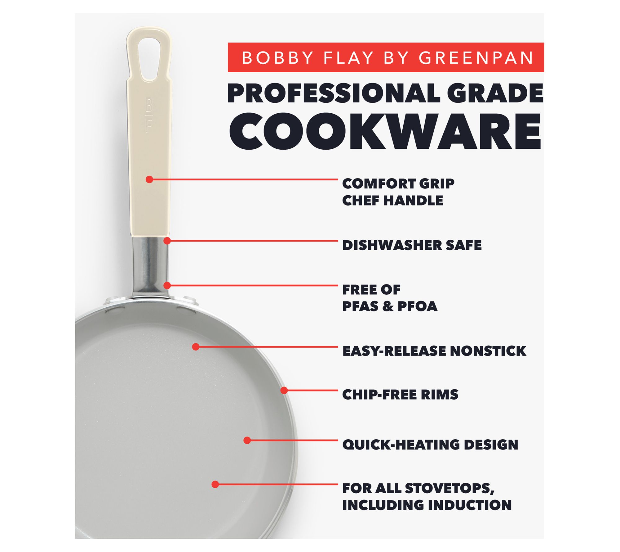 Legendary chef Bobby Flay has teamed up with GreenPan to bring you superior nonstick performance with these ceramic nonstick 8" and 10" frypans. Made from quick-heating aluminum and diamond-infused ceramic nonstick coating, these frypans provide precise temperature control so you can master your meals. From Bobby Flay by GreenPan.