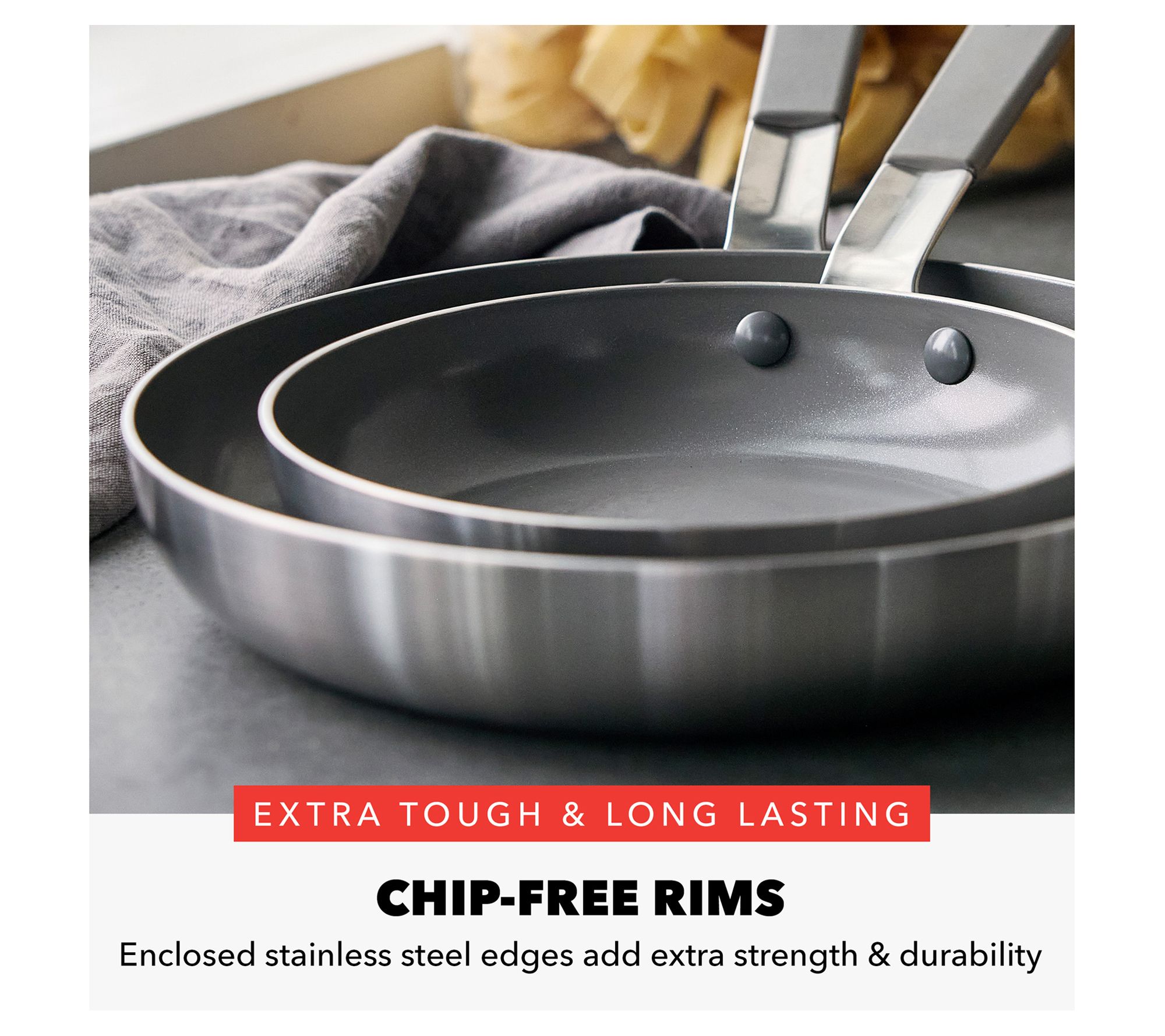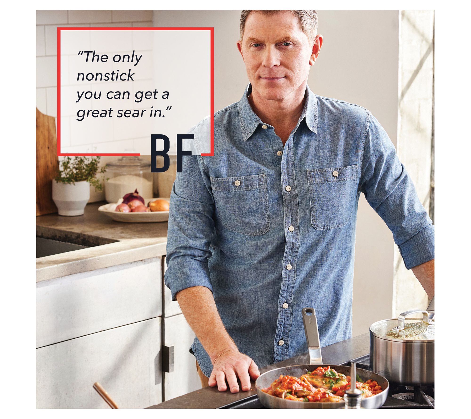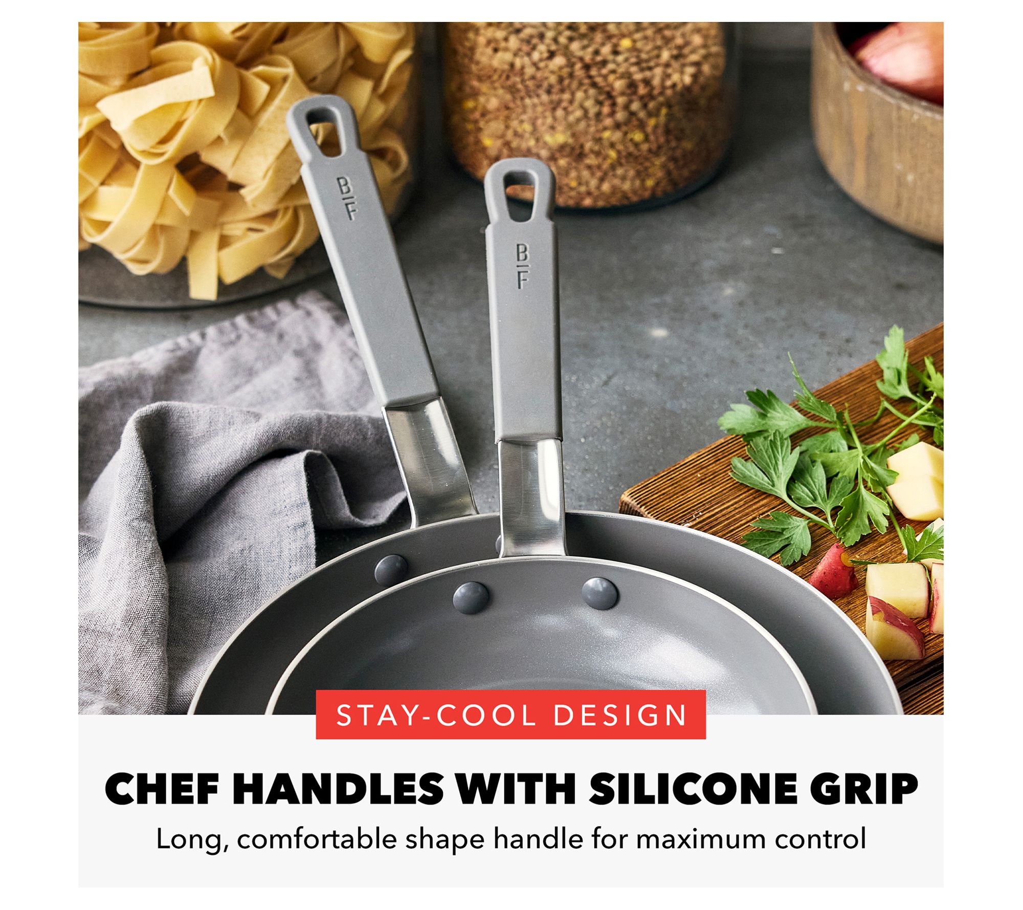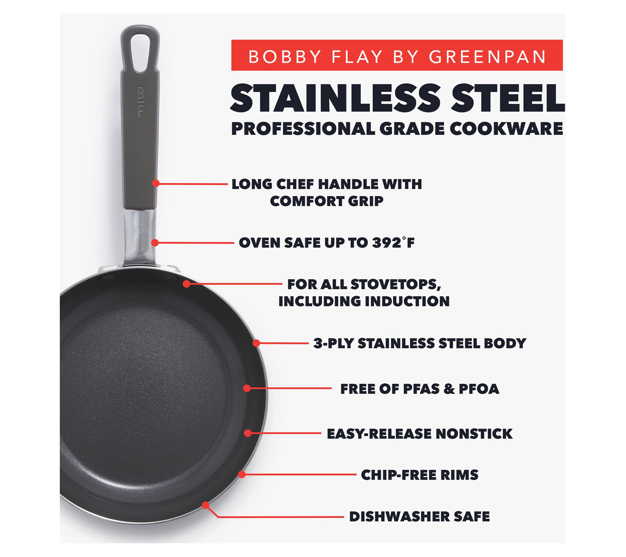 Take your culinary skills to new heights with the Bobby Flay by GreenPan nonstick stainless steel frypan set. Designed by world-renowned chef Bobby Flay, this set offers pro-level performance with its tri-ply construction and aluminum core for even heating. The nonstick coating ensures easy, worry-free cooking, while the stay-cool chef handles provide comfort during use. From Bobby Flay by GreenPan.