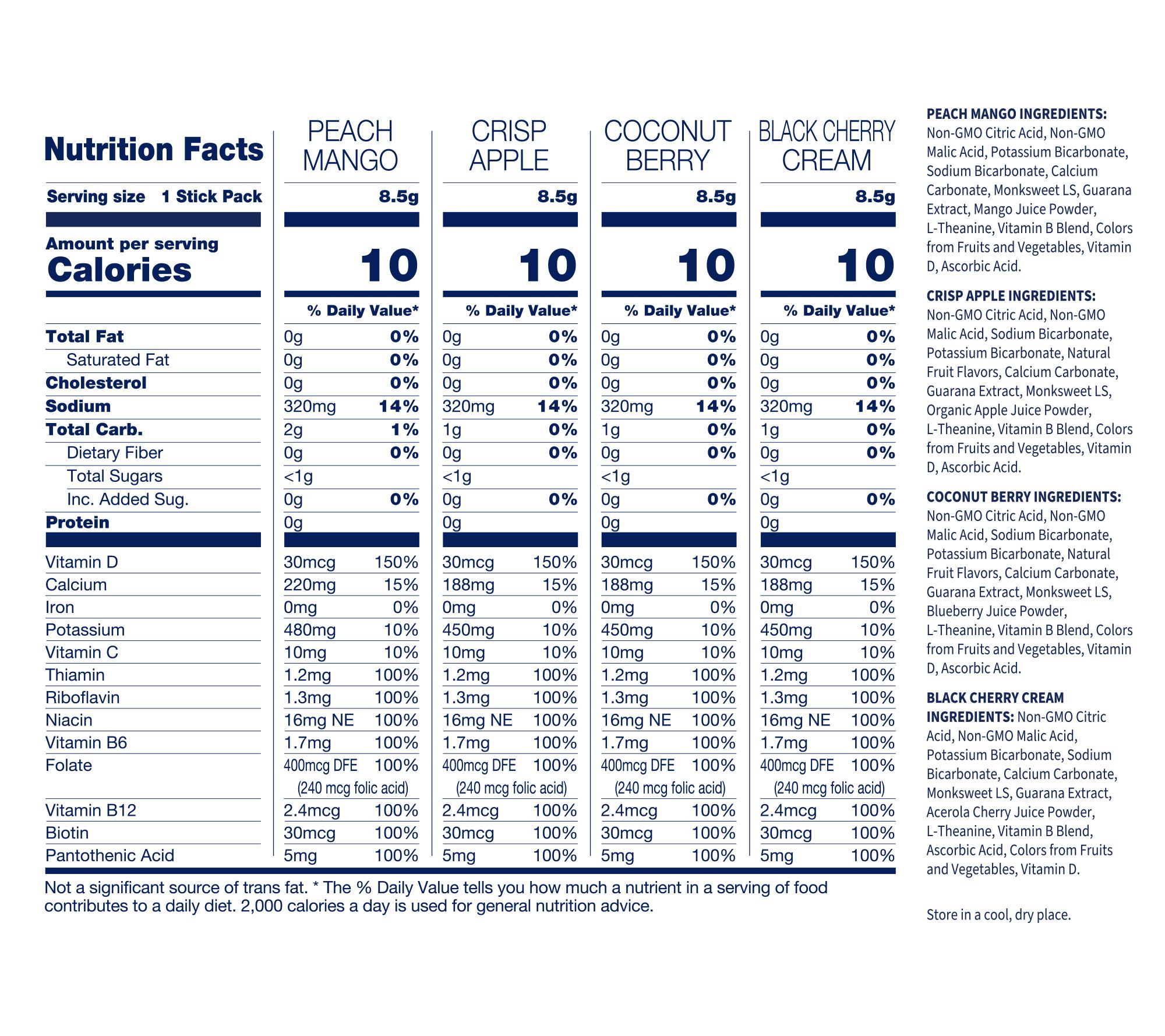 • Includes 32 caffeinated hydration packs: eight each of Crisp Apple, Coconut Berry, Dark Cherry Cream, and Peach Mango