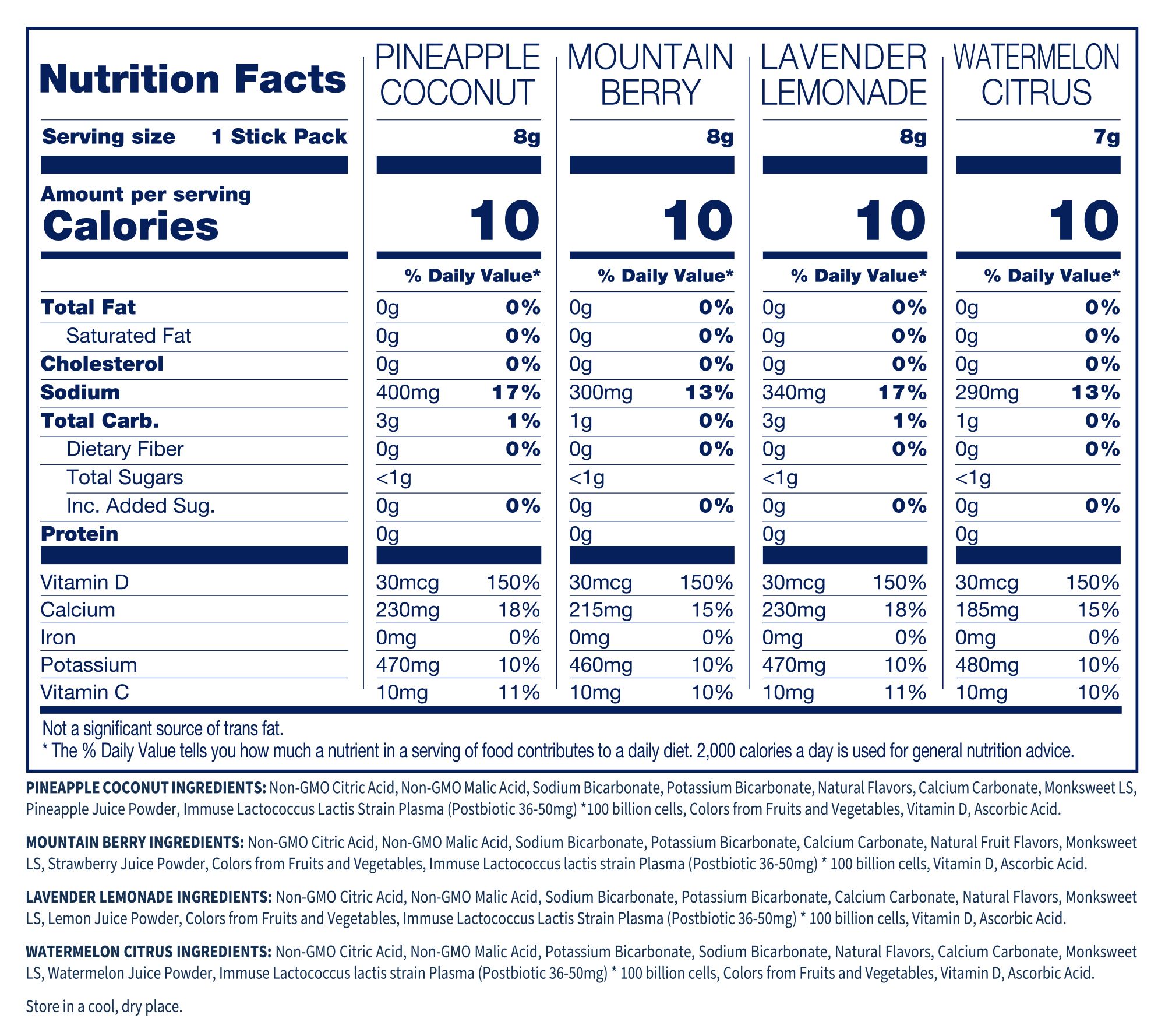 • Includes 32 hydration packs: eight each of Mountain Berry, Watermelon Citrus, Lavender Lemonade, and Pineapple Coconut