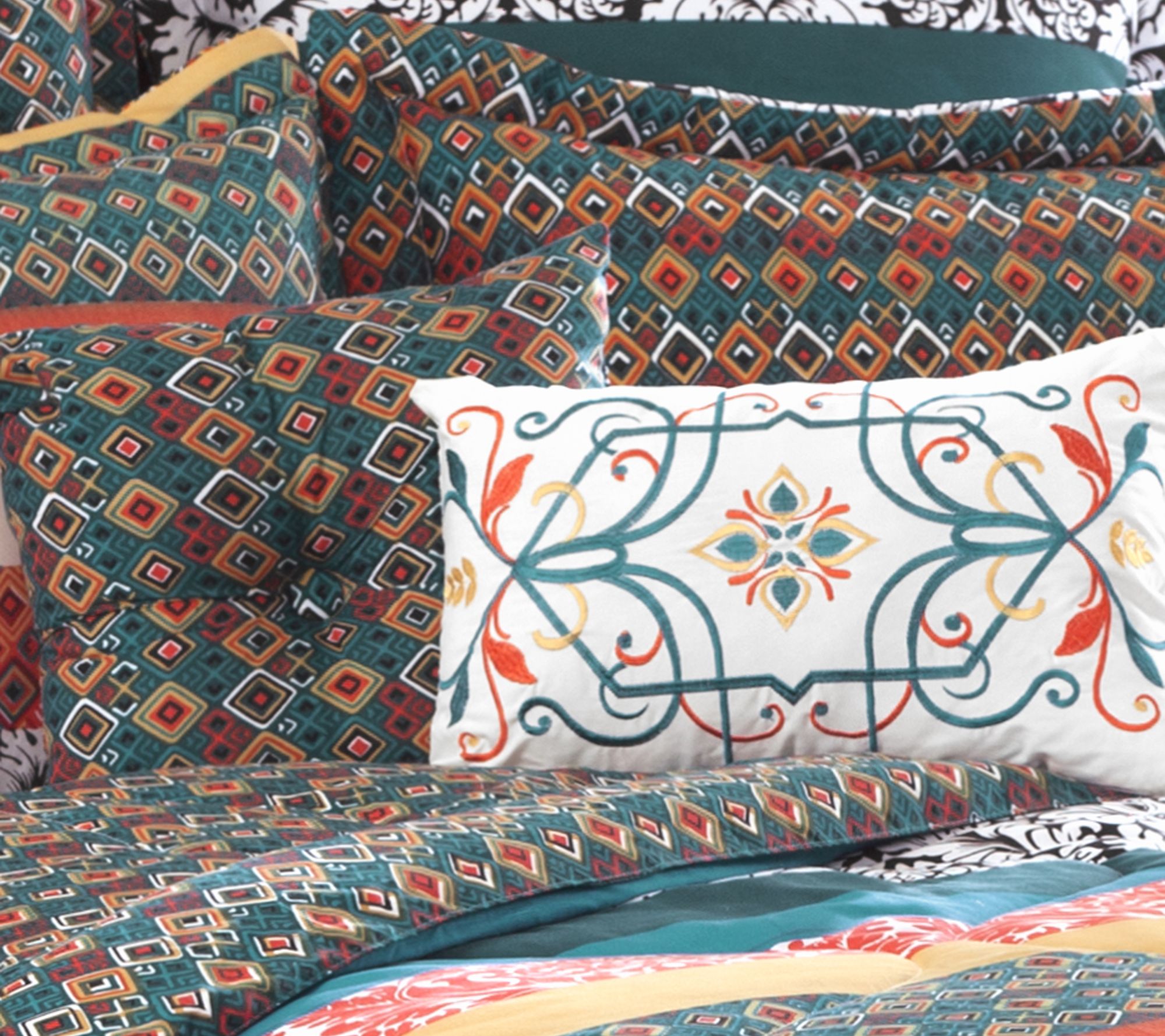 • Includes one quilt, two shams, two Euro shams, one decorative pillow, one round decorative pillow; additional items (shown) not included
