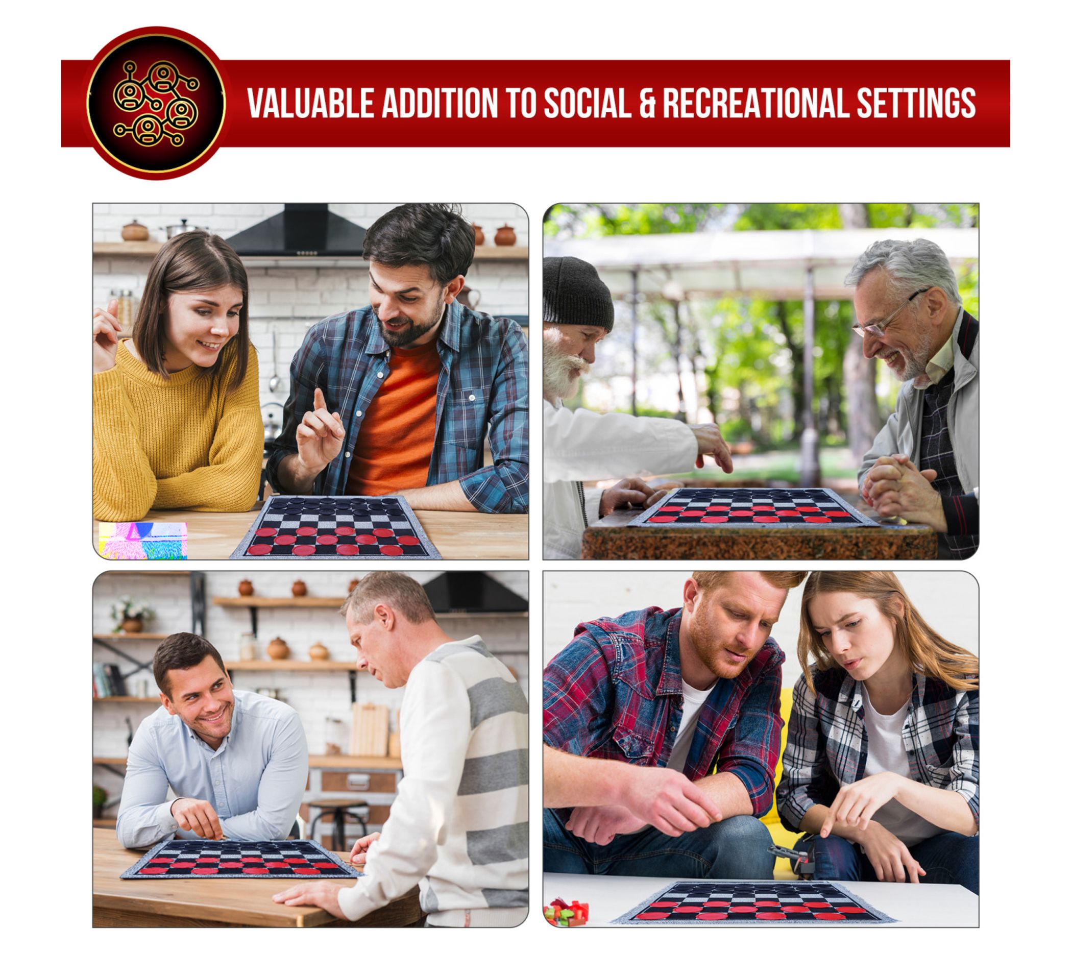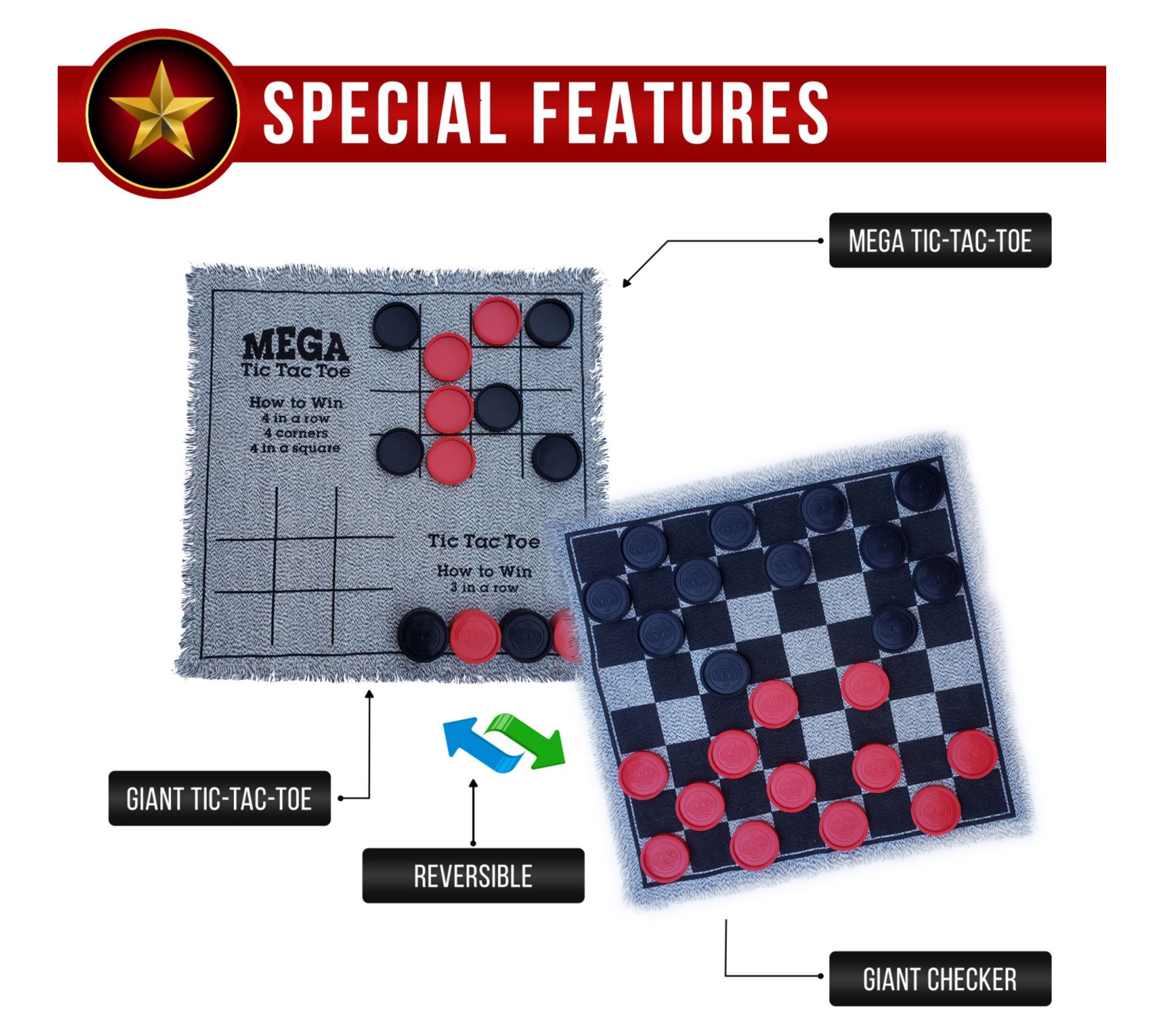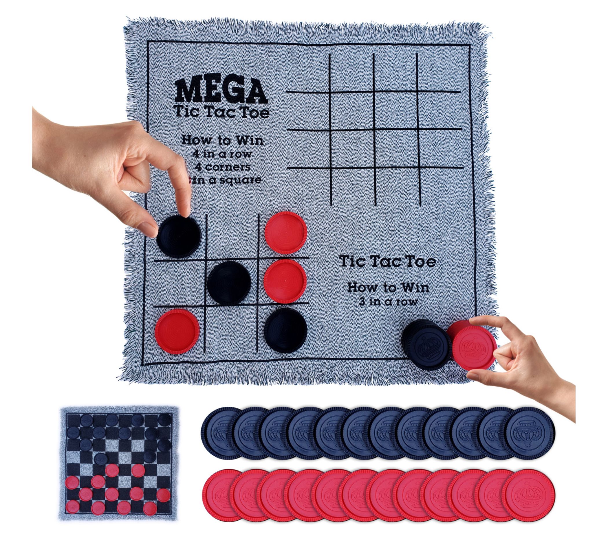Imagine the classic appeal of checkers, but super-sized for maximum excitement! The Bolaball 3-in-1 giant checkers game features an expansive 26" x 26" reversible mat, offering not just checkers but also tic tac toe and mega tic tac toe for endless fun. Perfect for the park, beach, or backyard, it's a versatile game for all ages. From Bolaball.