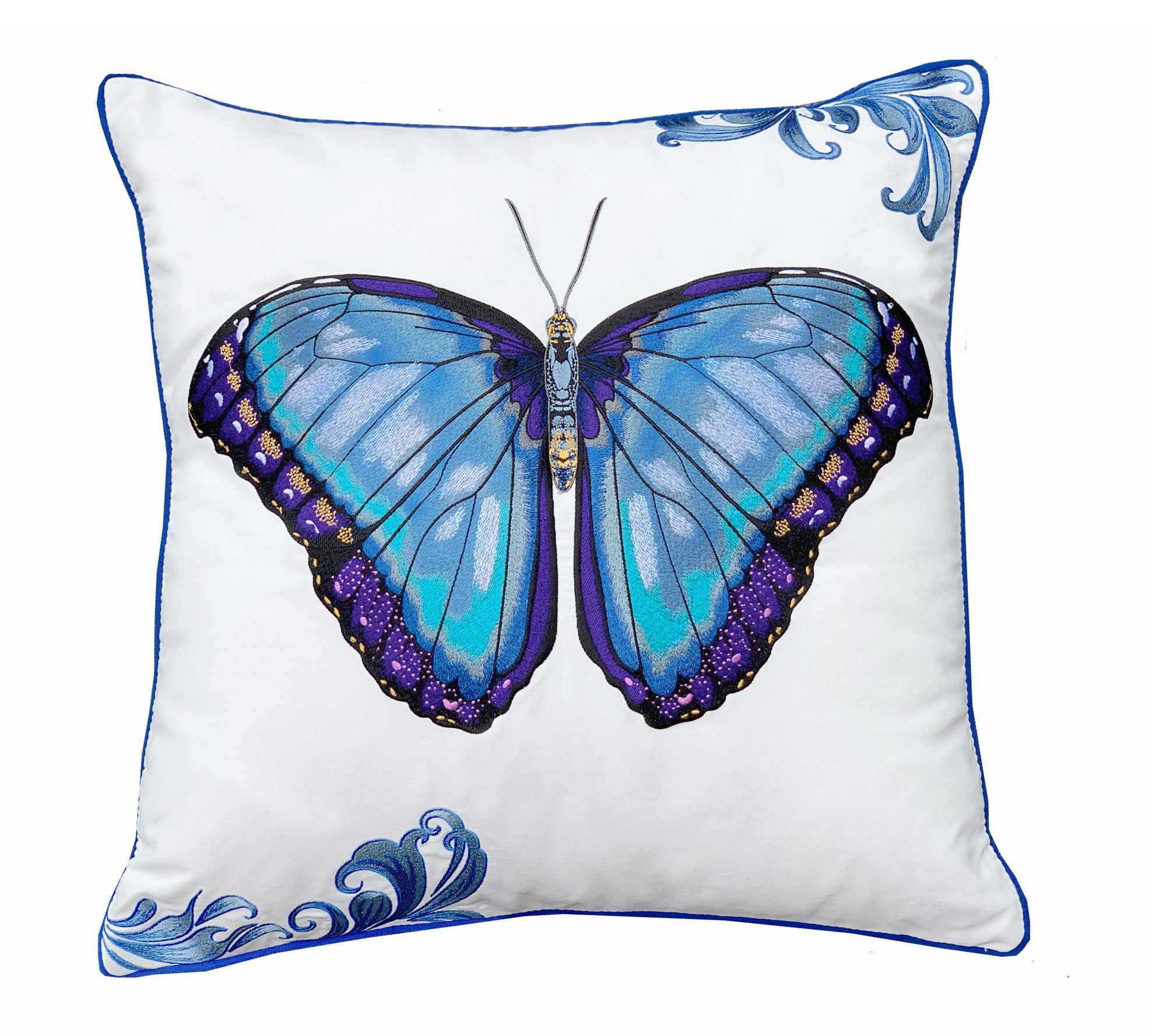 Brighten up any space with this decorative pillow that brings a vibrant touch of nature indoors or out. Featuring a vivid embroidered blue butterfly, the pillow is crafted from Olefin performance fabric to stand up to the elements and daily use. From the Valerie Parr Hill Collection.