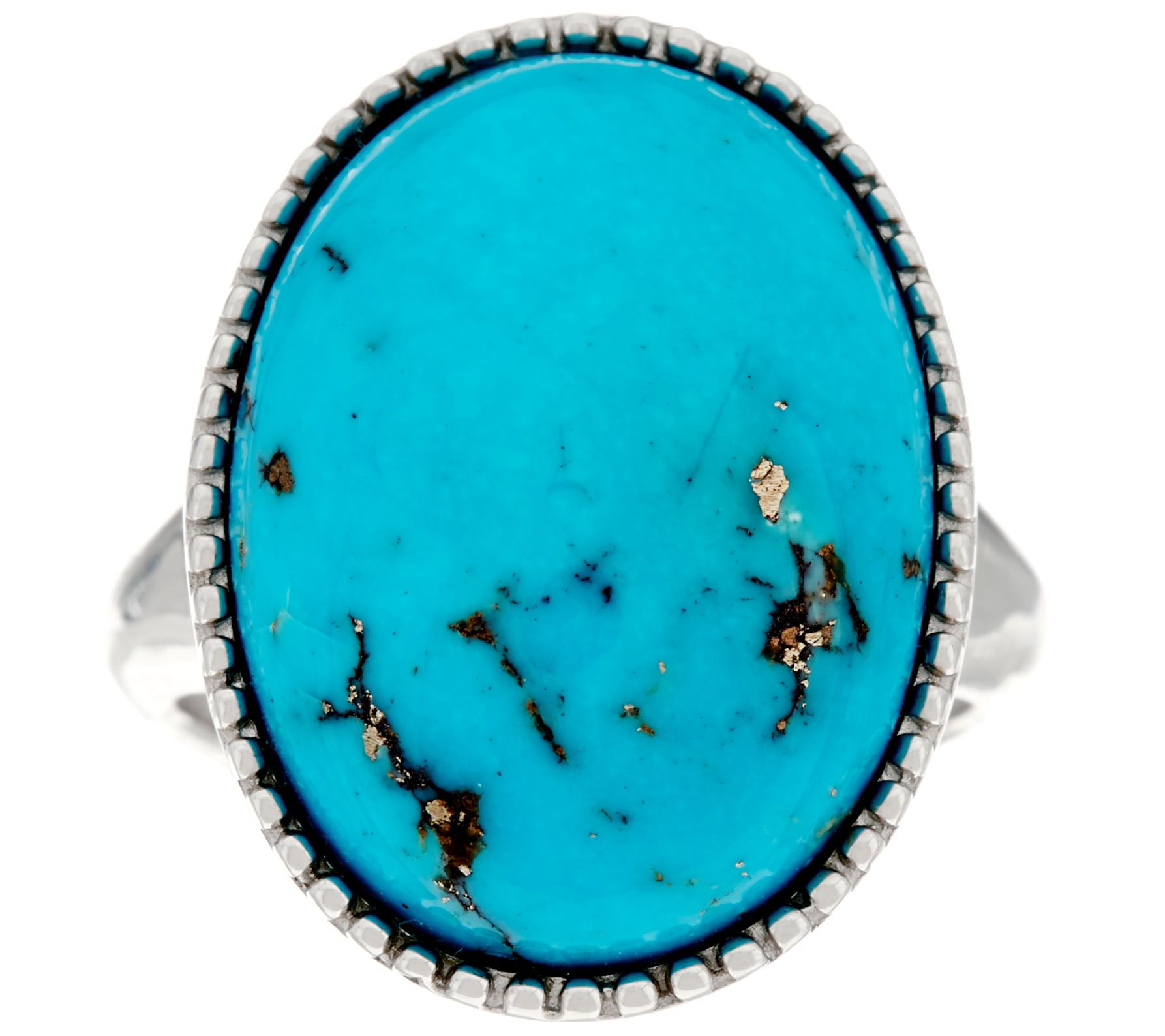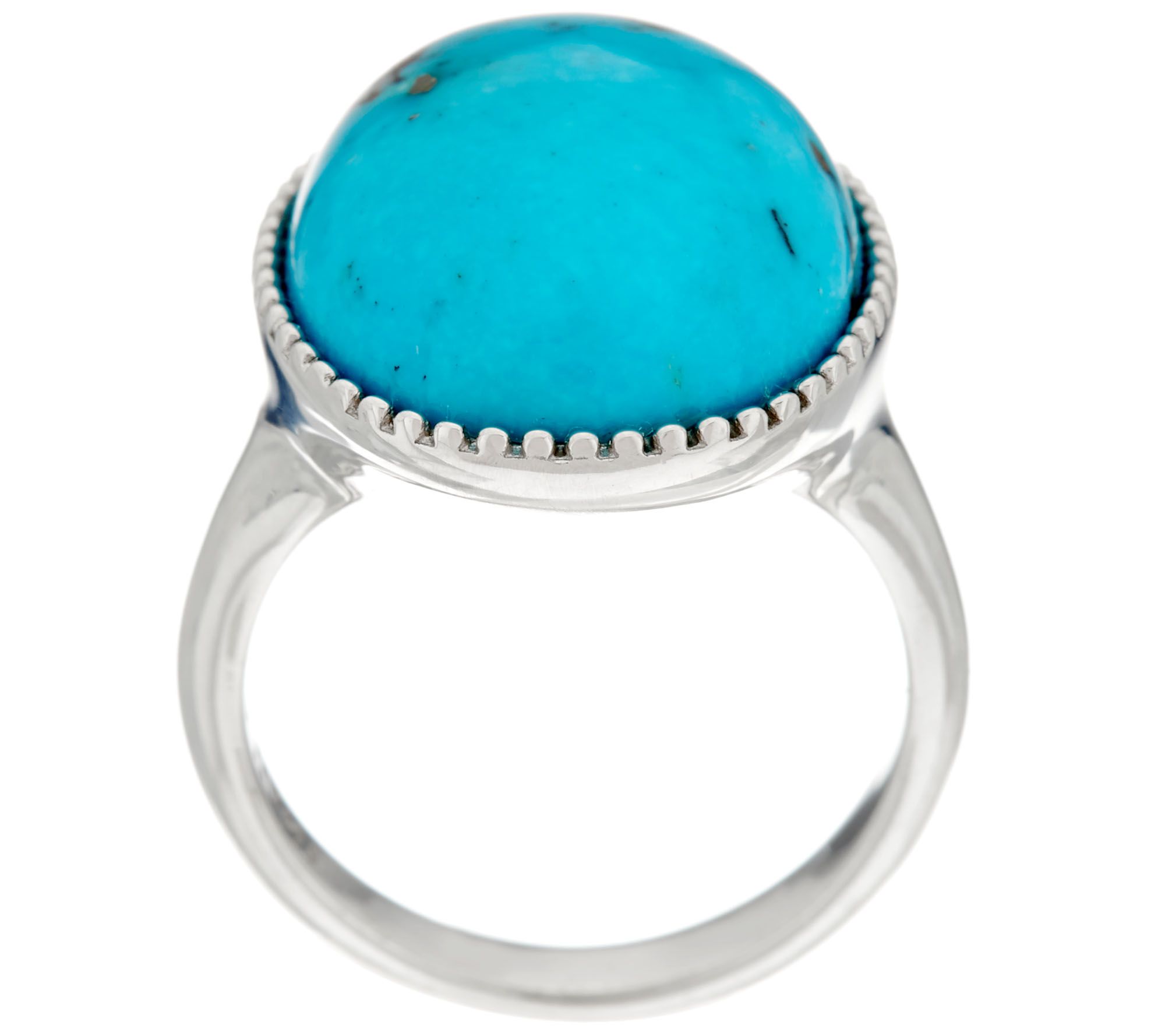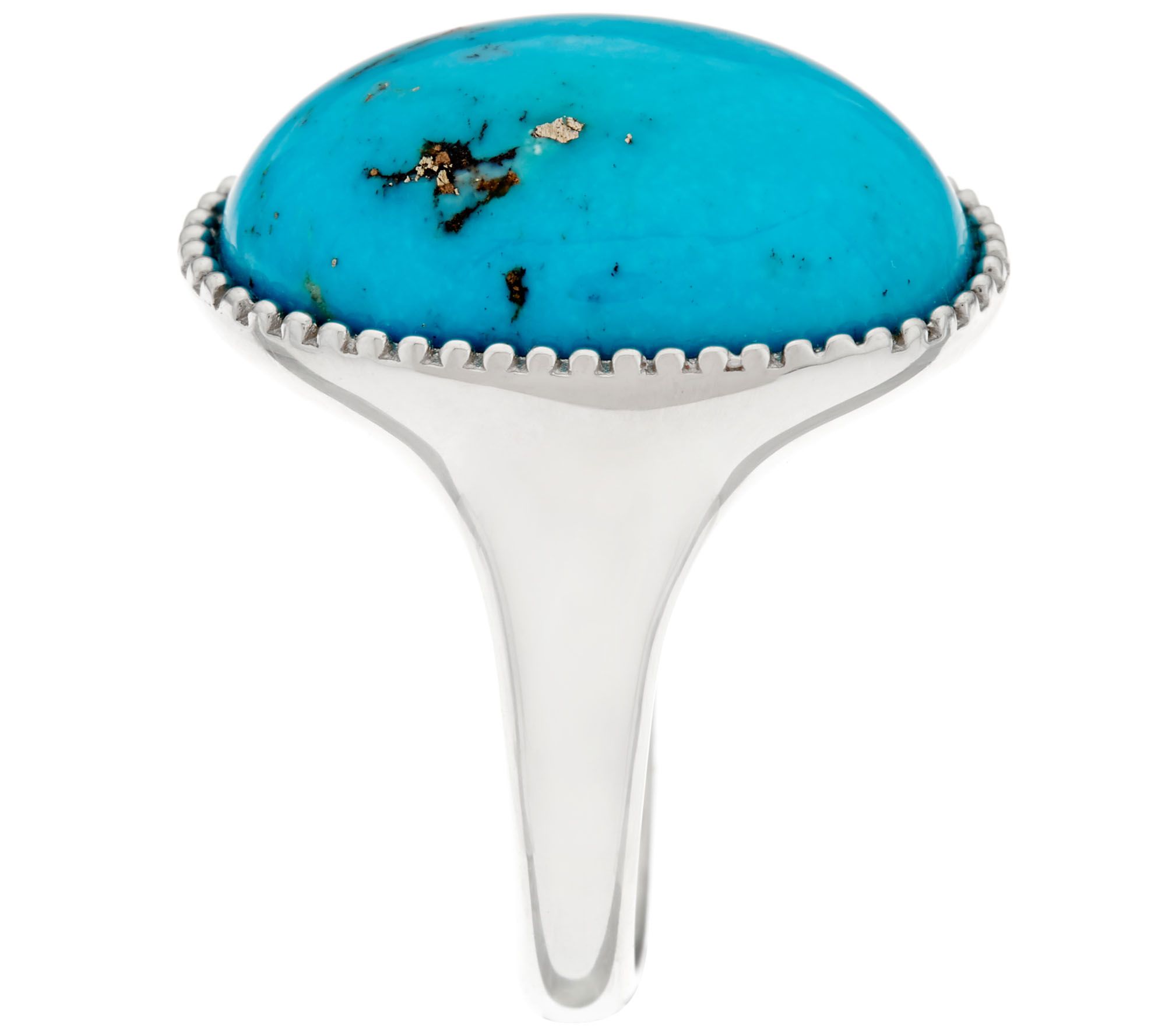 • Bezel-set, oval Kingman turquoise cabochon gemstone; highly polished shank