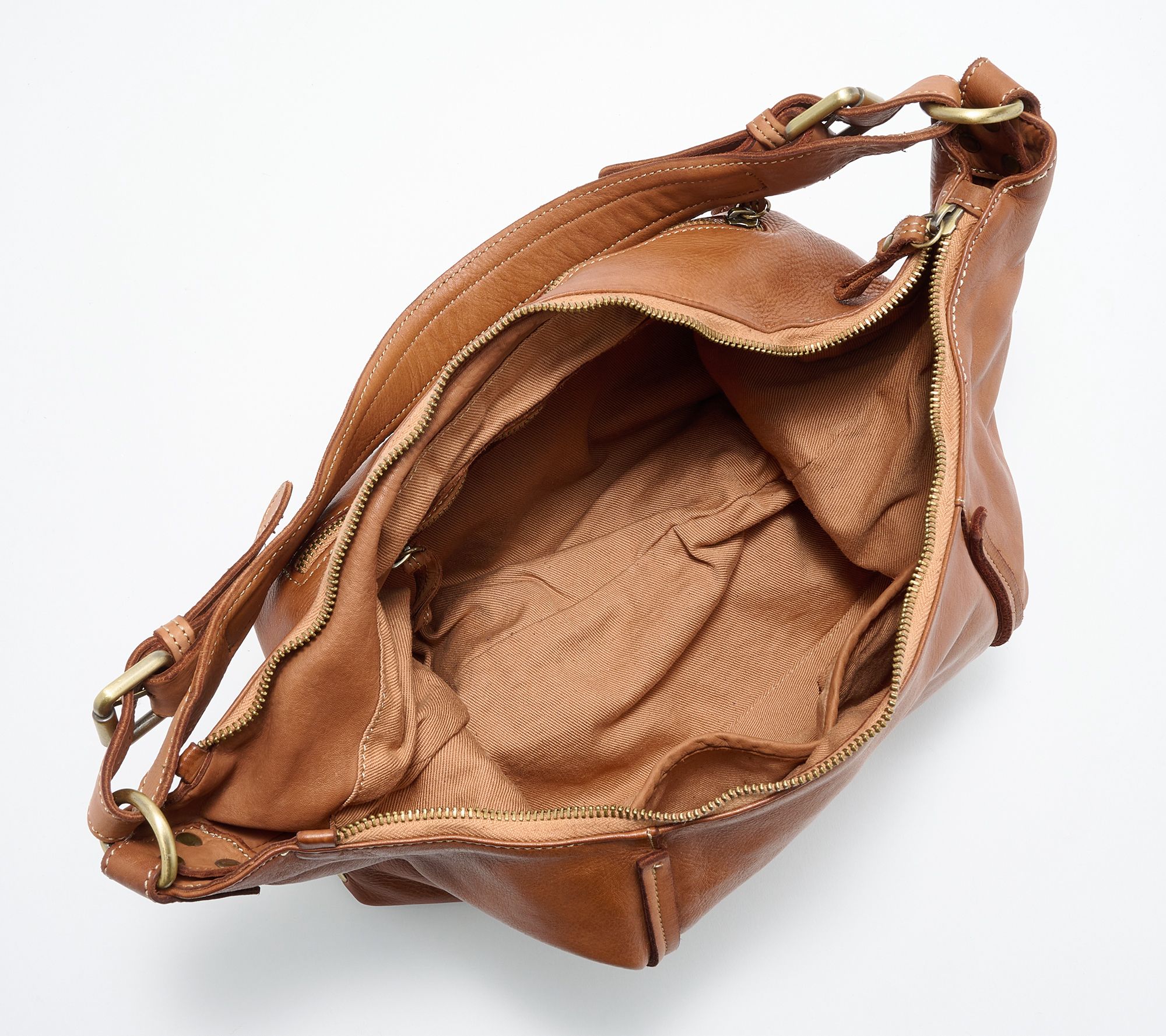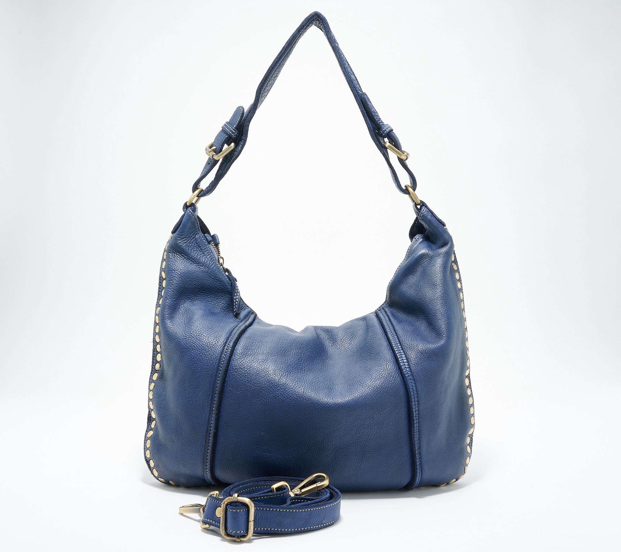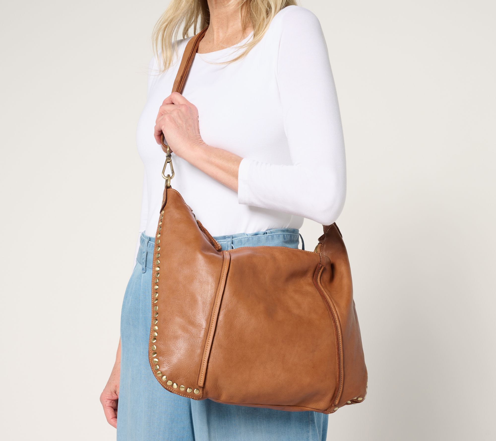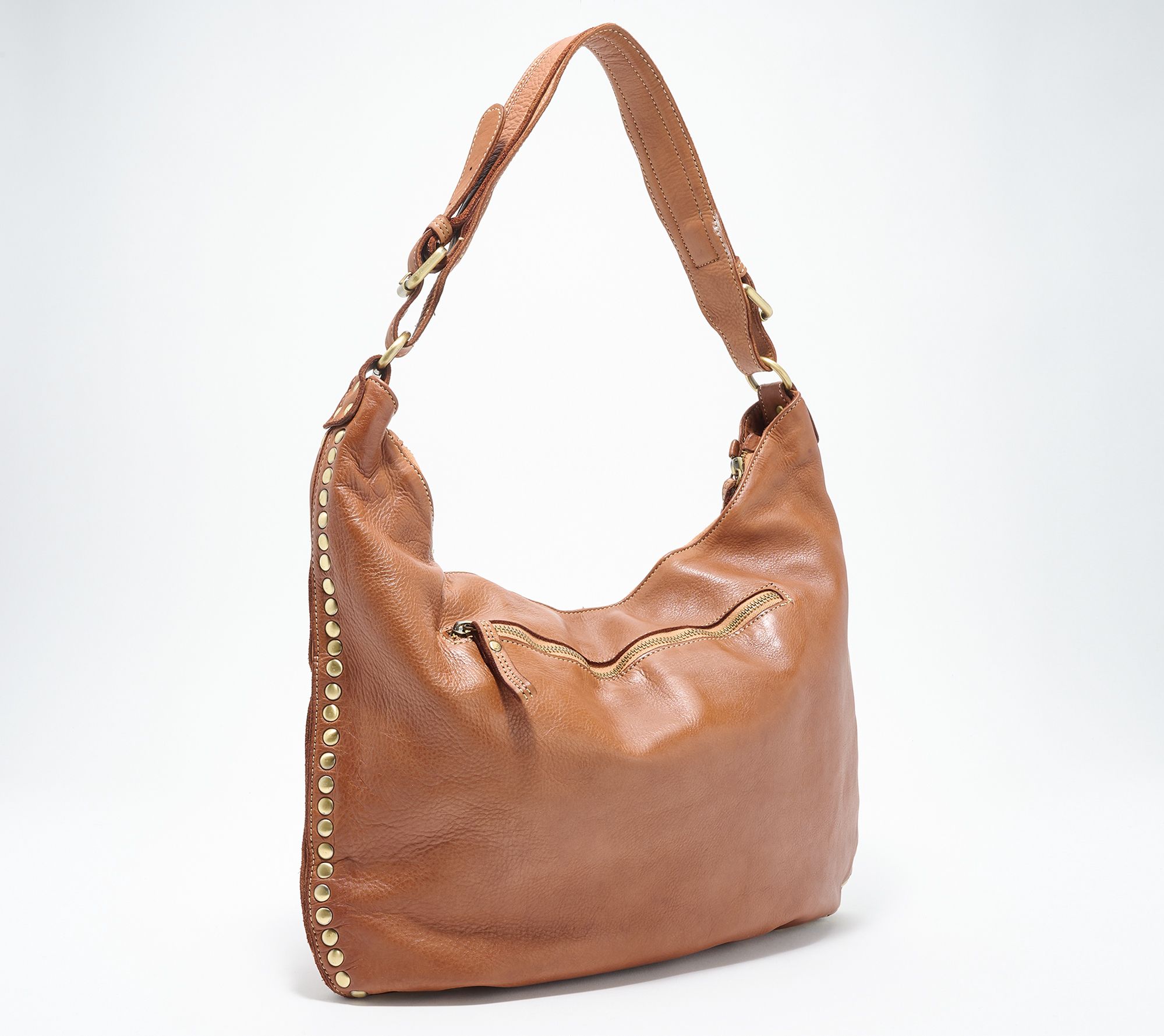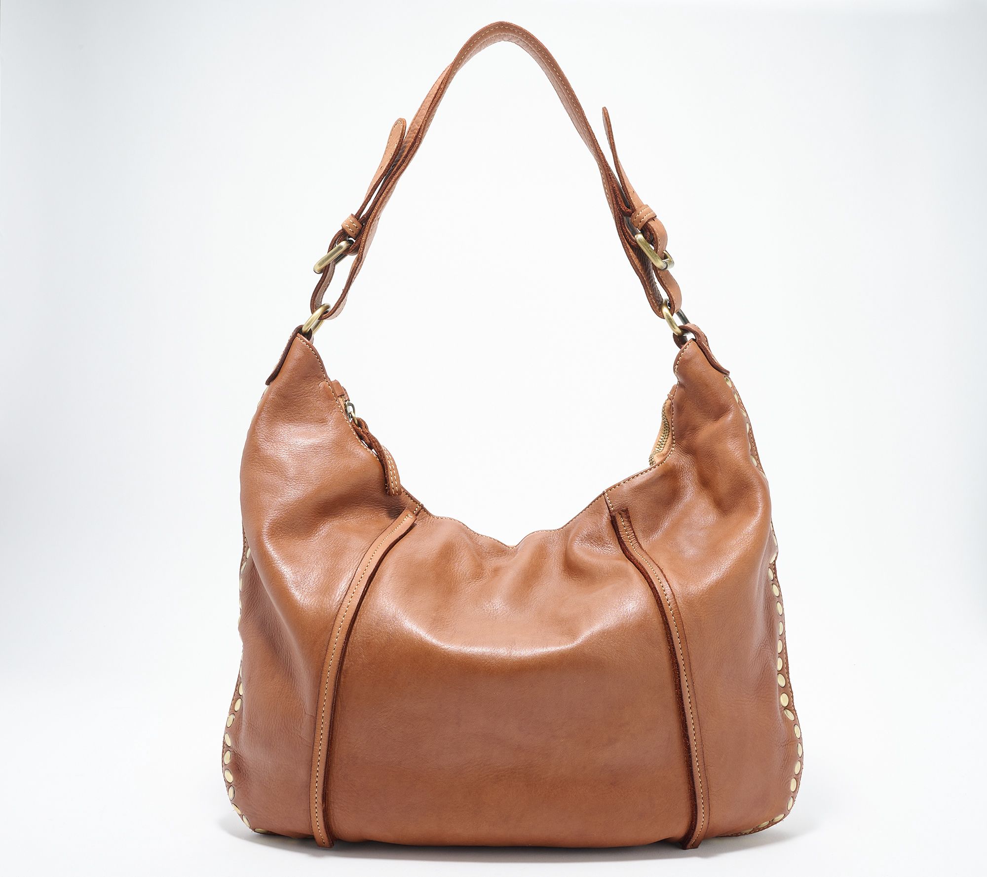 Designed for maximum functionality, the Anna large hobo boasts a roomy interior with a main zippered compartment, multiple pockets, and an adjustable/removable crossbody strap for versatile carrying options. Crafted from luxurious genuine leather, the classic design boasts studded details along side seams for subtle texture and refined detail. From Bolsa Nova.