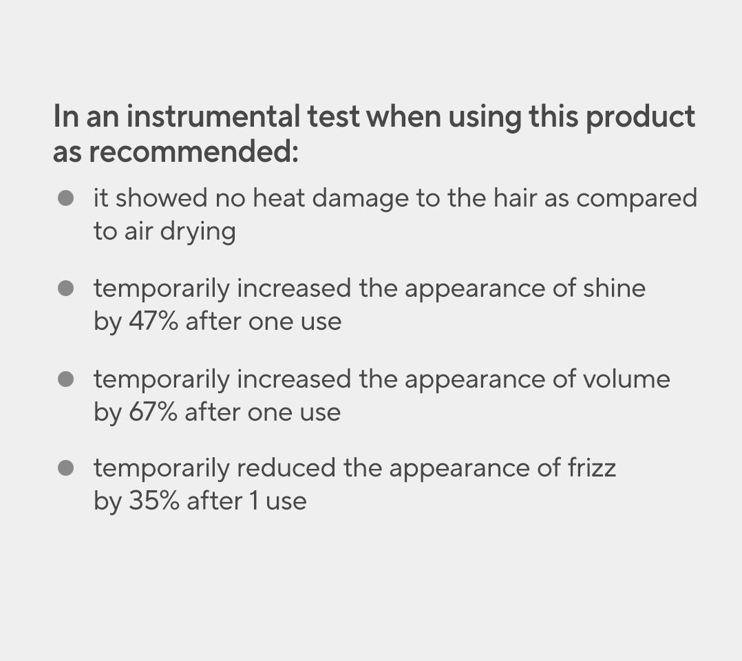 In an instrumental test when using this product as recommended, -- temporarily increased the appearance of shine by 47% after one use -- temporarily increased the appearance of volume by 67% after one use -- shows no heat damage to the hair as compared to air drying -- shows to temporarily reduce the appearance of frizz by 35% after one use -- temporarily increased the look of volume by 64% 8 hours after use
