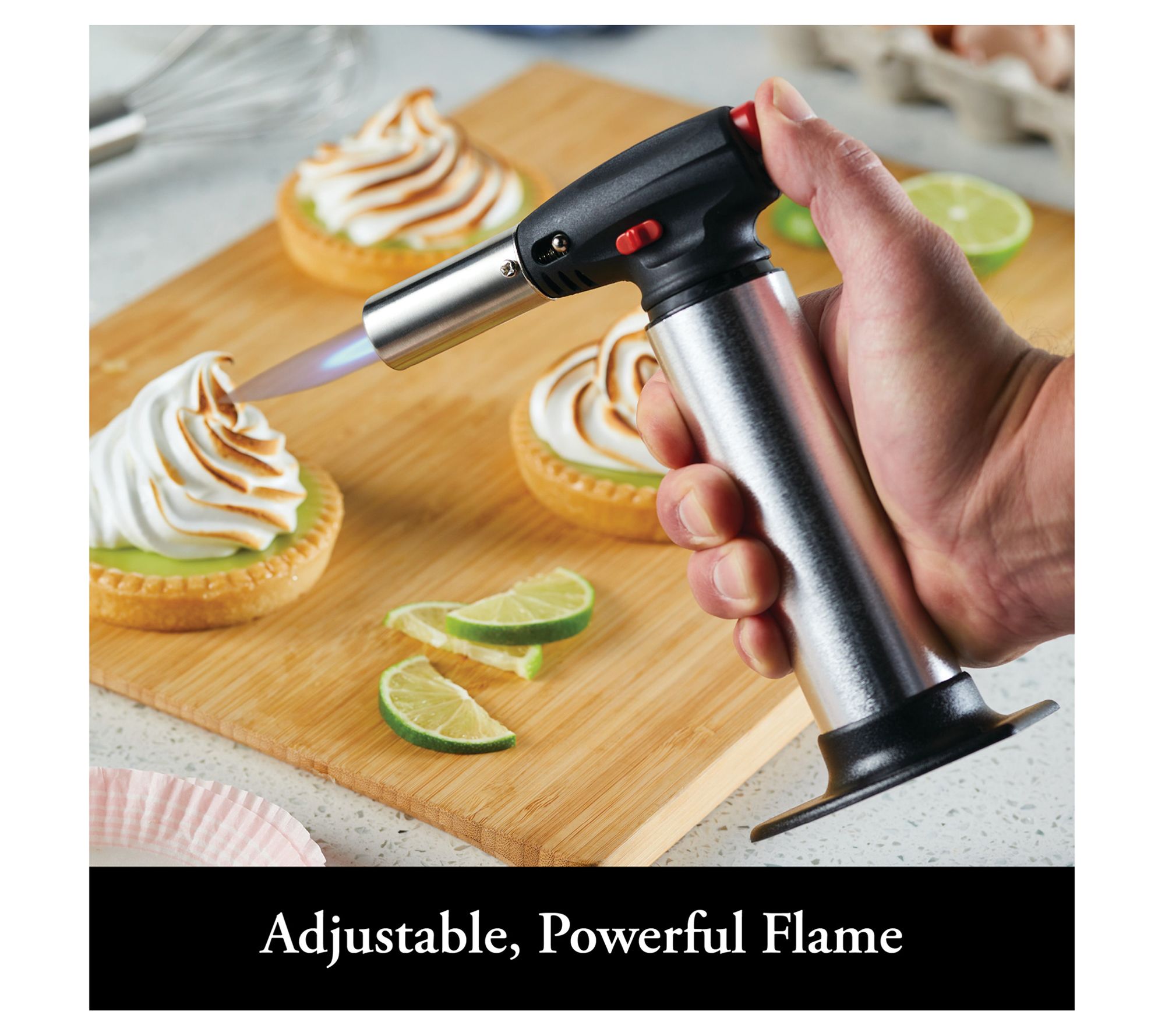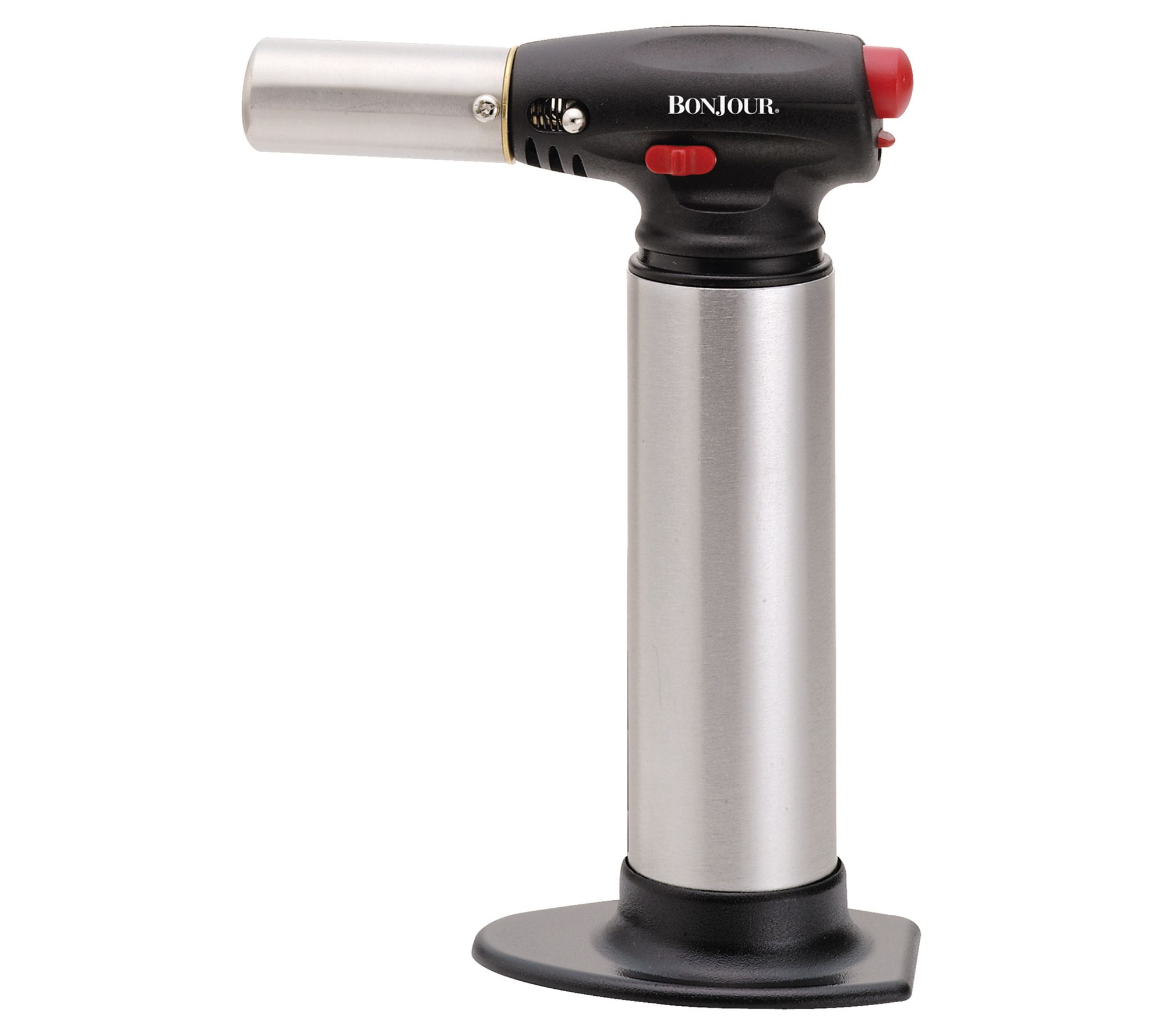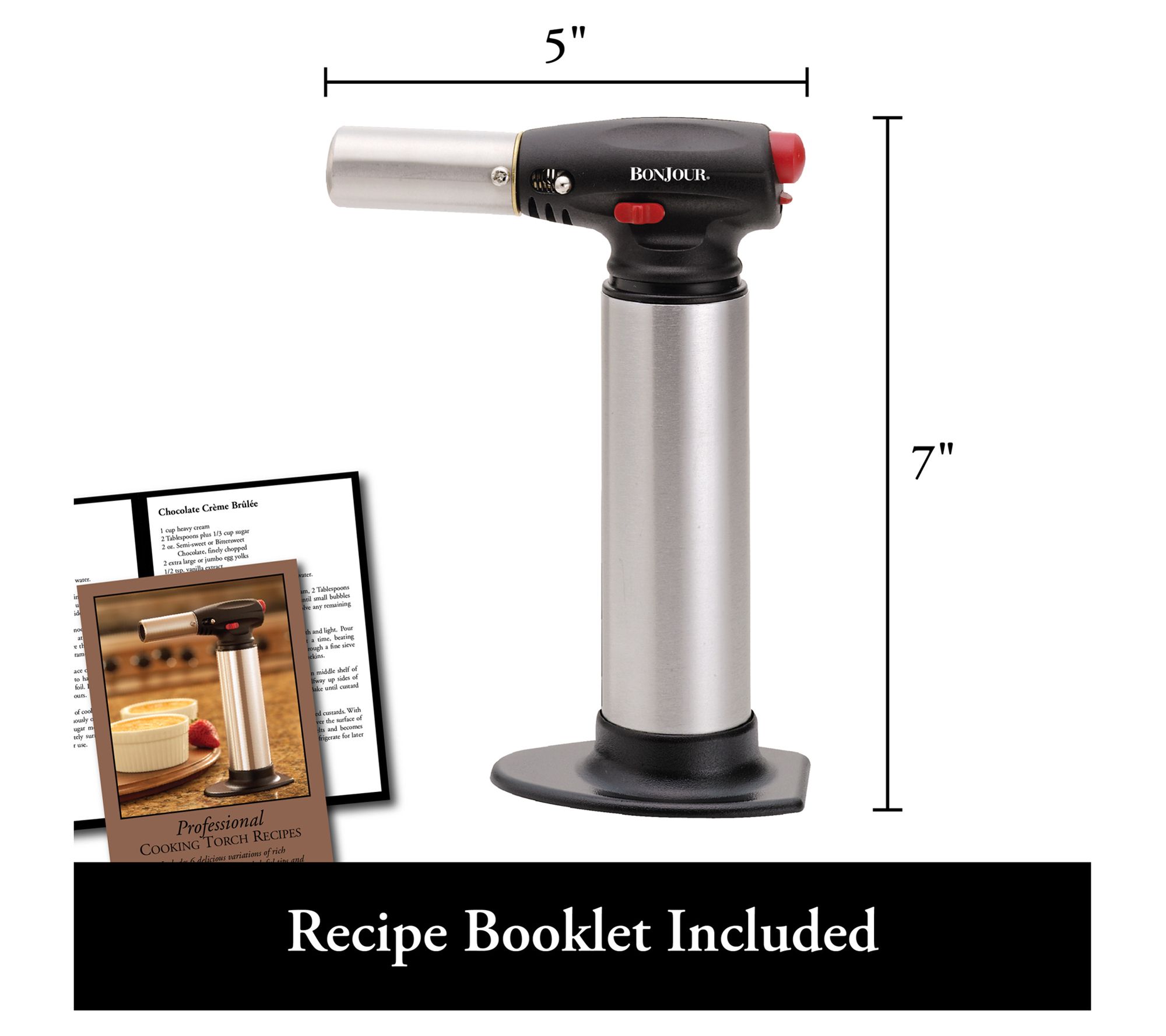 Experience the ultimate versatility in your kitchen with the BonJour Chefs Tools stainless steel butane chef torch. This handy tool is not only essential for preparing classic creme brulee but also perfect for browning meringue, melting cheese on onion soup, and more! From BonJour.
