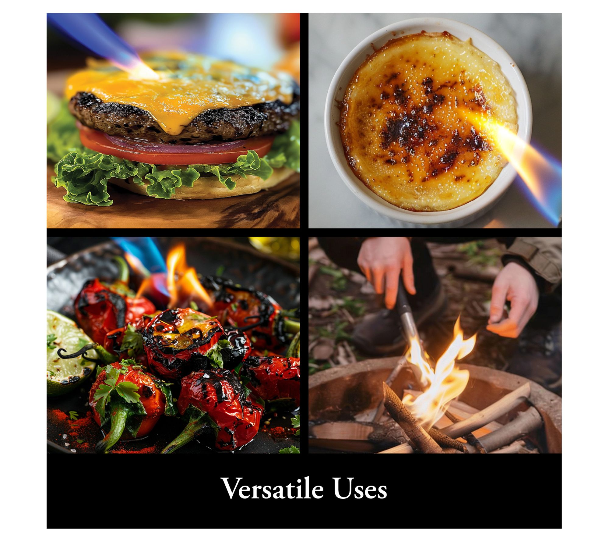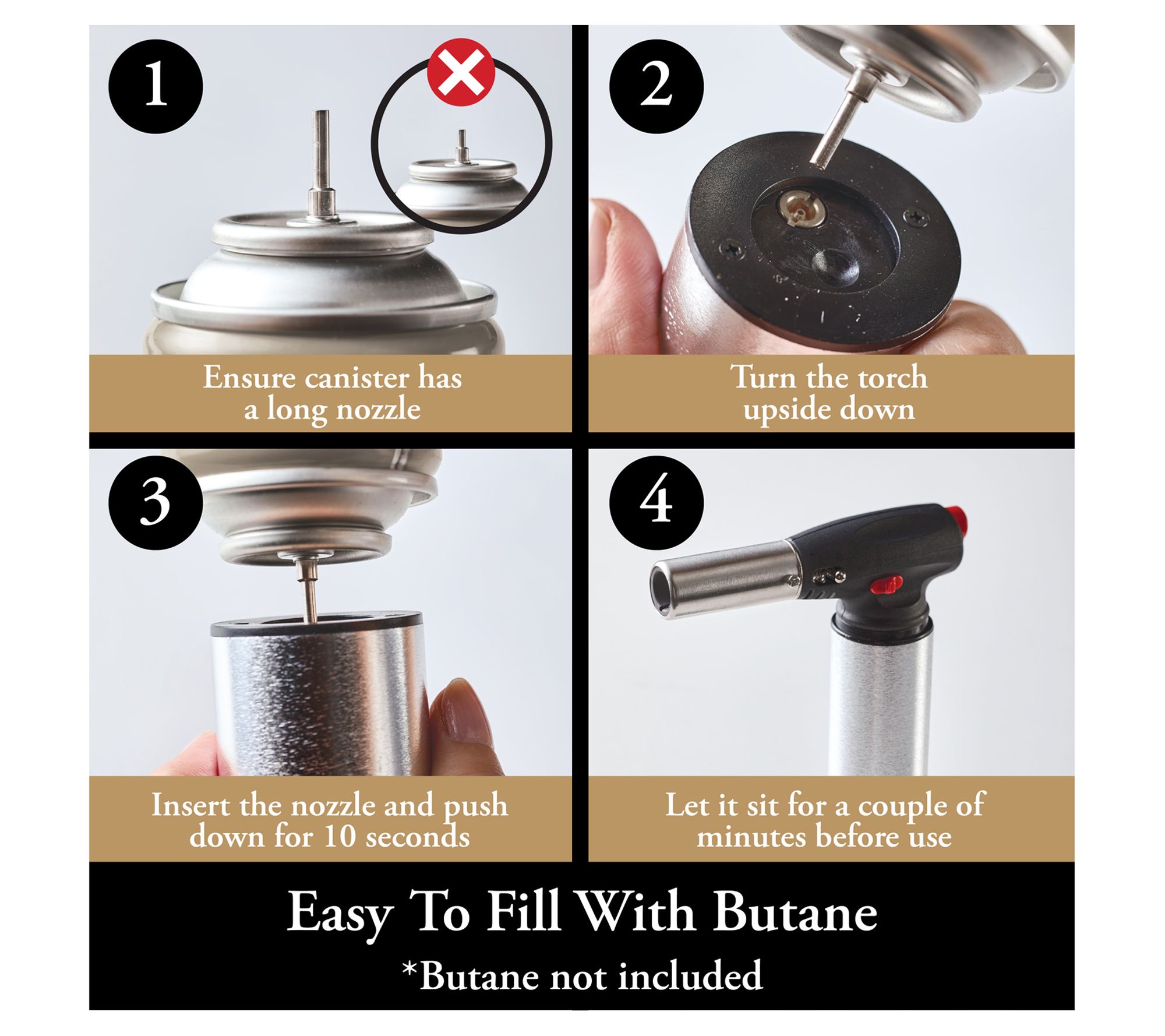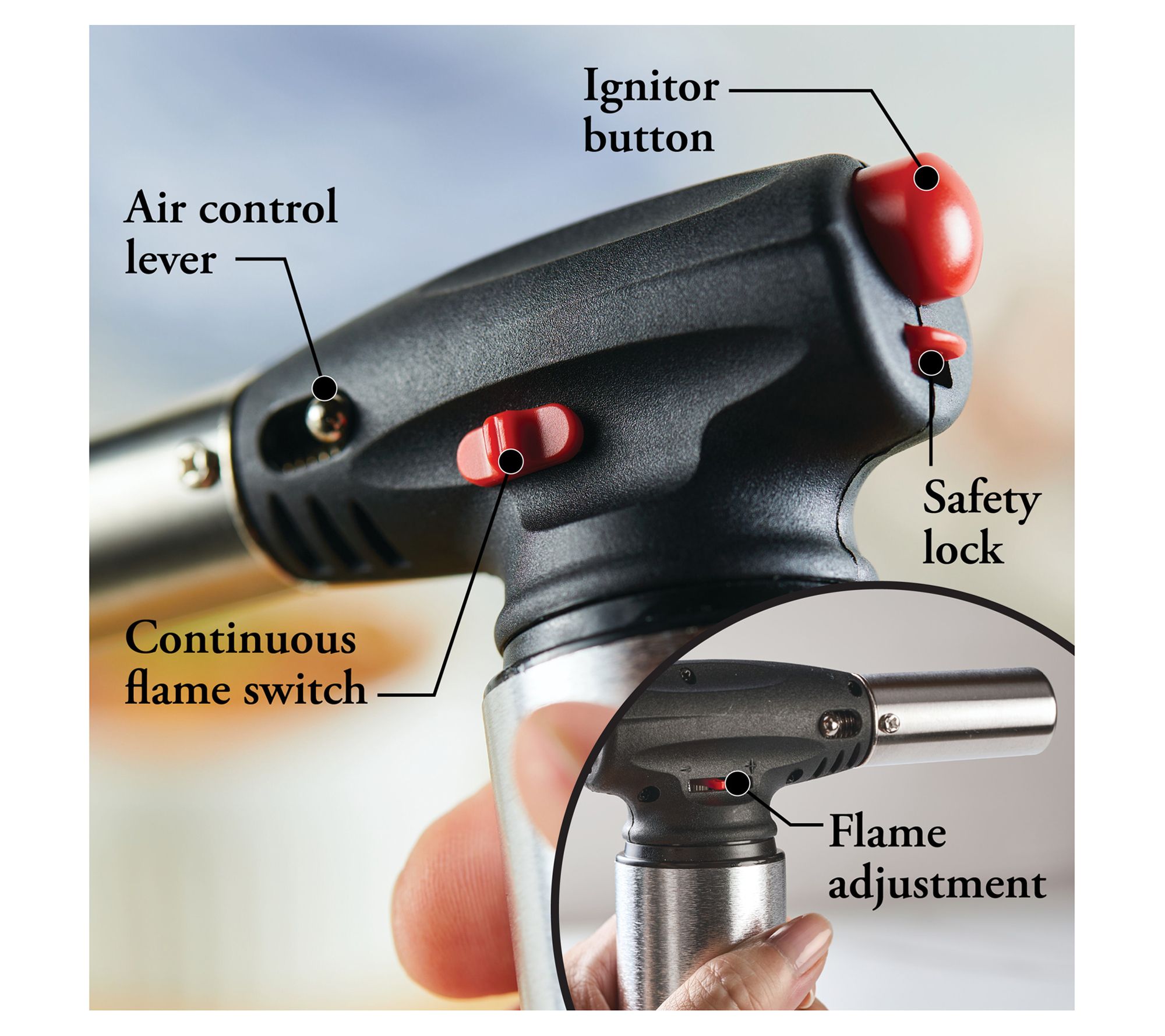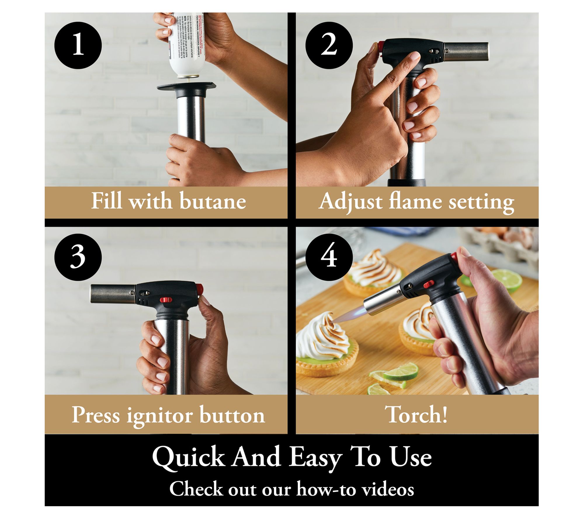 Experience the ultimate versatility in your kitchen with the BonJour Chefs Tools stainless steel butane chef torch. This handy tool is not only essential for preparing classic creme brulee but also perfect for browning meringue, melting cheese on onion soup, and more! From BonJour.