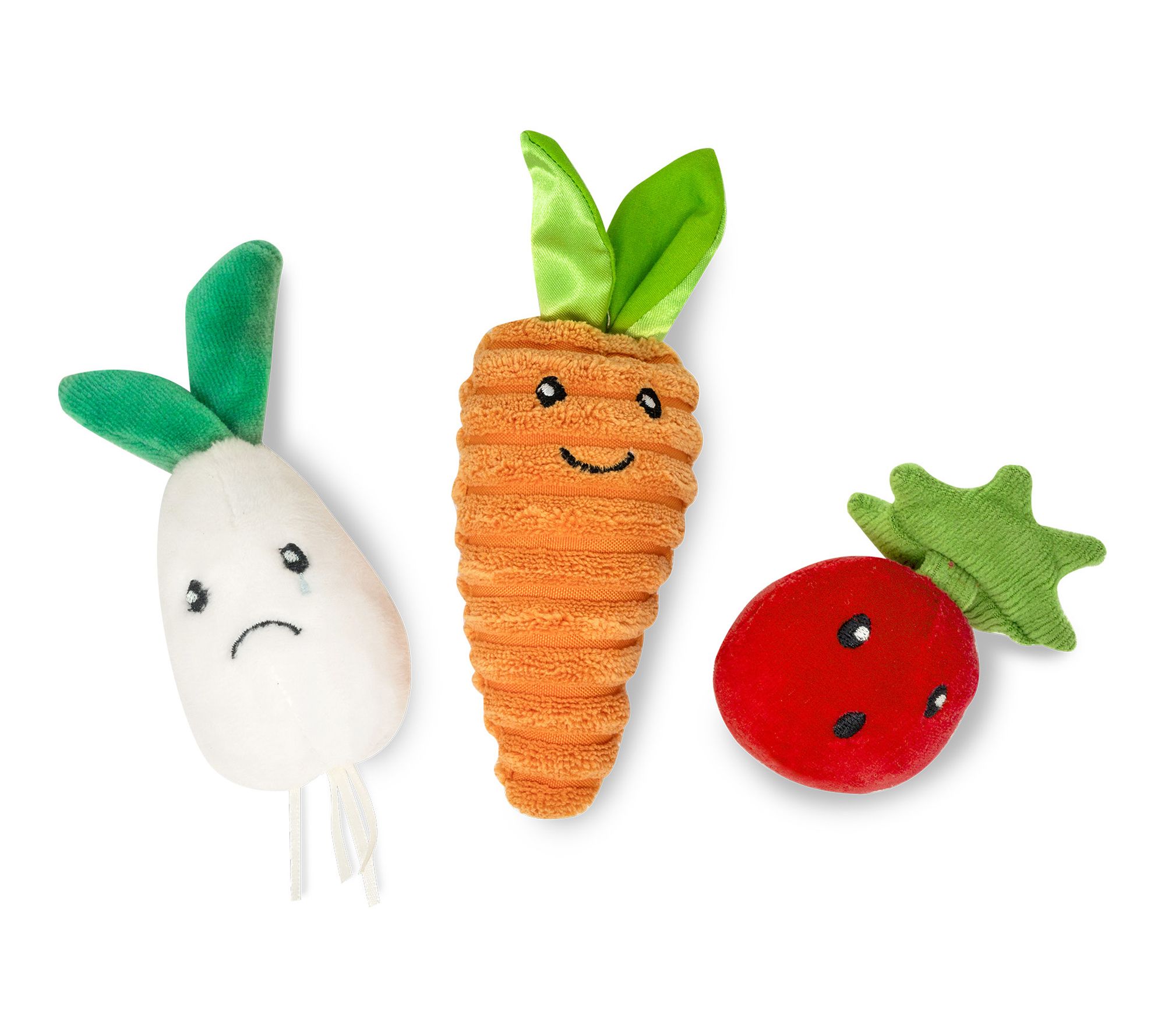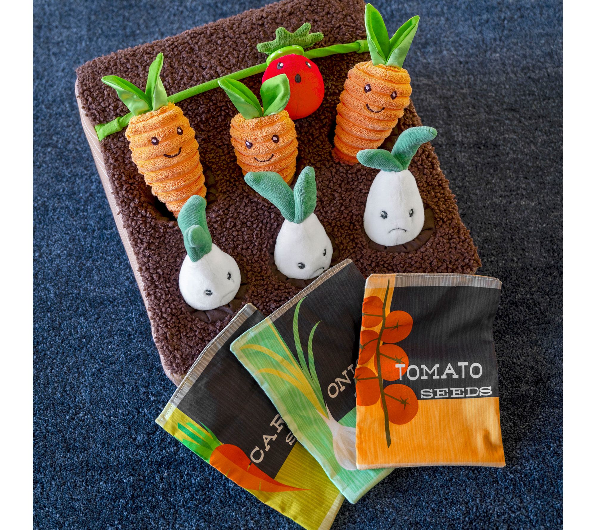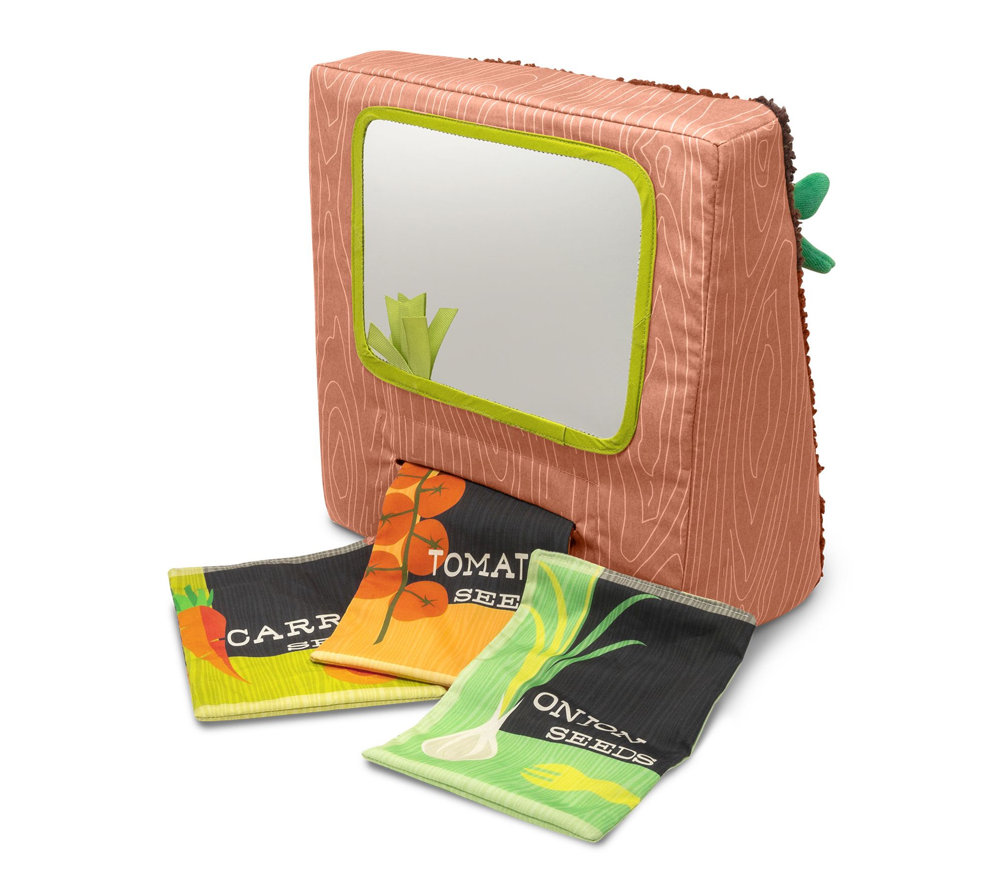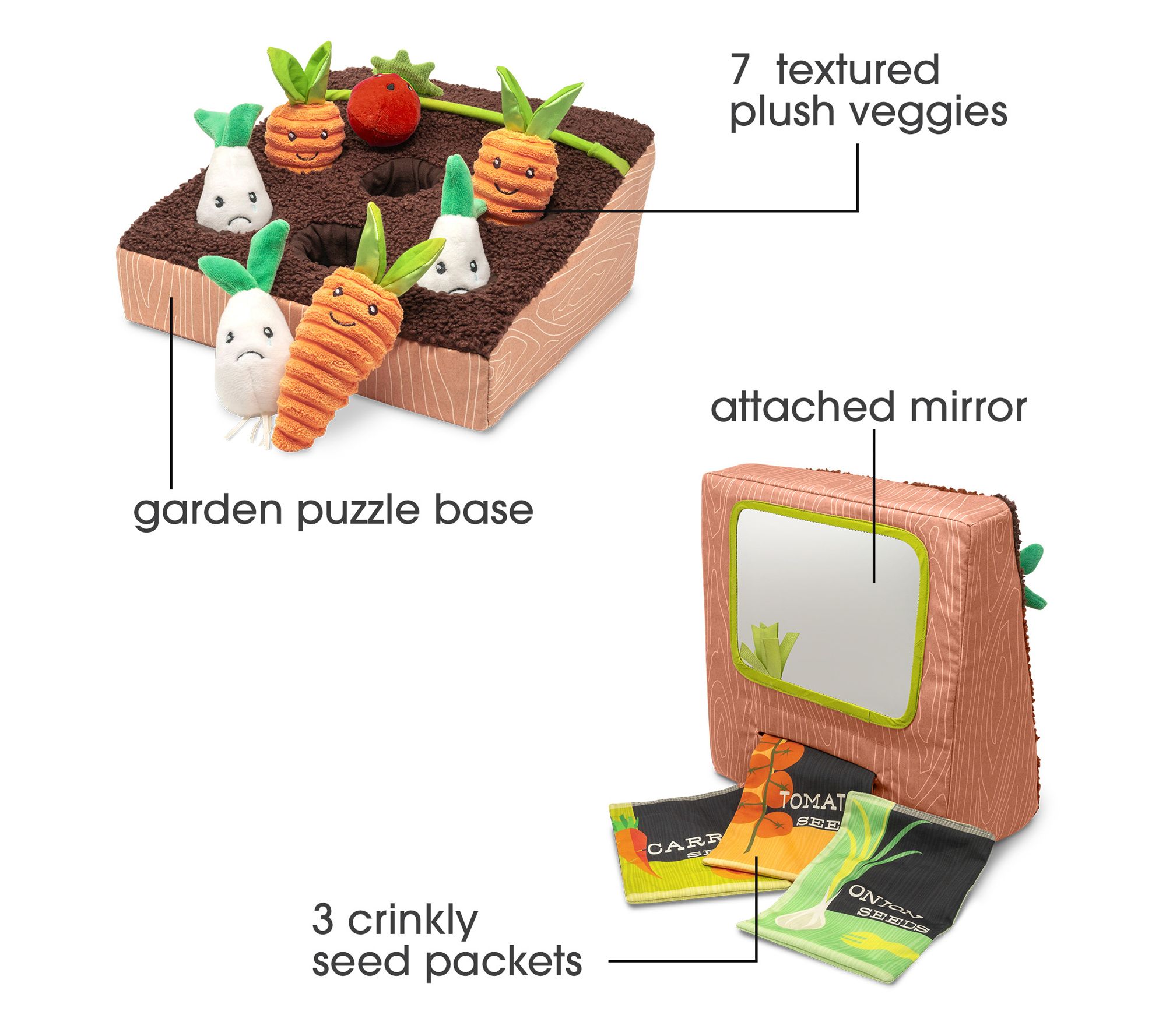 Includes seven plush veggies, three crinkly seed packets, garden puzzle base, and baby mirror