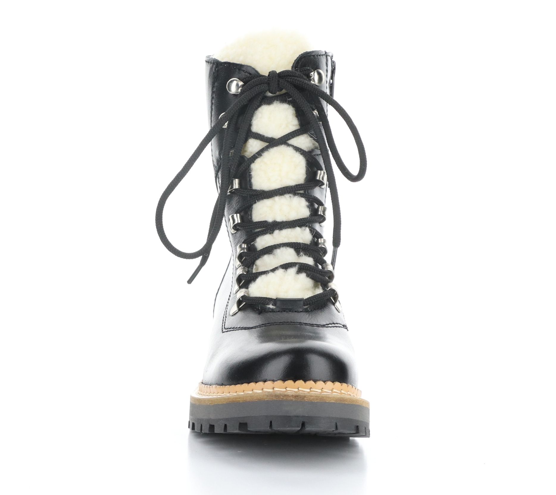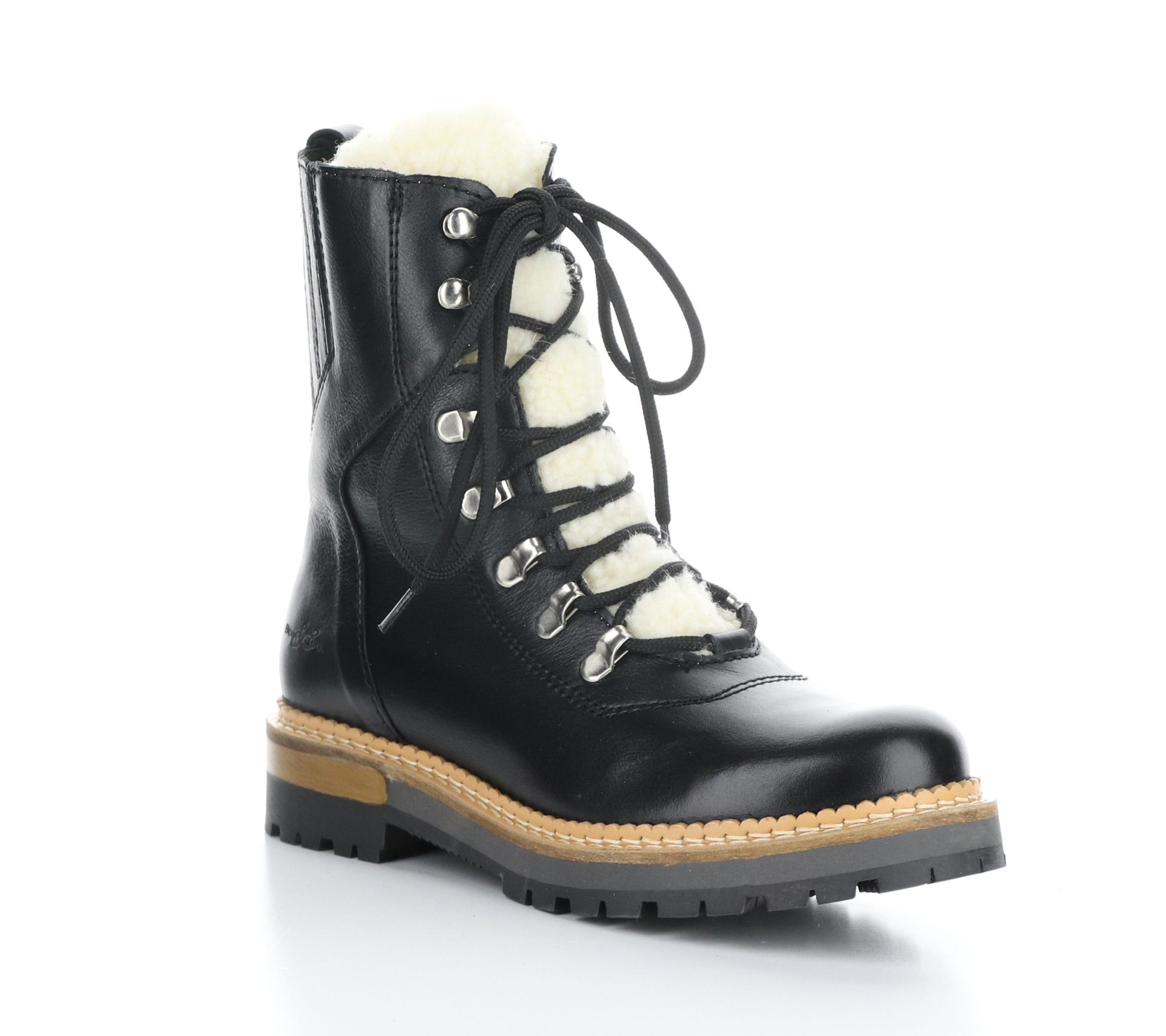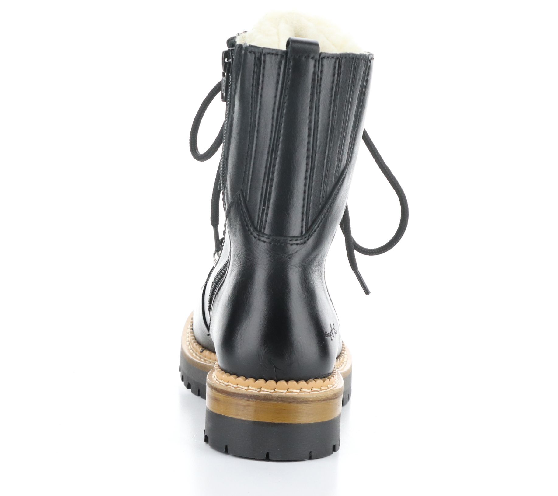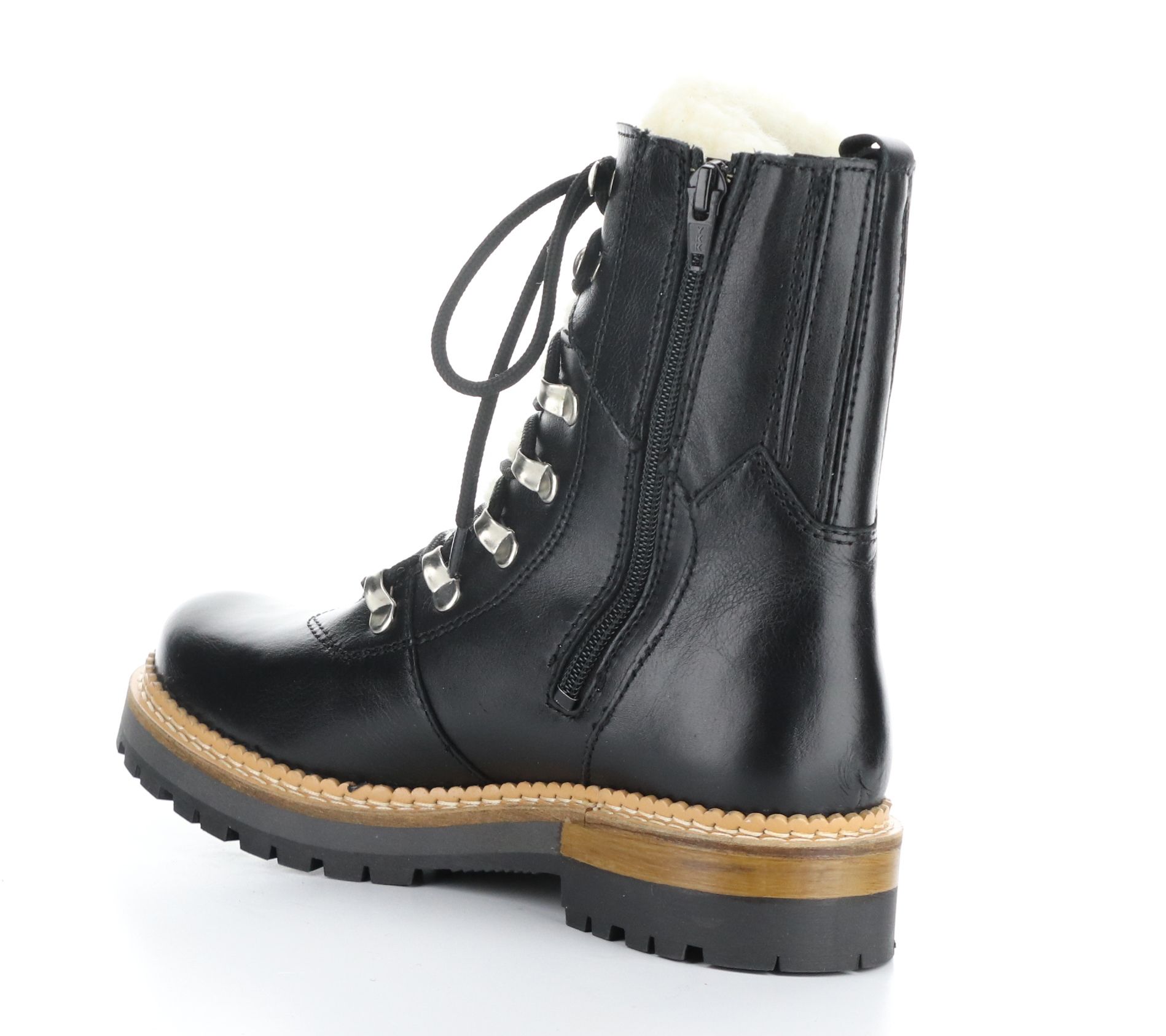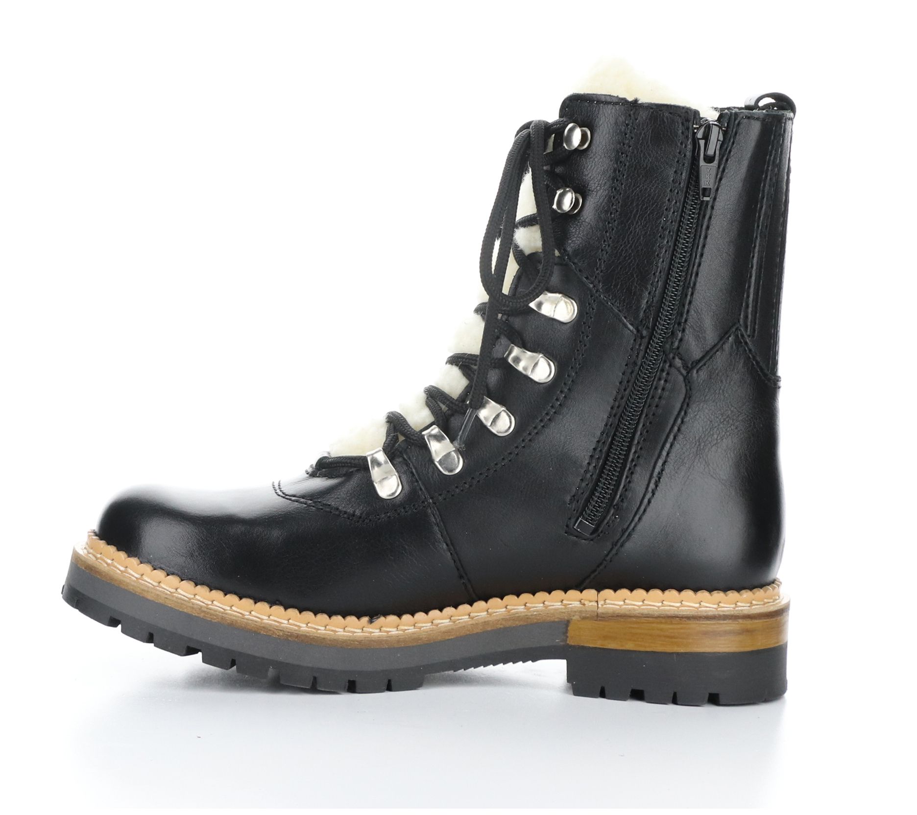 • Side zip and lace-up closures, exposed wool tongue, rounded toe