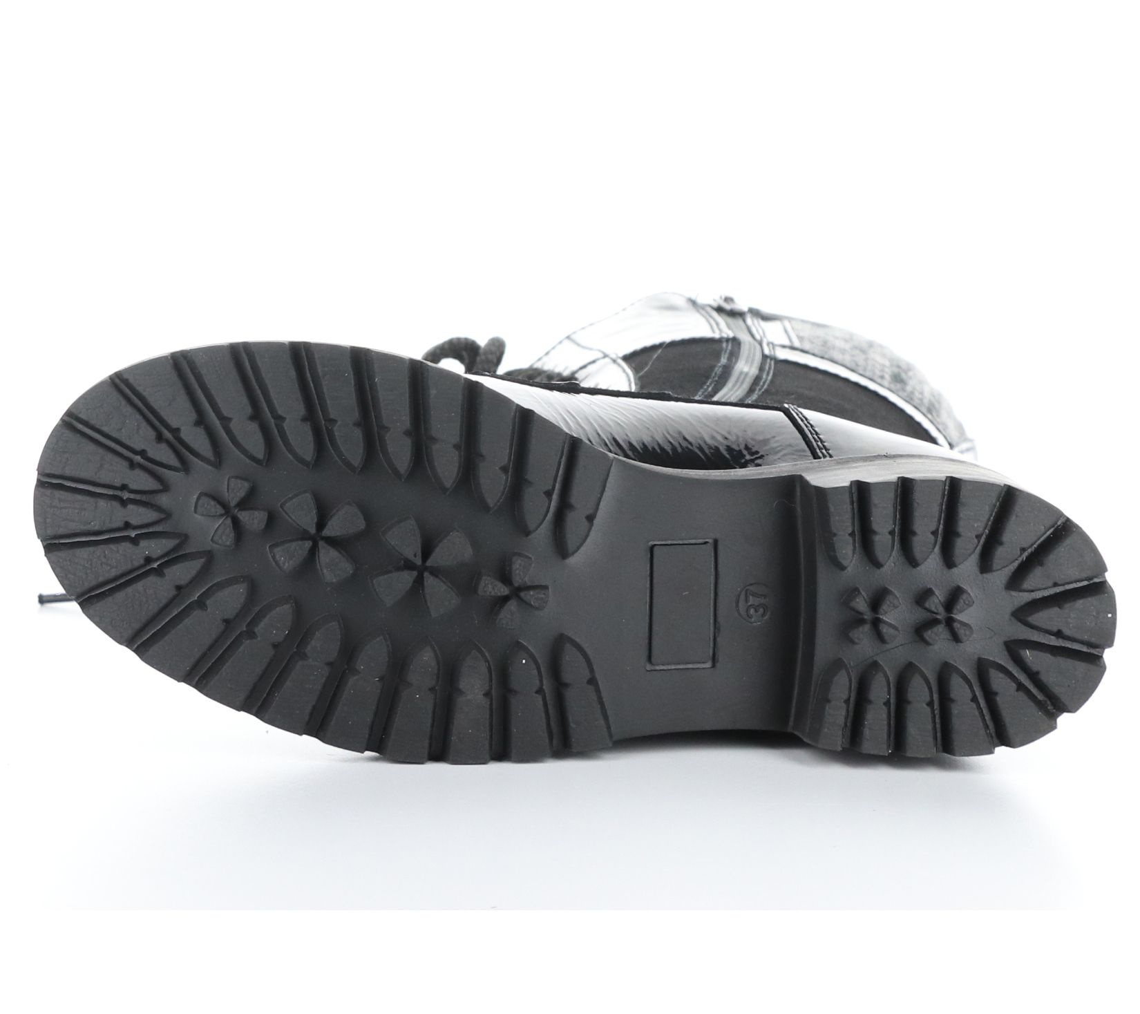 - Cow leather/patent upper; rubber outsole