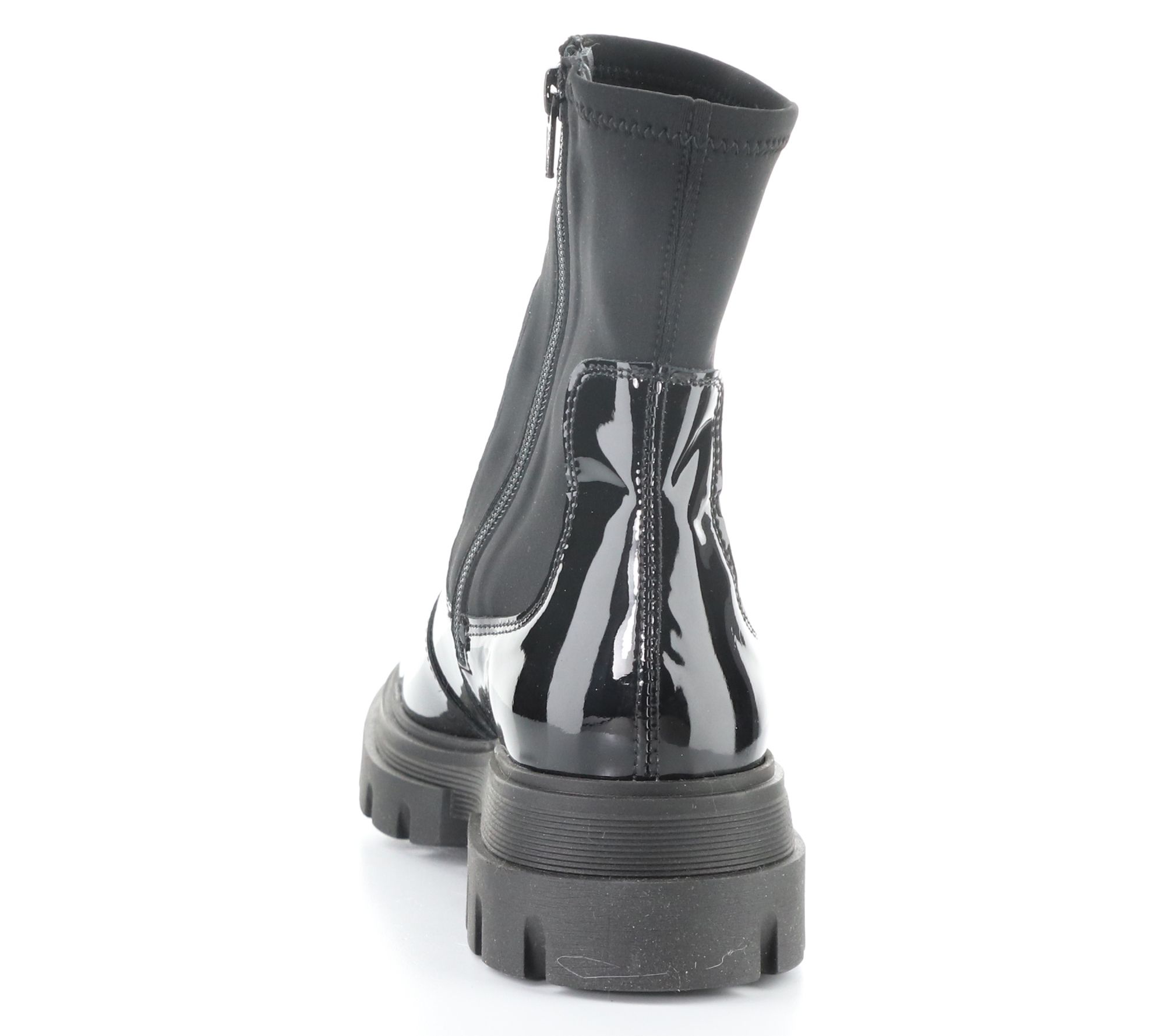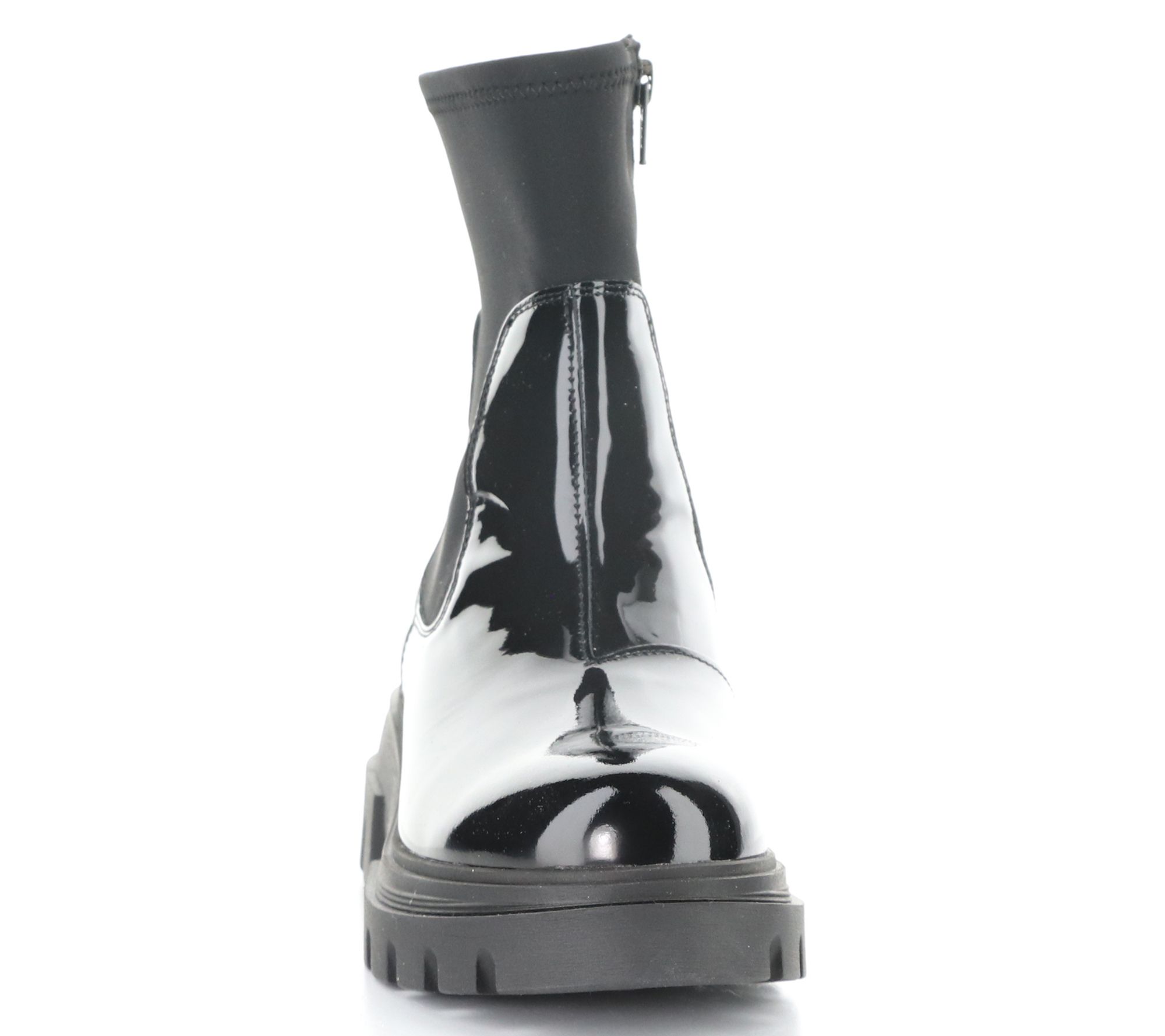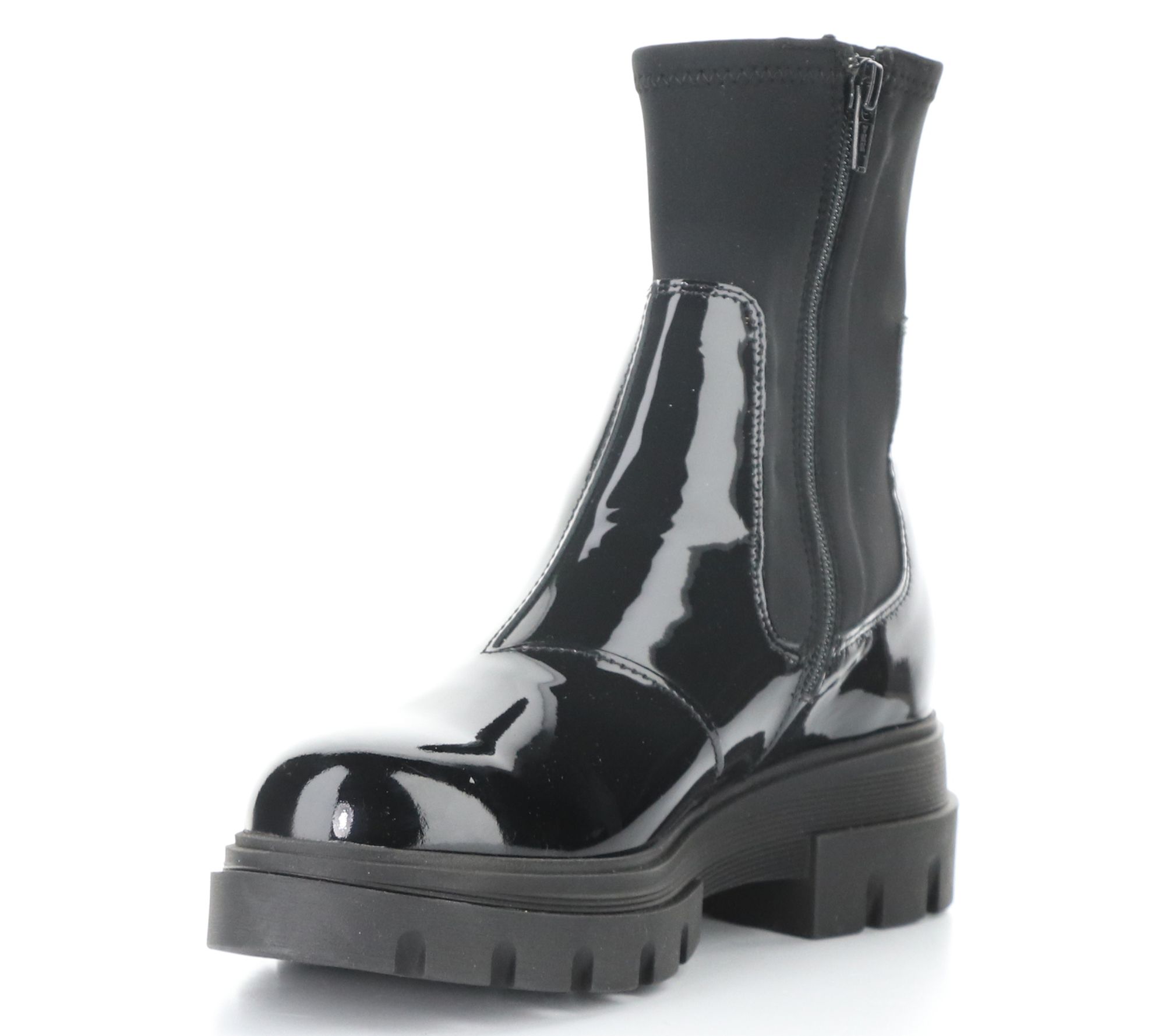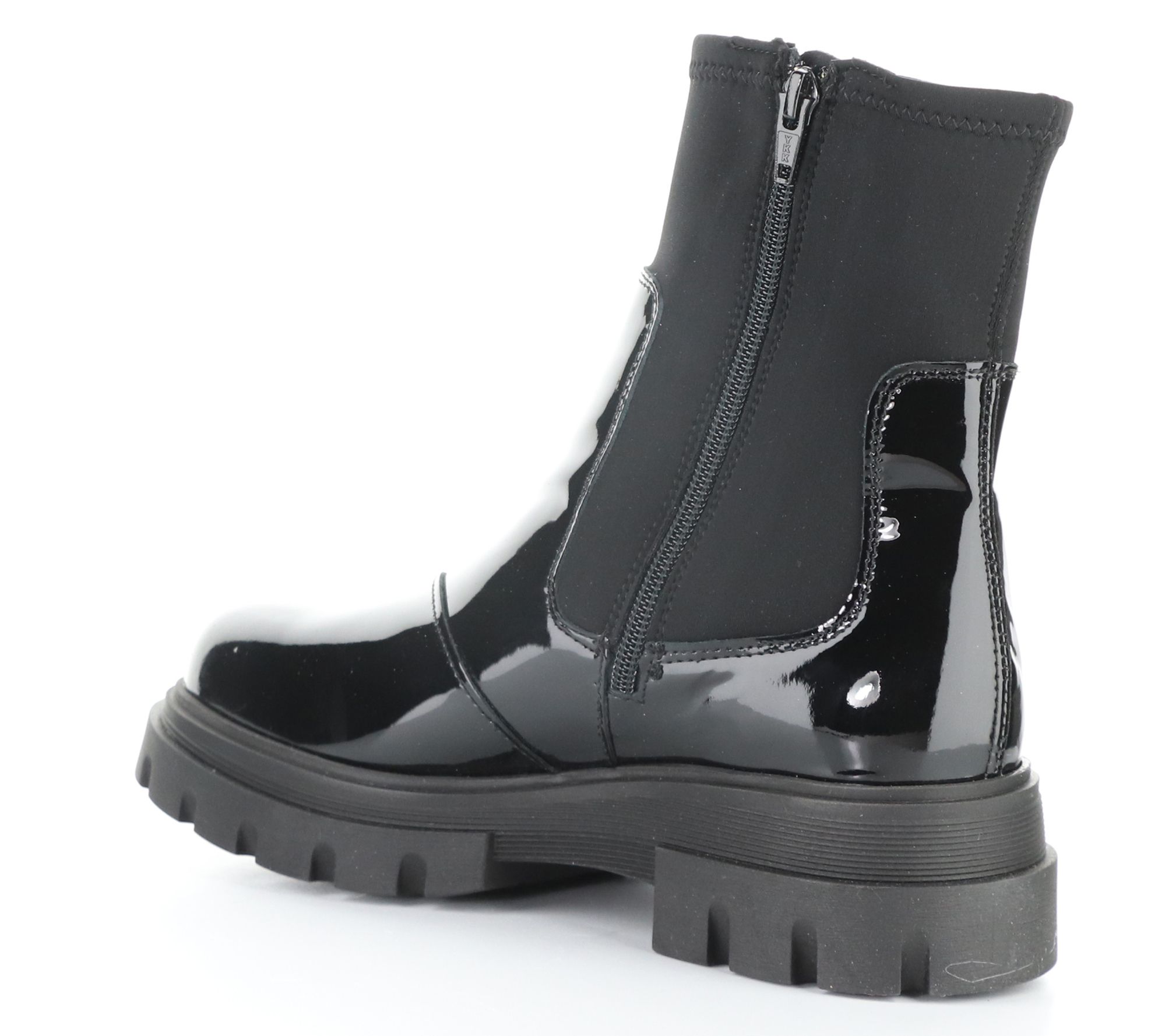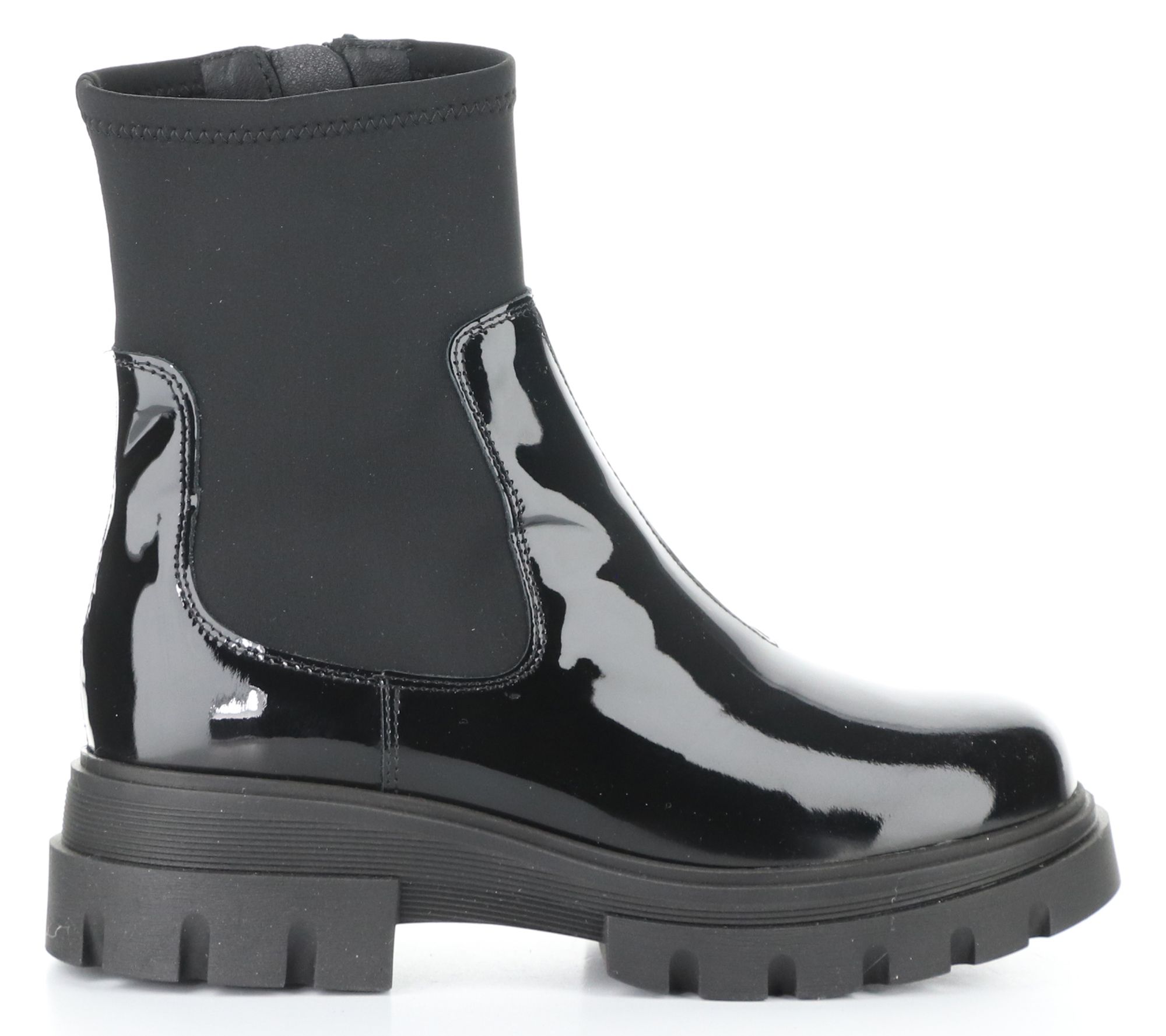Patent and neoprene upper, side zipper, rounded toe