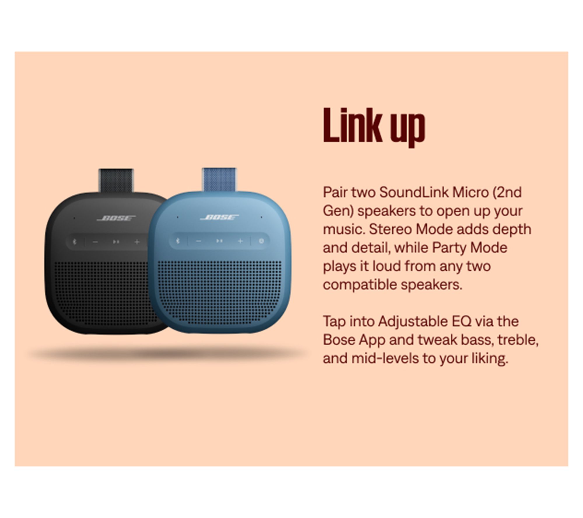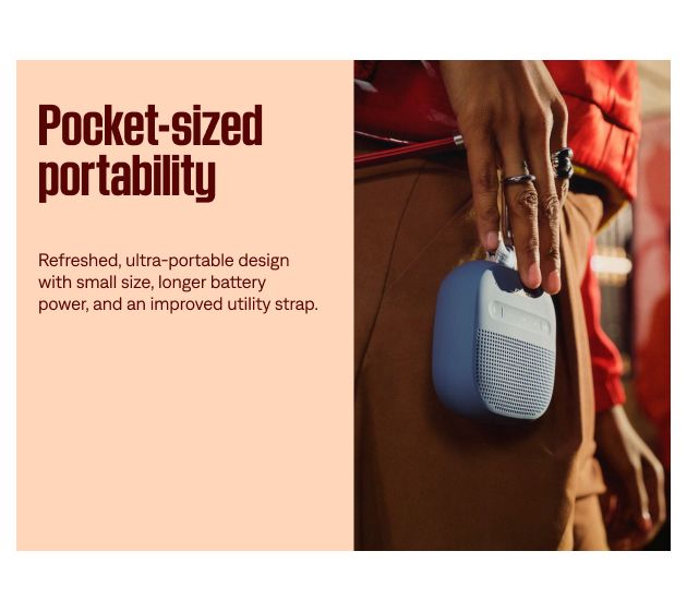 Big sound, small package. The Bose SoundLink micro portable speaker means music (and more) goes anywhere you do. With its compact size and utility strap, this tiny-but-tough Bluetooth speaker can be attached to your belt or bag, placed in a pocket, or played straight from the palm of your hand. Create unforgettable moments at a picnics, parties, or even when you're just relaxing on the patio as it delivers crisp sound and impressive bass. From Bose.