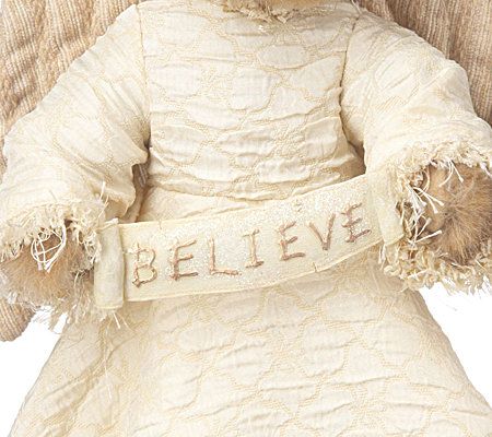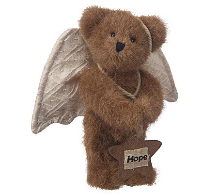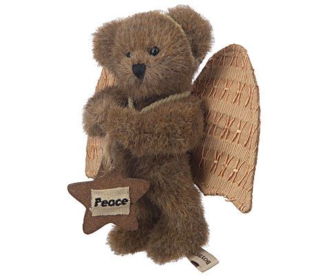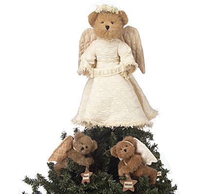 Blessings from above. These adorable bears are sure to fill your tree with heavenly grace. The Celestine tree topper wears a shimmering goldtone sateen fabric gown, has double-quilted wings and a frayed halo, and carries a "Believe" banner. Then, the precious ornaments with fabric wings carry a star bearing messages of "Hope" and "Peace". From Boyds Bears.