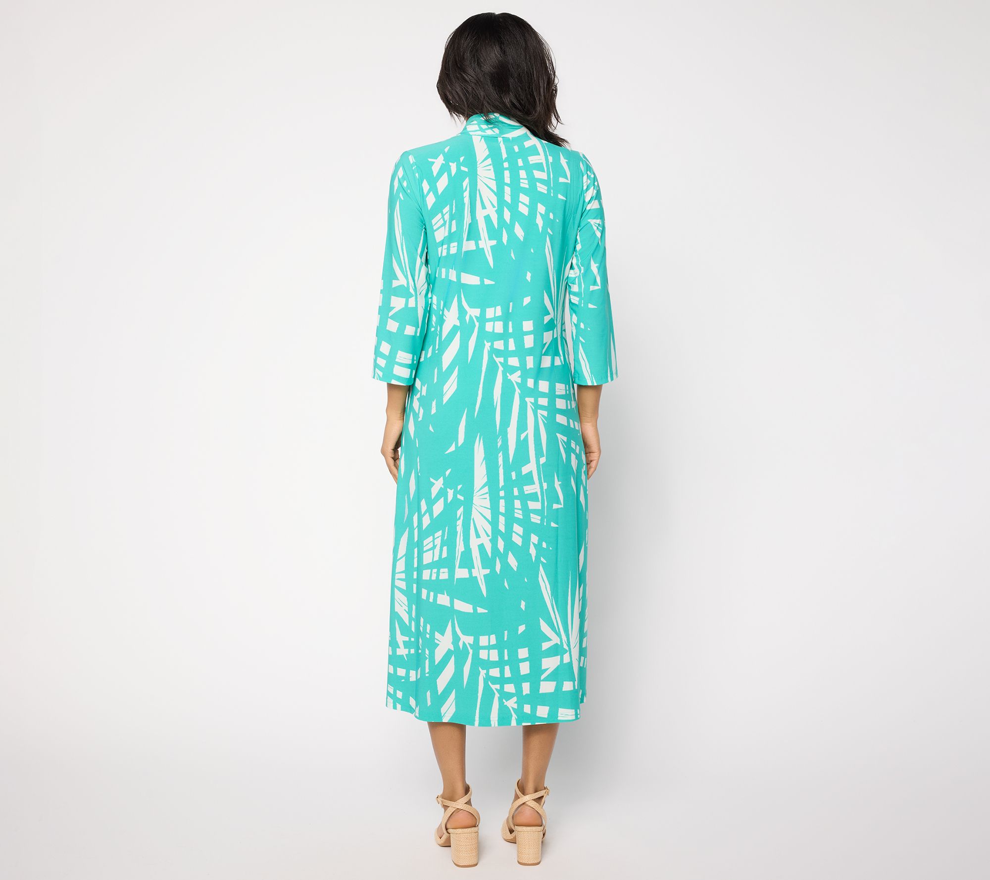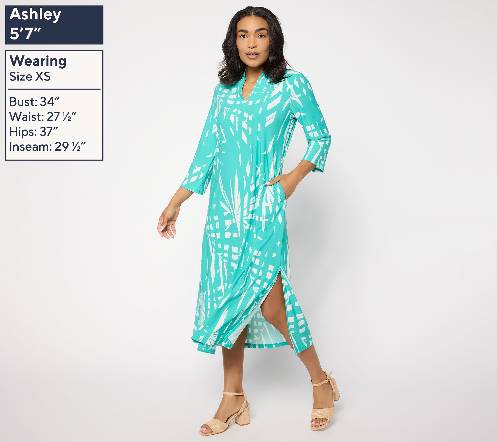 Features: tropical motif, V-neck, 3/4-length sleeves, midi dress, straight hem, side slits