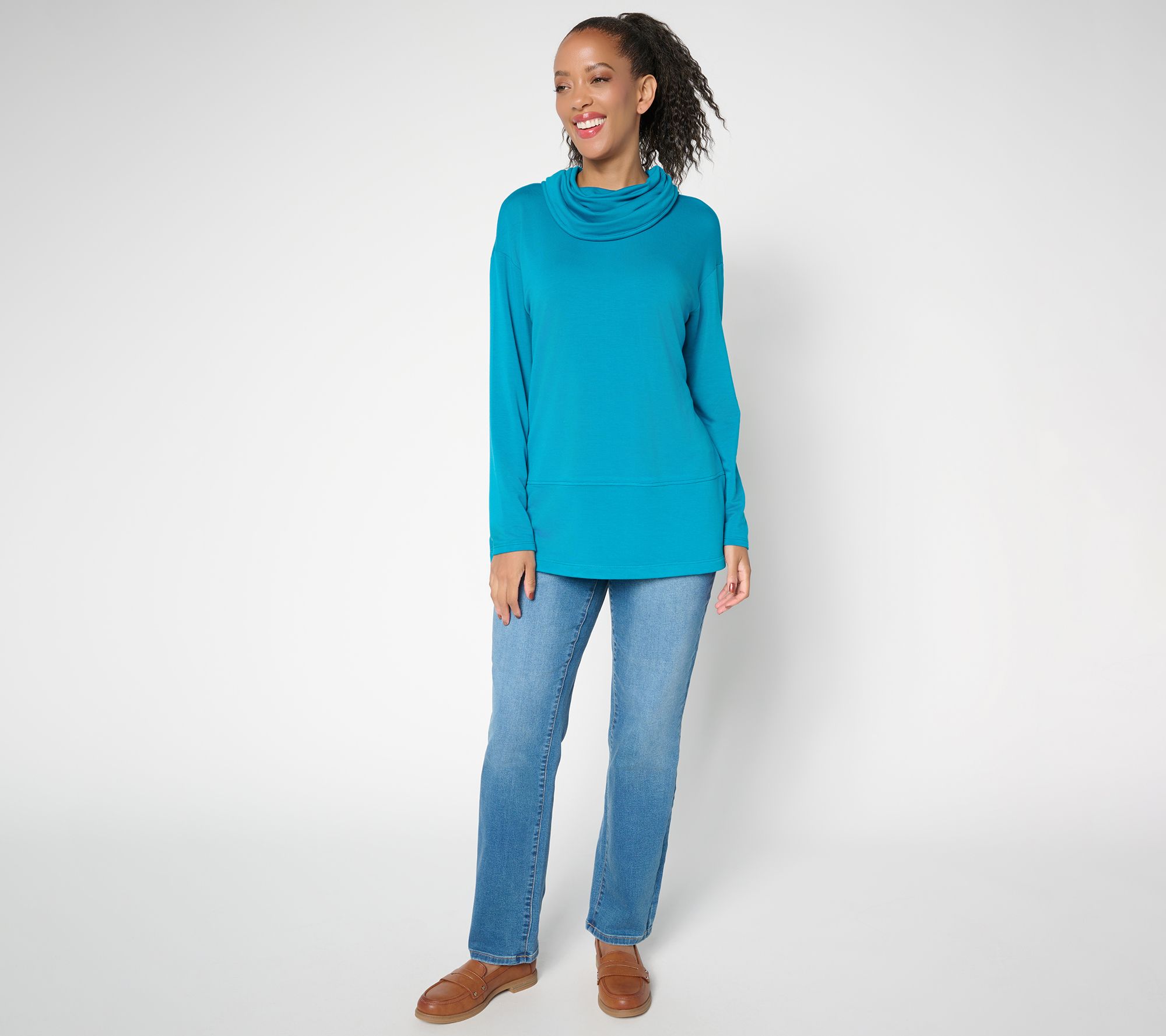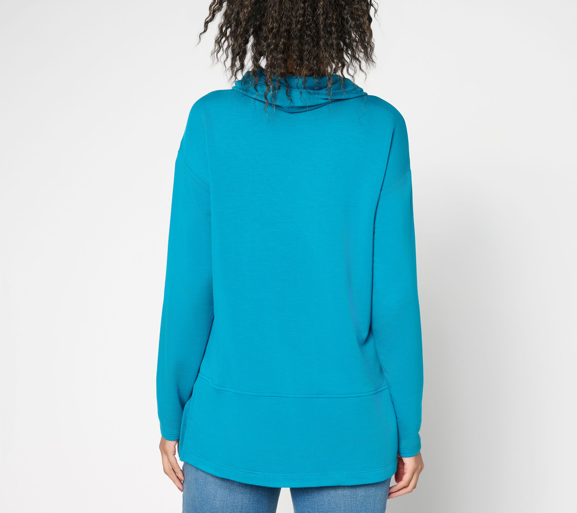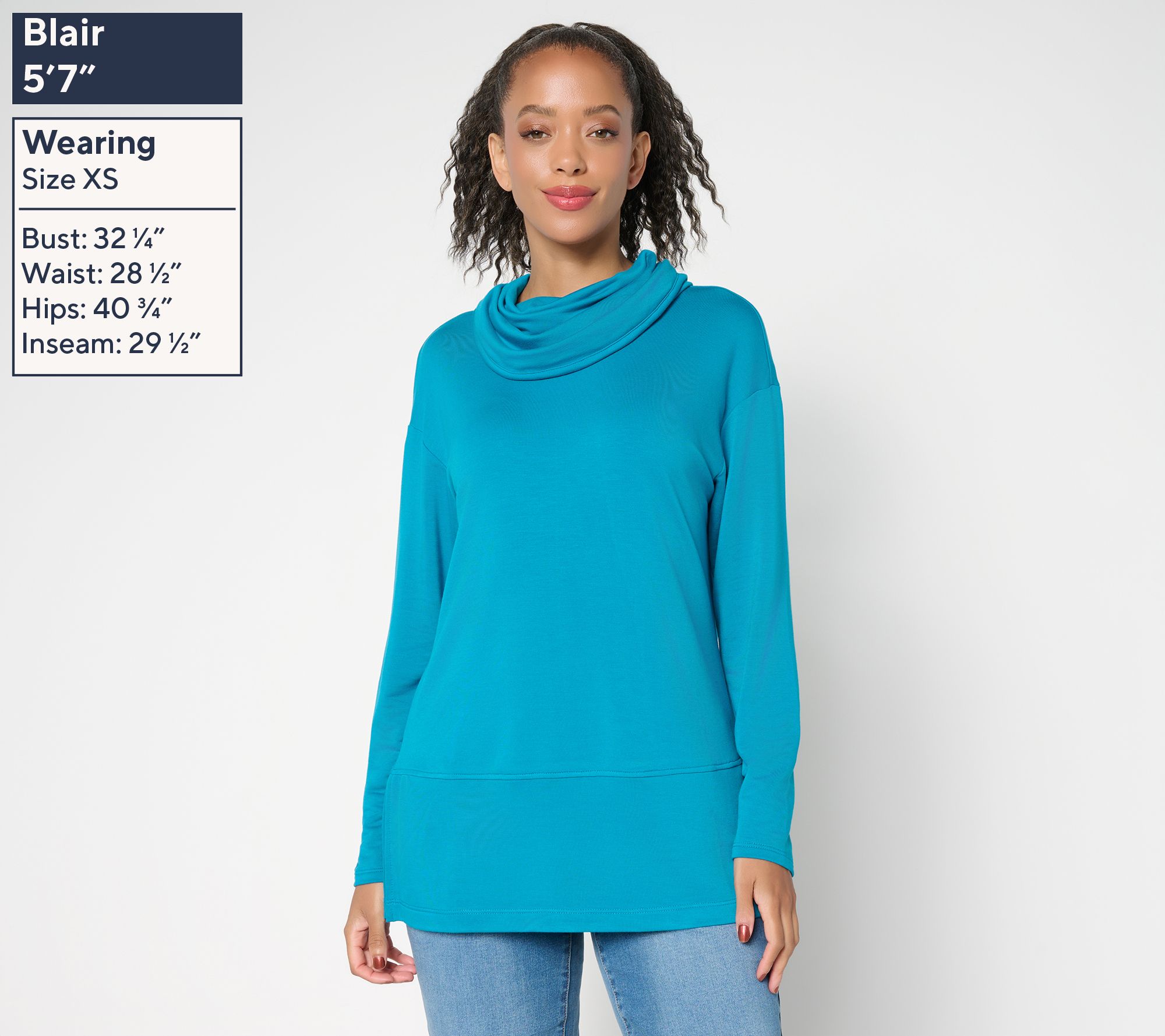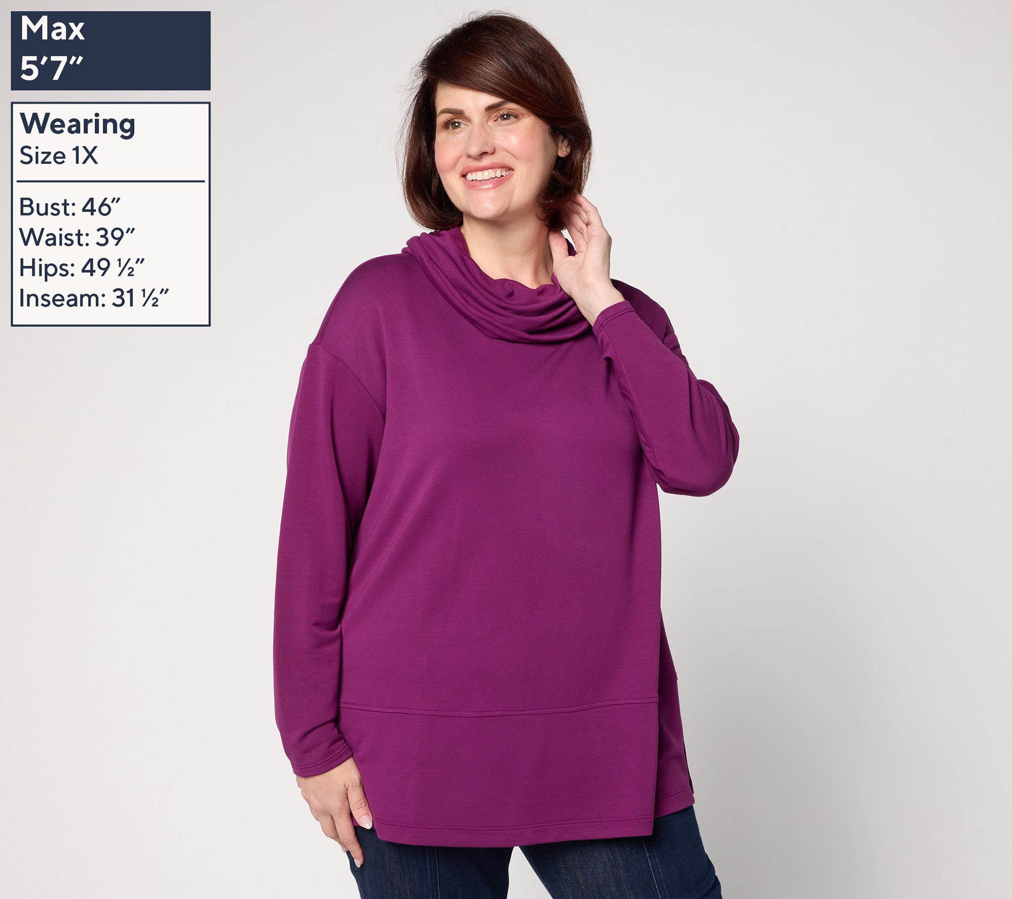 Casual days and cozy evenings call for this knit tunic, complete with modern seaming and a soft turtleneck for extra warmth. Drop shoulders and generous side slits let you move freely, whether you're headed out for errand runs or unwinding at home in leggings. From Brandis Dress Out Loud.