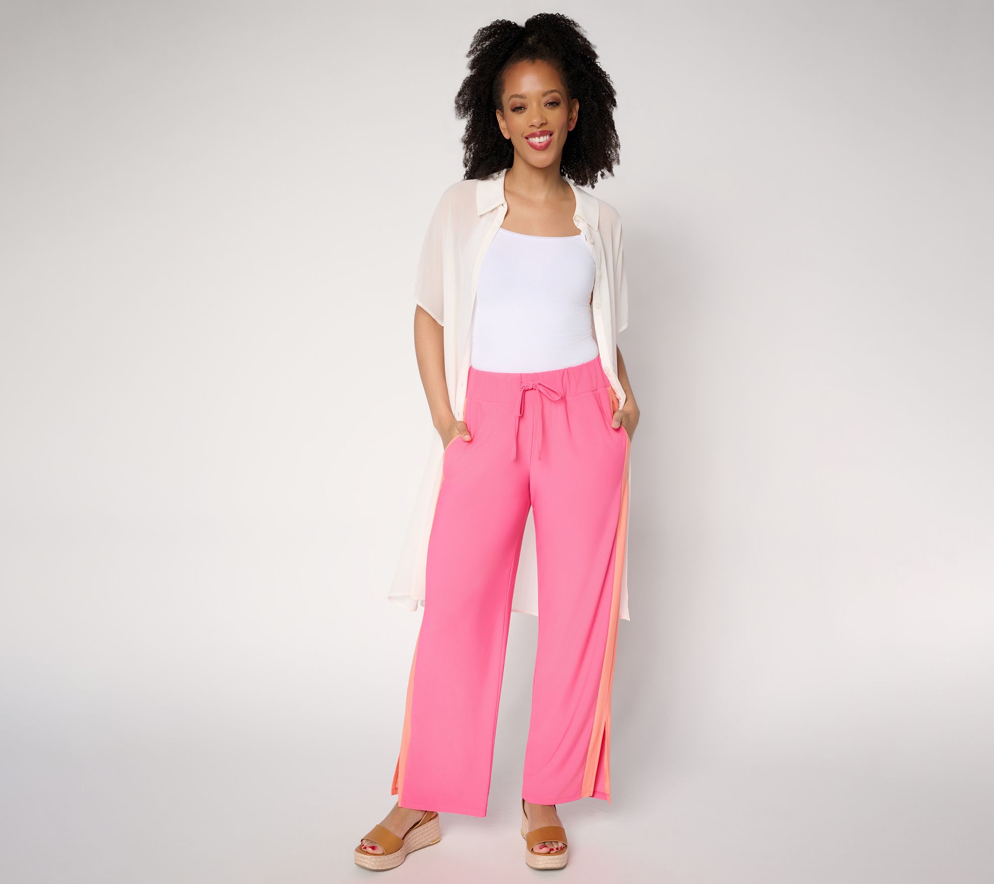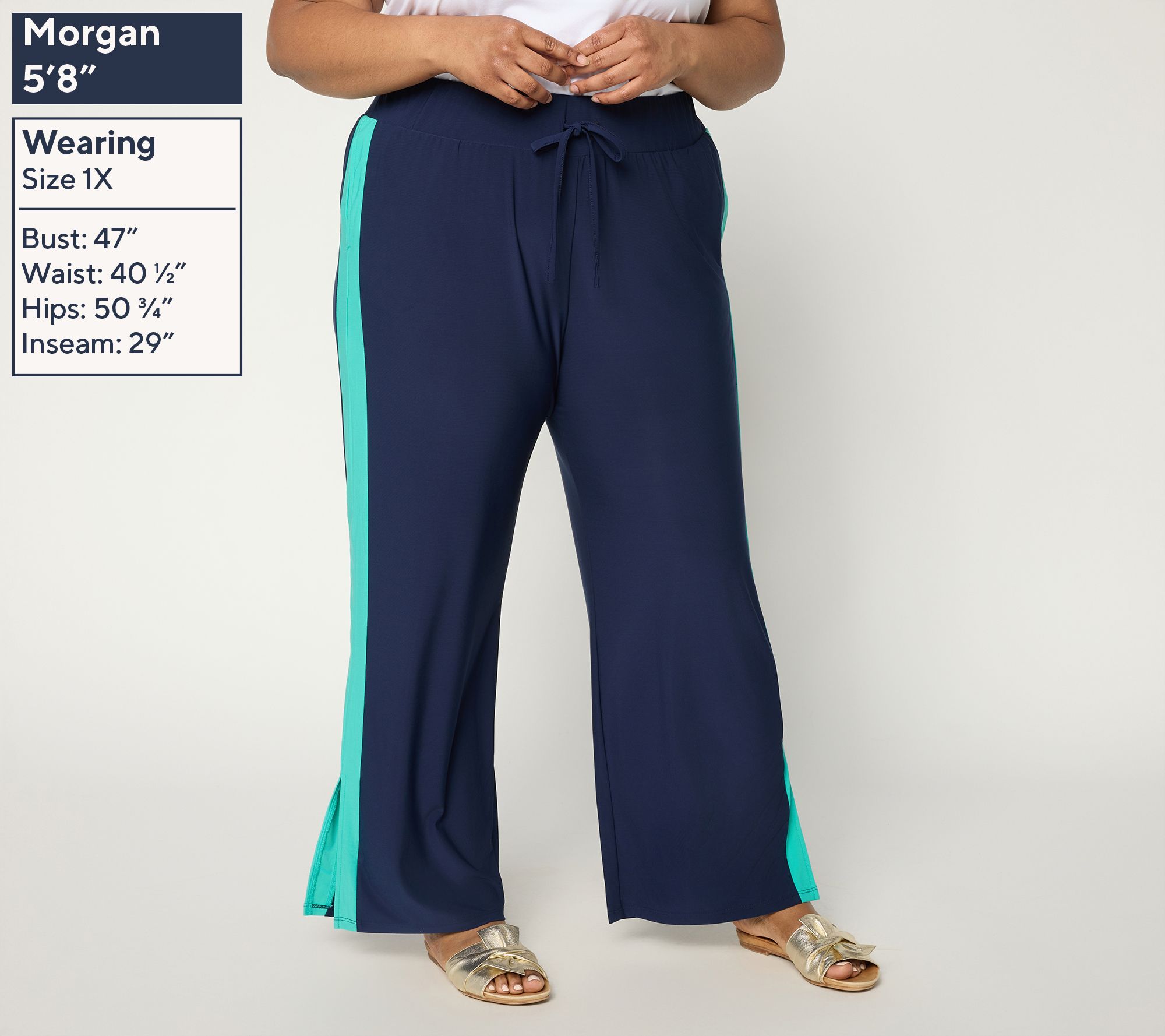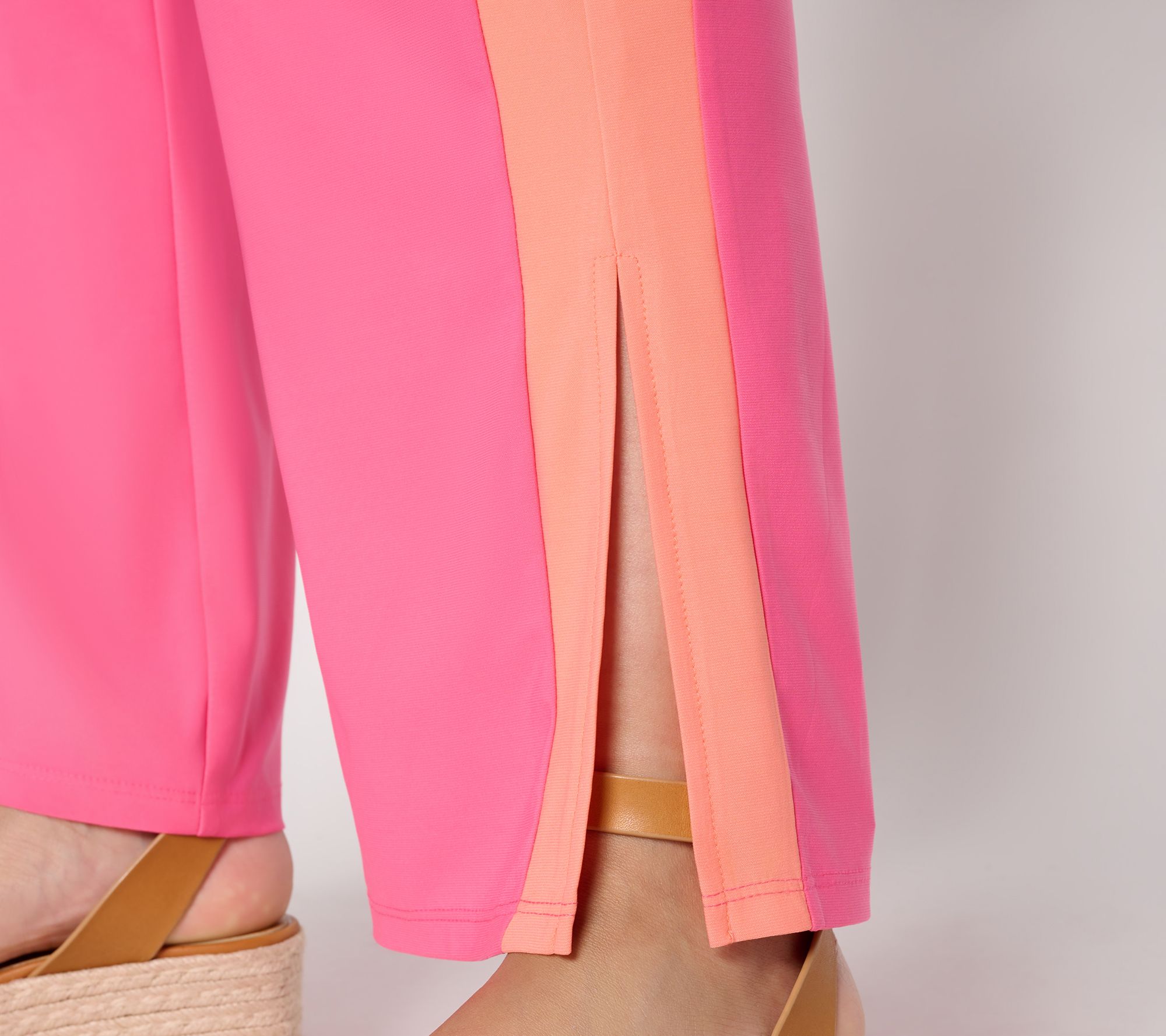 Features: color blocked, pull-on style, elastic waistband, full length, side hem slits