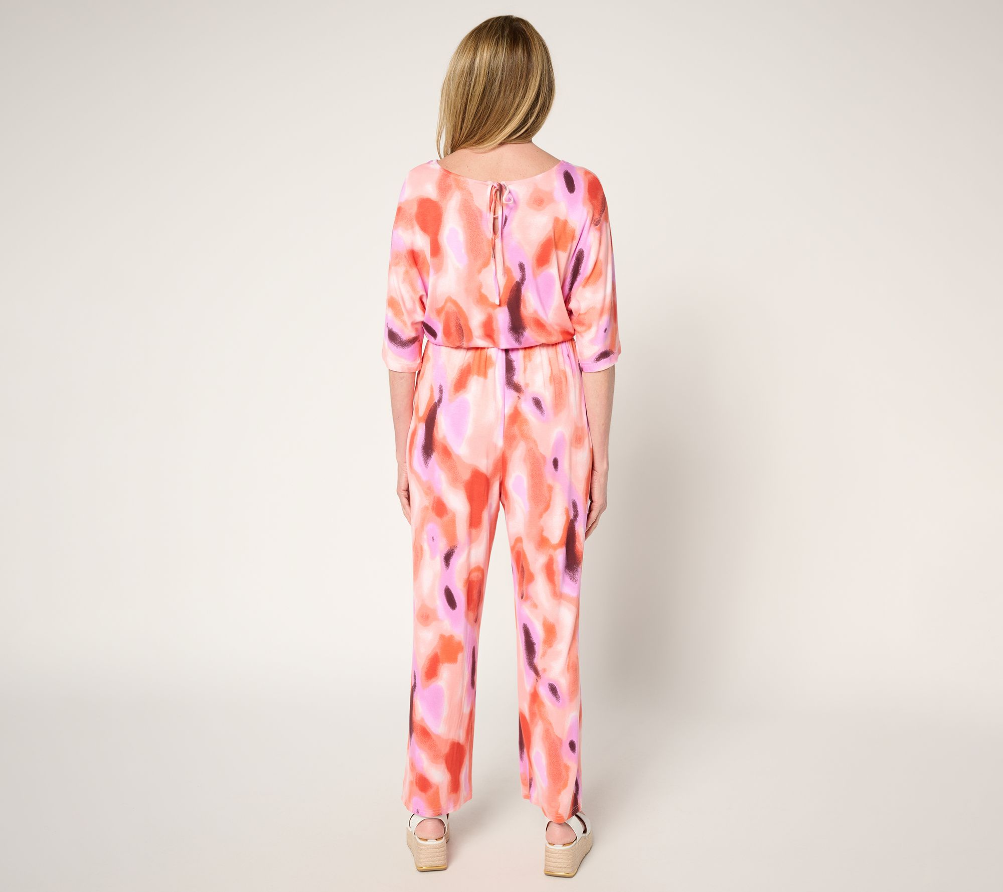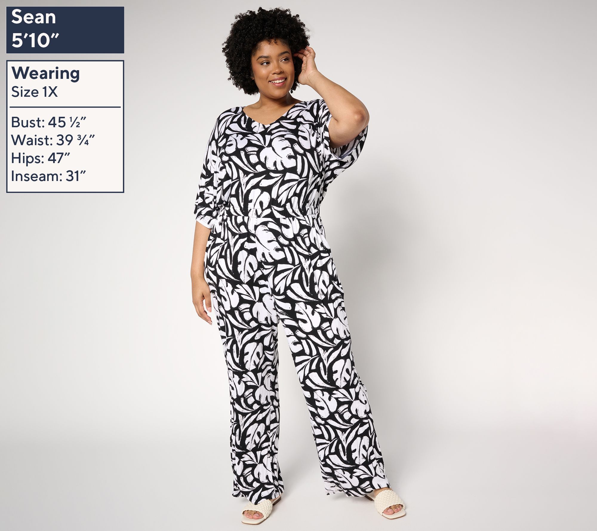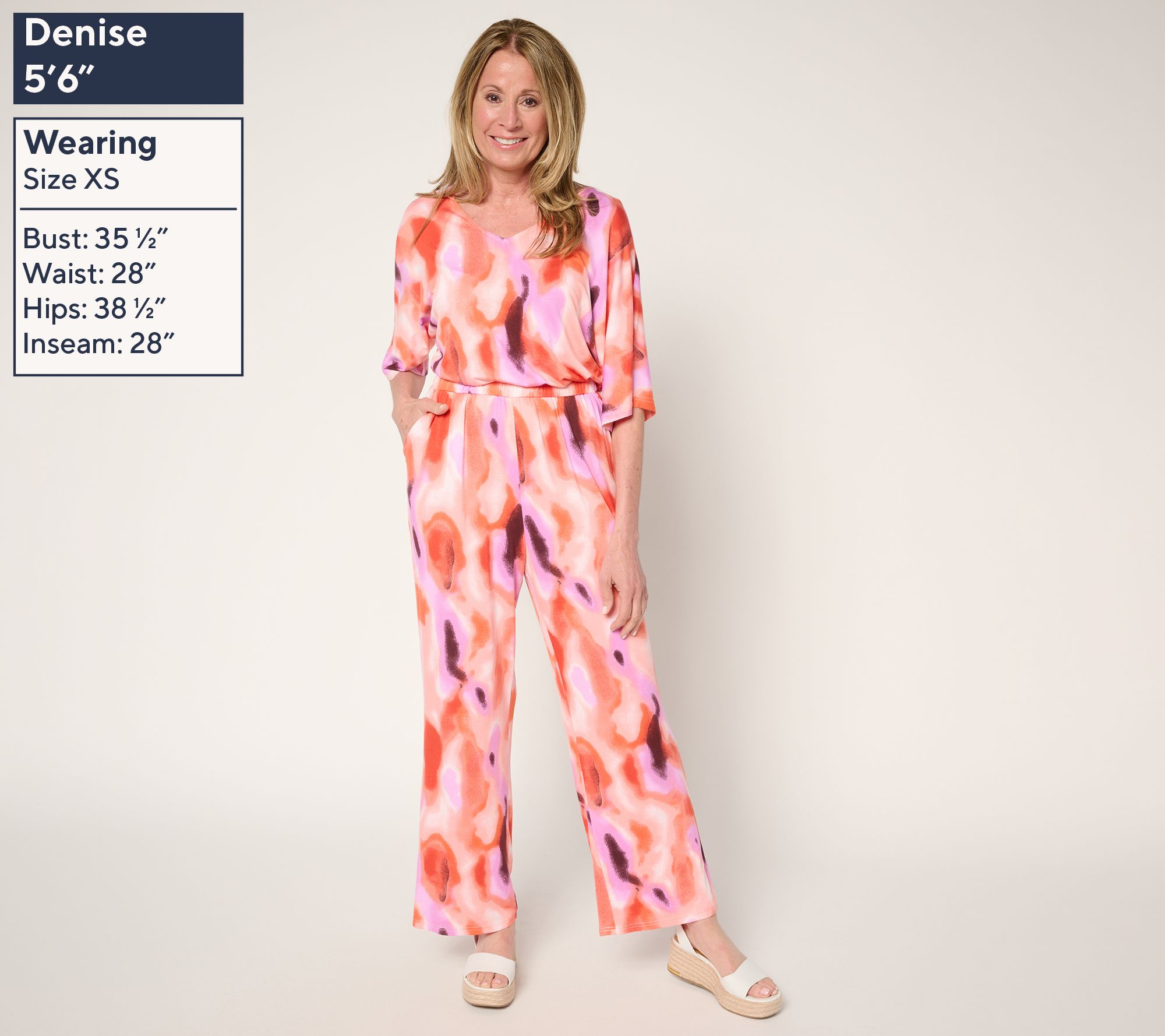 Step into style and comfort with the Brandis Dress Out Loud printed jumpsuit. This chic one-piece features a flattering V-neckline and dolman sleeves, offering a relaxed fit that's perfect for any occasion. With an elastic waist and handy pockets, it's both fashionable and functional. Pair with your favorite accessories for a complete look. From Brandis Dress Out Loud.