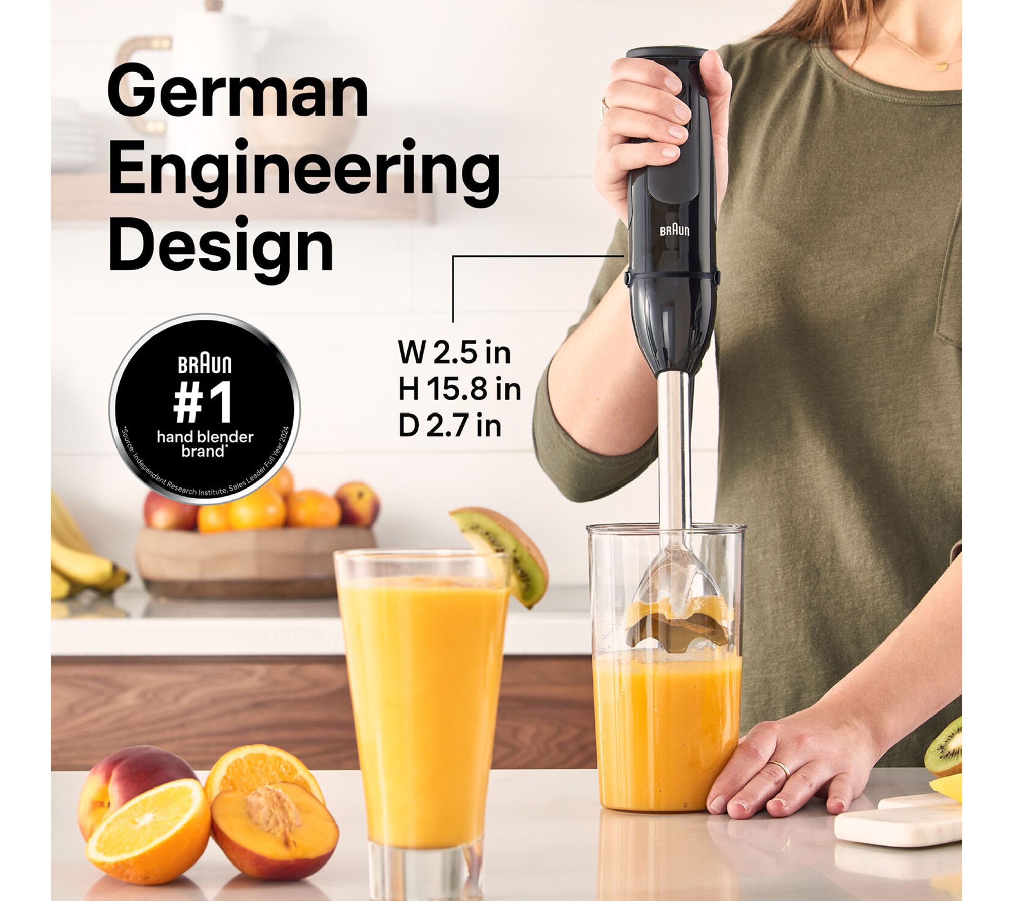 Effortlessly whip up creamy soups, smoothies, or sauces with this hand blender, featuring 21 adjustable speeds and an ergonomic grip for comfort and control. The bell-shaped blending shaft draws ingredients in for exceptionally smooth results, whether you're mixing right in the pot or using the included beaker. Quick cleanup is a breeze with easy-to-rinse, dishwasher-safe parts. From Braun.