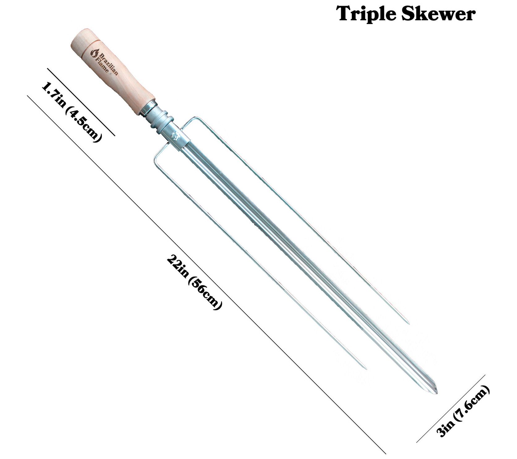 Roast your favorite veggies, seafood, and hot dogs to perfection with this triple skewer. From Brazilian Flame.