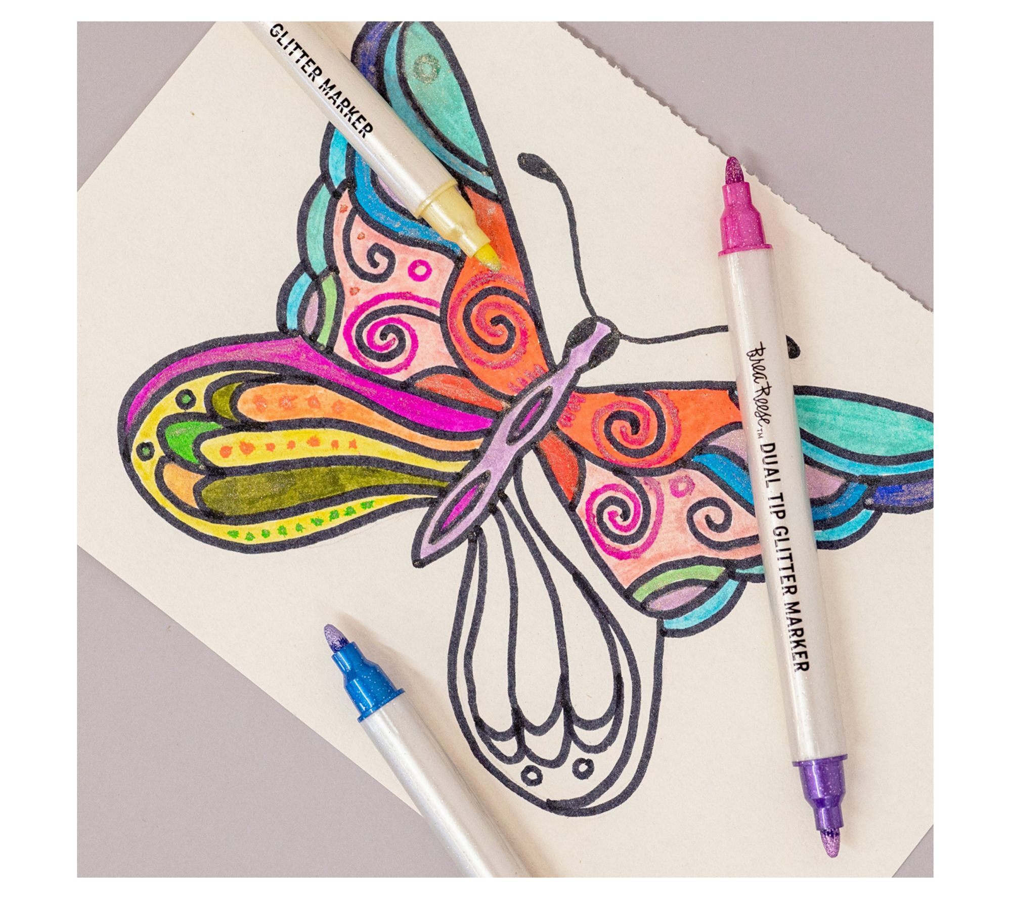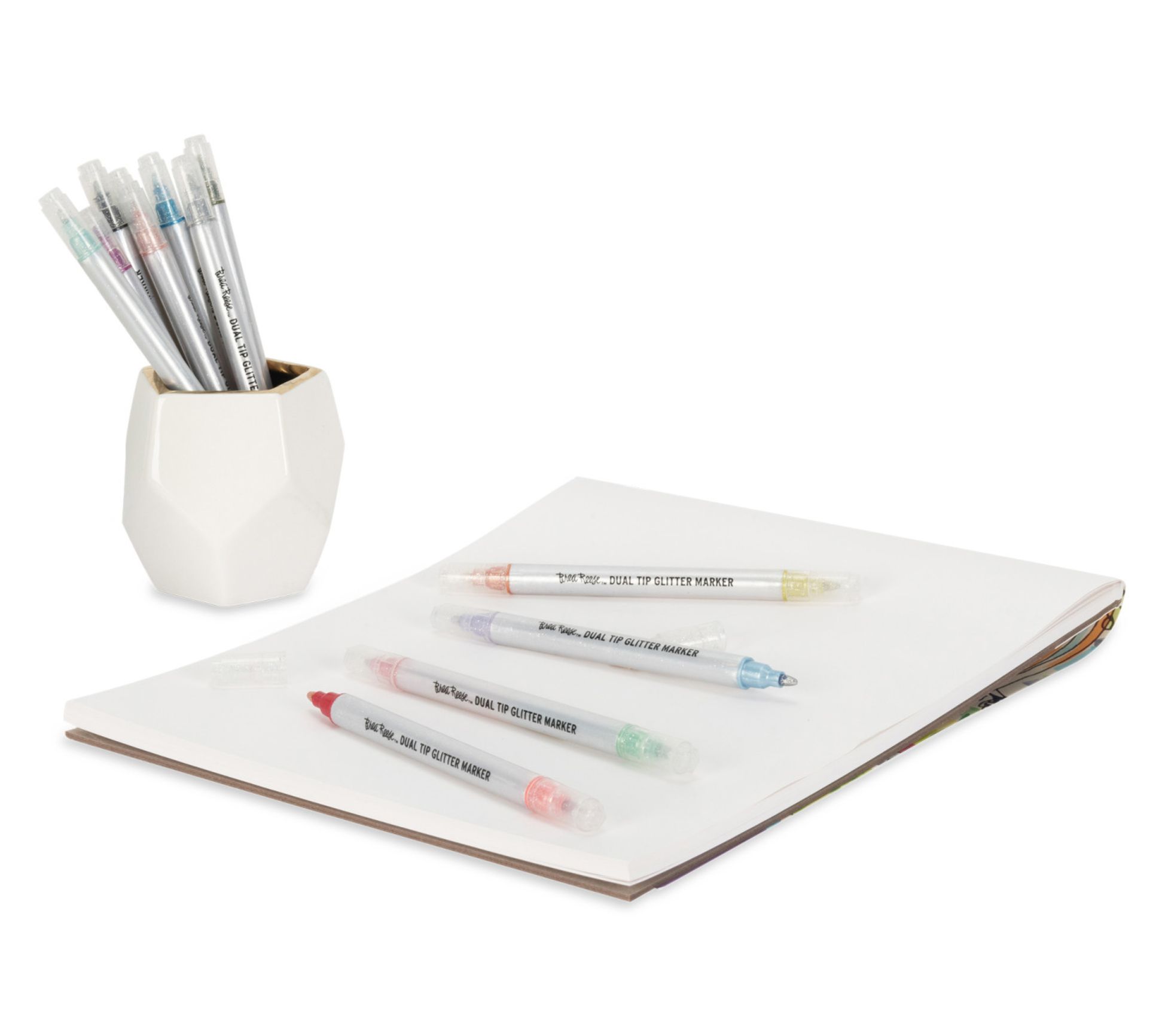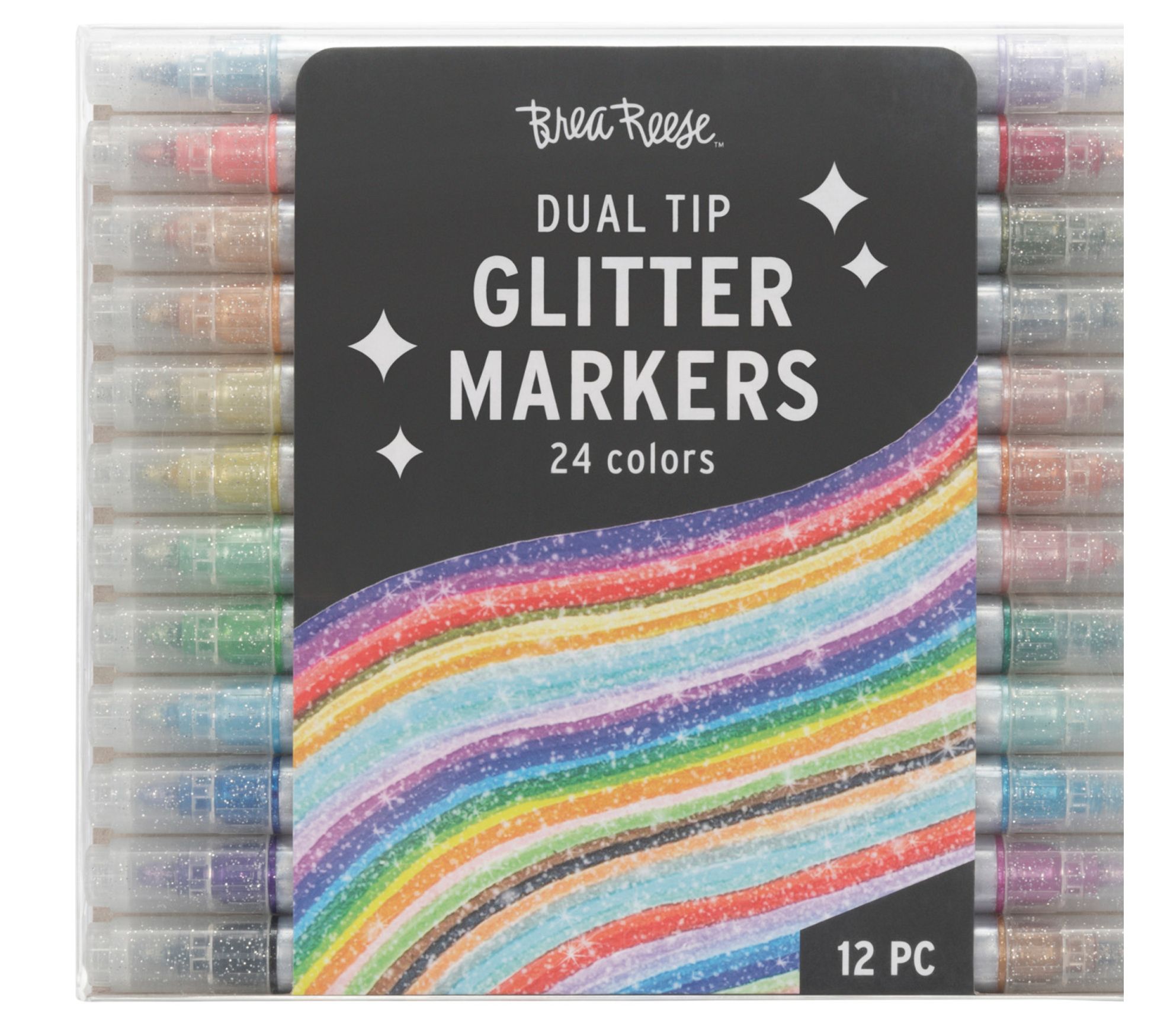 Add sparkle to your DIY projects with this dual-tip glitter markers. Perfect for creating personalized greeting cards, vibrant posters, or glitzy scrapbook pages, the set gives you 24 glittering color options. The dual-tip design offers fine tips for detailed work and broad tips for larger areas. Unleash your creativity and add a touch of glamour to every stroke. From Brea Reese.