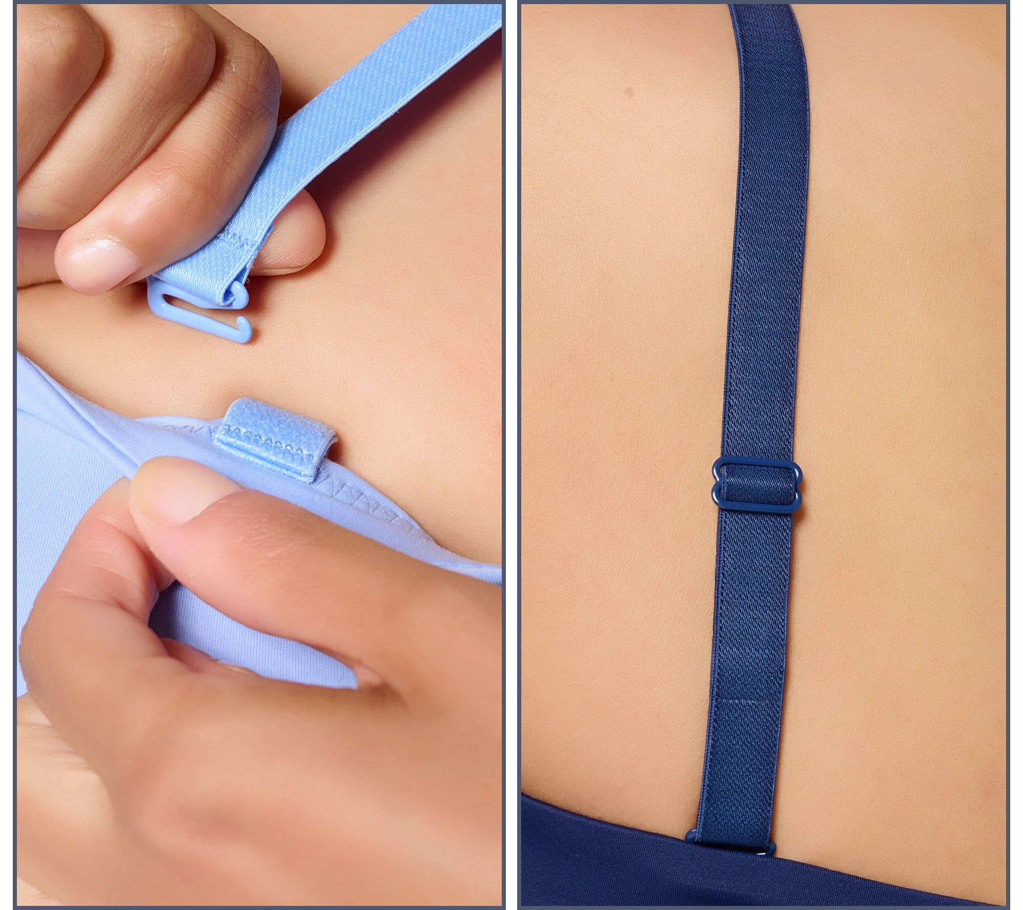 Features: wide side seam for support without wires or hooks, removable soft pads, removable/convertible straps for multiple styling options (traditional bra, halter, or crisscross)