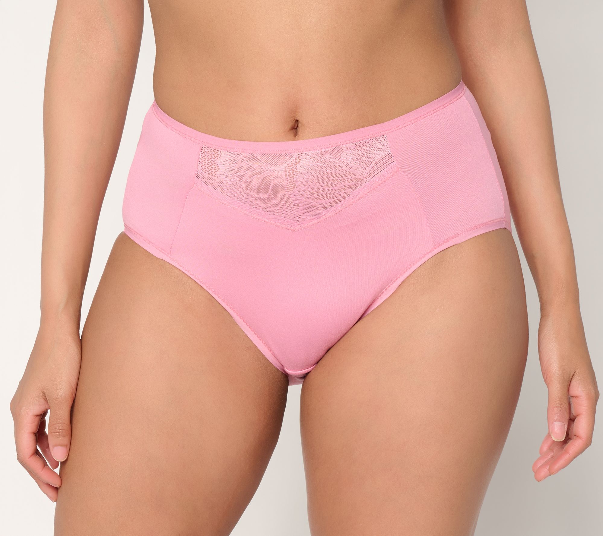 Features: full-coverage design, front sheer lace window, wrapped side seams for a slimming look, UltimAir® gusset liner helps wick moisture away from the body, soft pinch-free elastic at waist and leg openings
