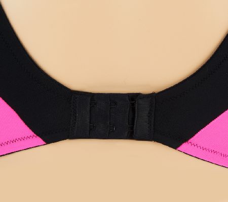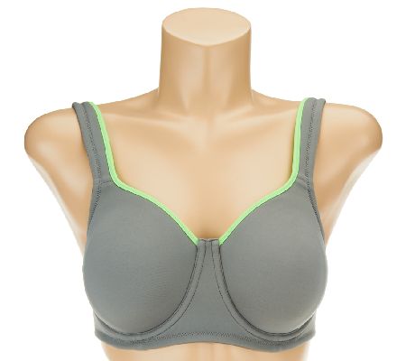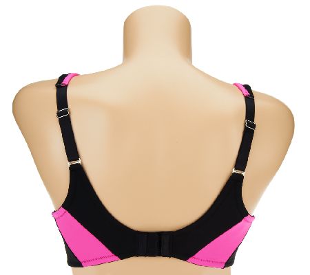 Features: sports style; hidden wire for smooth look; neck and armhole trim detail; paneling detail on back wing; wide, plush support straps for comfort; two-layer fabric cups and soft plush lining for modesty; Dri Release wickable liner at center front, sides, and straps