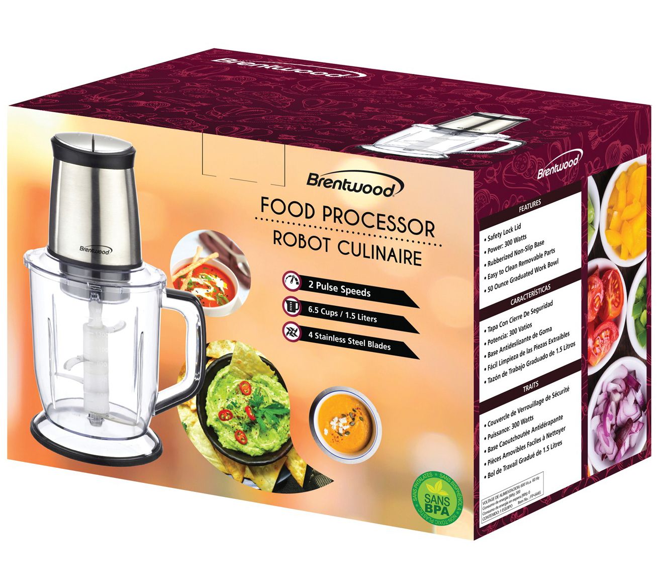 The Brentwood Appliances 300 Watt 4 Blade 6-1/2 Cup Food Processor saves you time and energy in the kitchen. It's ideal for creating dips,salsas, chopping veggies, spices, and more. It features easy to use high and low pulse operations. The sharp, durable stainless steel bladesmince foods in seconds. The safety lid prevents accidents. The compactdesign takes up little counter space and is easy to store. It's BPA free and features dishwasher safe removable parts. DIM: 7.5'' x 6'' x 12.25'';Food processor motor, Lid, Side blade unit, main blade unit, W;F;Food processor motor, Lid, Side blade unit, main blade unit, Work bowl, Scraper, Instruction manual