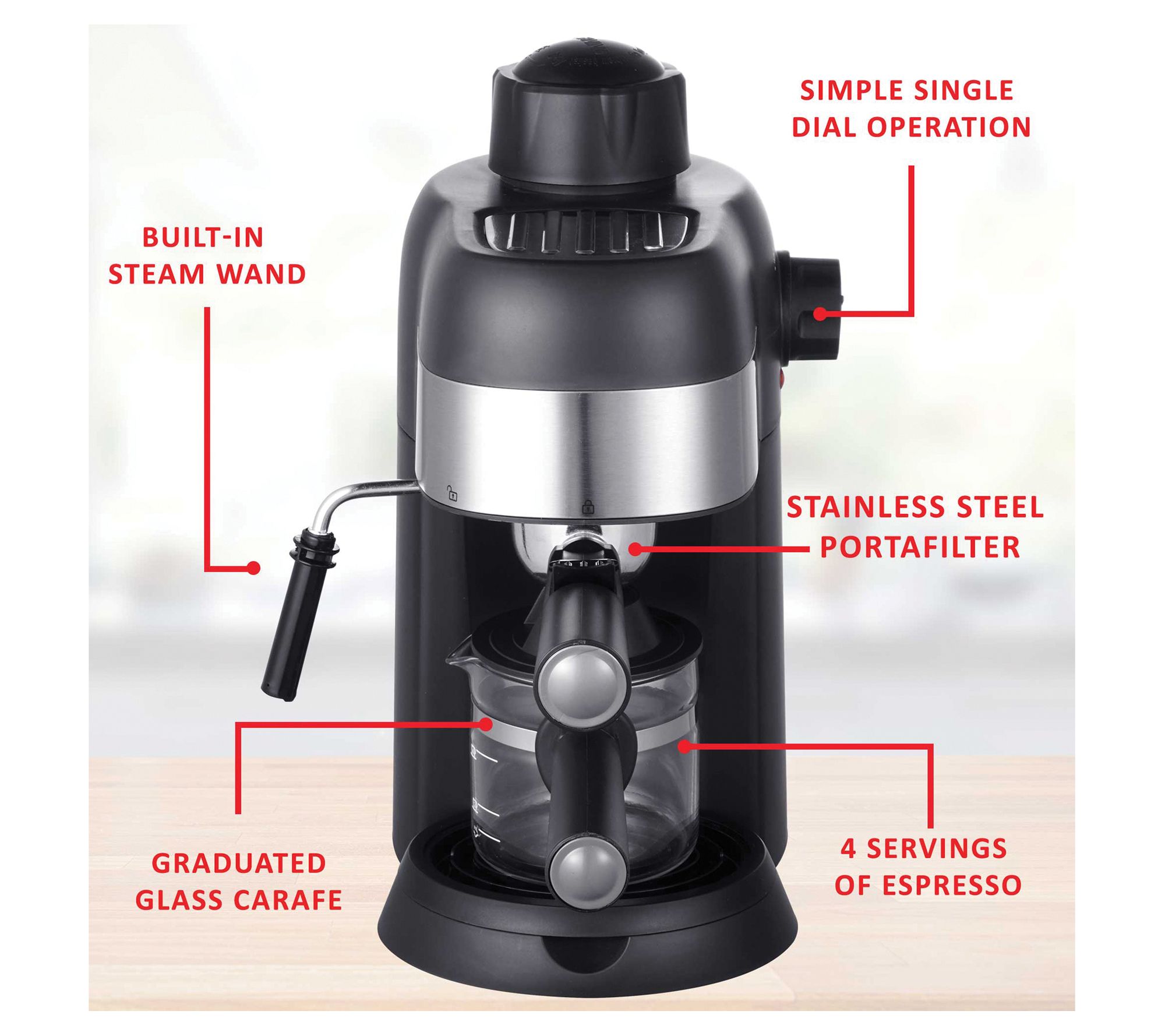 • Includes 800W espresso and cappuccino maker, carafe, portafilter, filter basket, and instruction manual