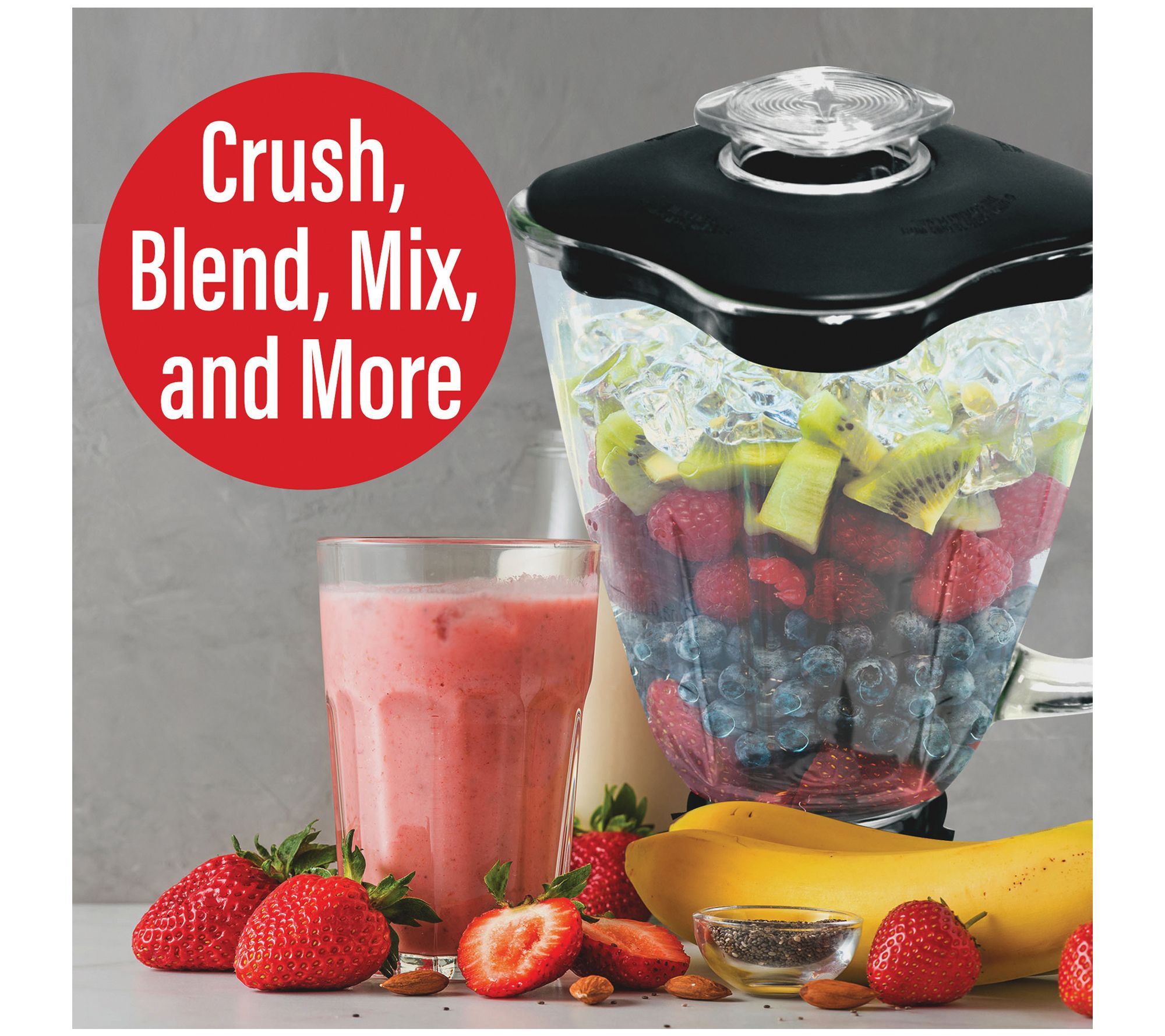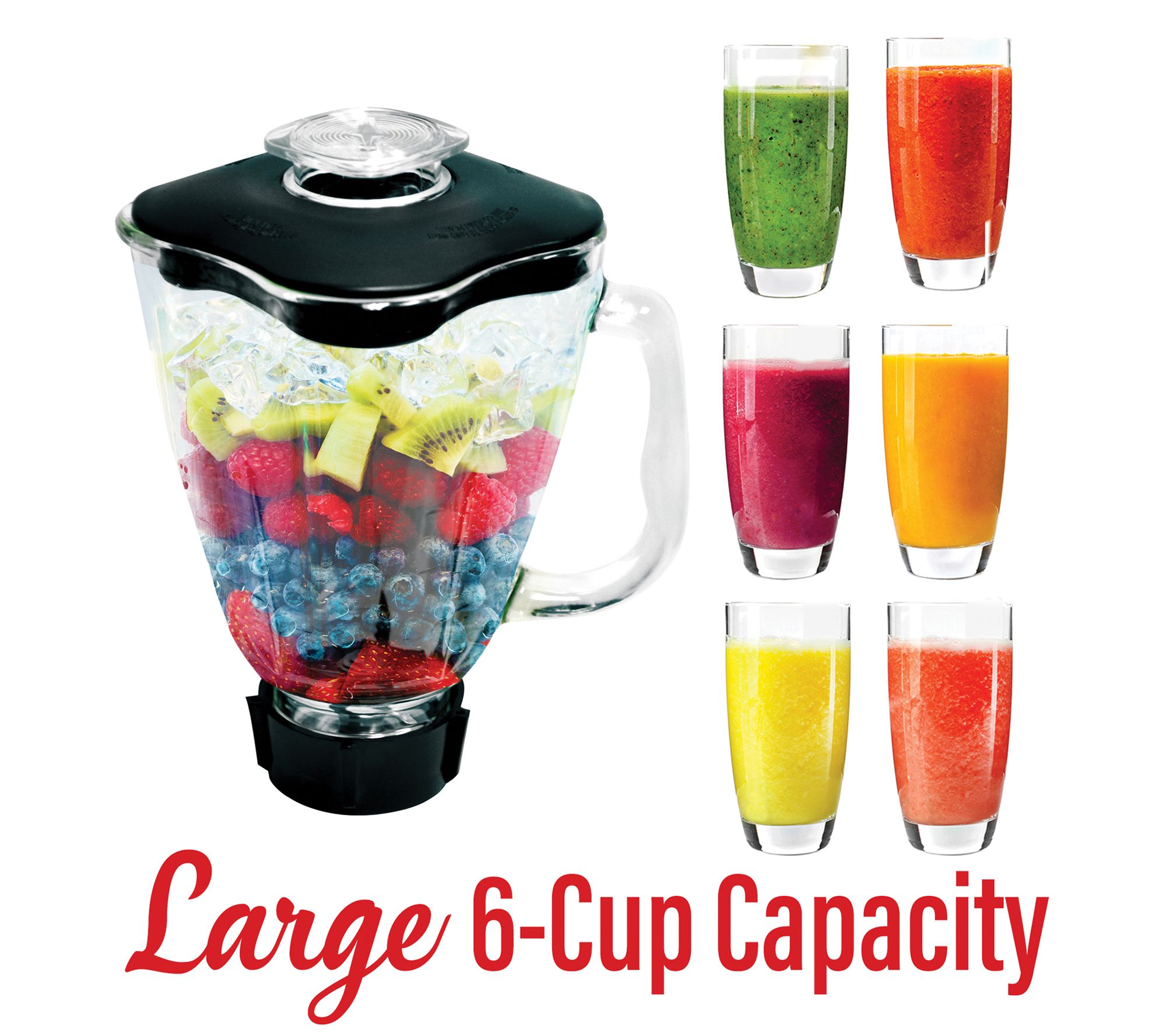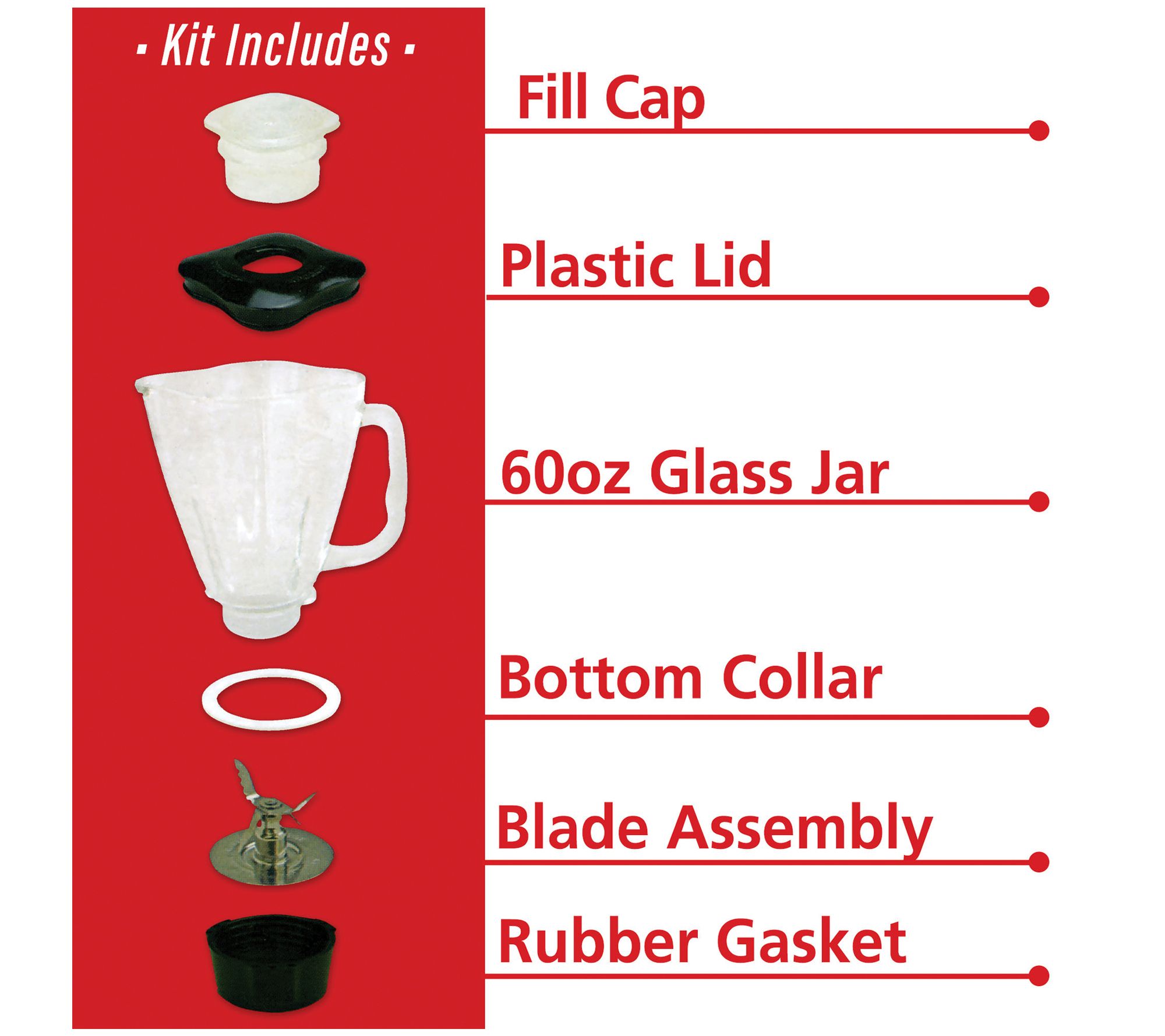 • Includes 60-oz glass jar, fill cap, plastic lid, bottom base, rubber gasket, and stainless steel blades