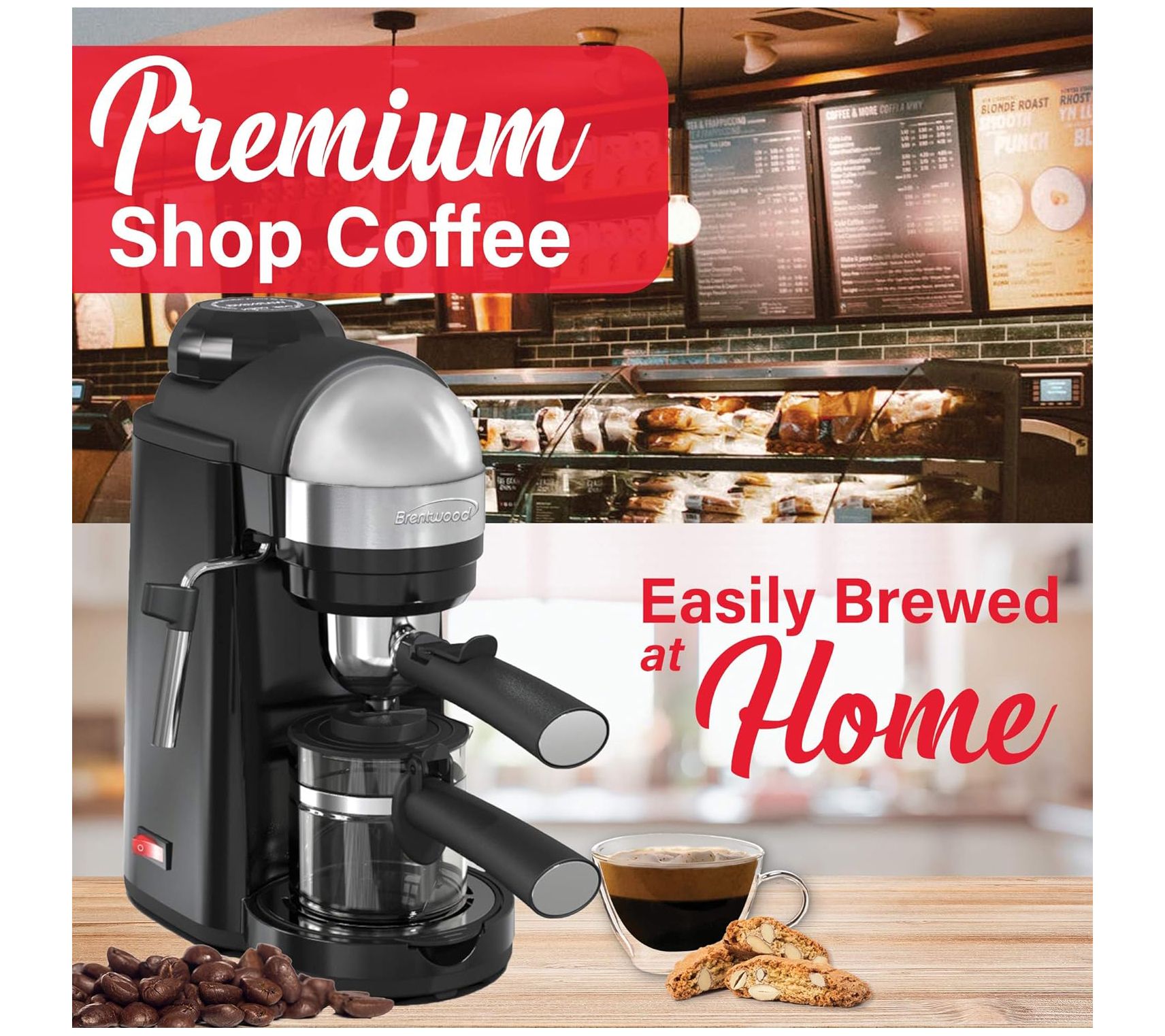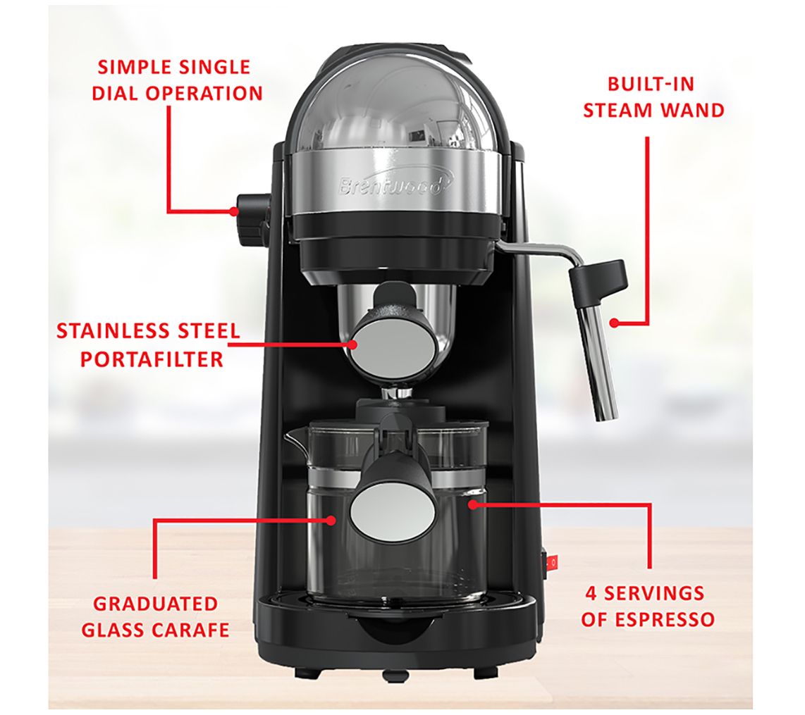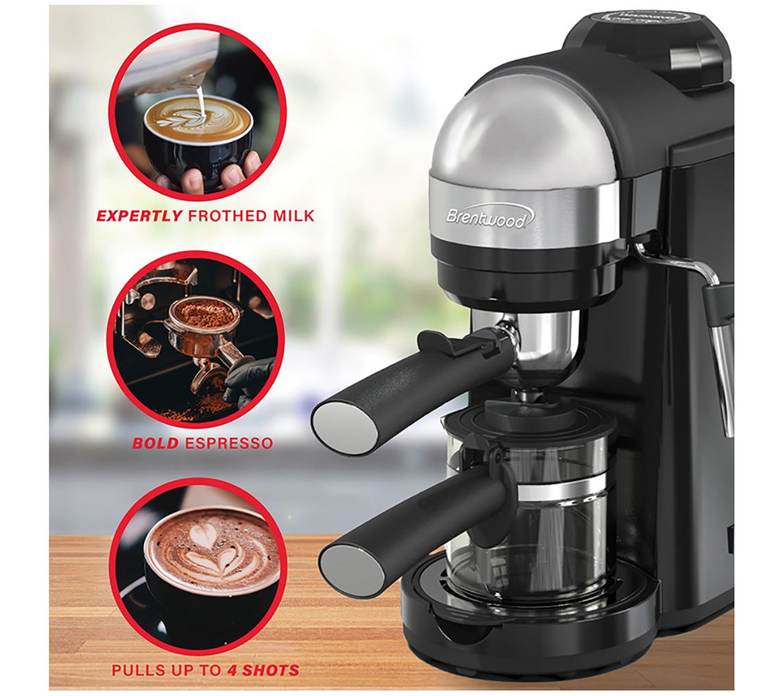 Enjoy coffee-shop quality in the convenience of your own home. This espresso and cappuccino maker brews four servings of rich, creamy espresso, and a powerful stem wand puts cappuccinos and lattes at your fingertips. From Brentwood.