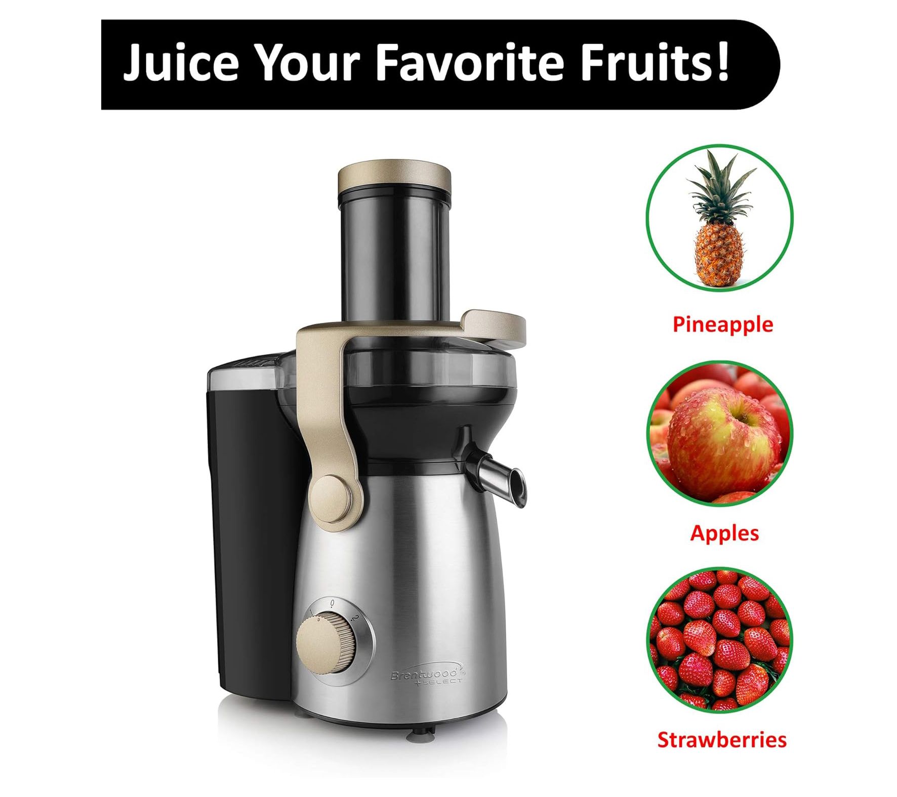 Whip up fresh, flavorful juice at home with this two-speed juice extractor, designed to handle everything from apples to leafy greens. The powerful motor turns whole fruits and veggies into a delicious morning drink, while the included 50-oz graduated jar lets you pour and serve right away. From Brentwood.
