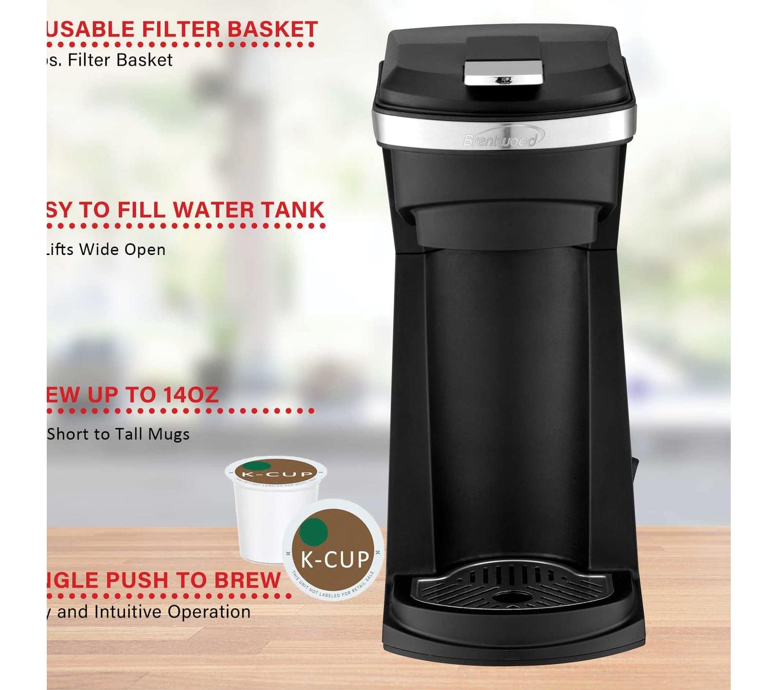 The powerful 800-Watt Brentwood Single-Serve Coffee Maker with Reusable Filter Basket for K-Cup Pods is everything you need to start enjoying the ideal cup of coffee. Just choose your favorite K-Cup, soft pod,or coffee grounds, add water and push to start brewing. Save money using the reusable mesh filter basket. The unit holds up to 14 oz. of water. Easily fill the unit with water using the top-loading lid. The filter cup, K-Cup/Soft Pod holder, and drip tray are removable for easy cleaning. This coffee maker and its removable parts are completely BPA;;Coffee Maker , Manual
