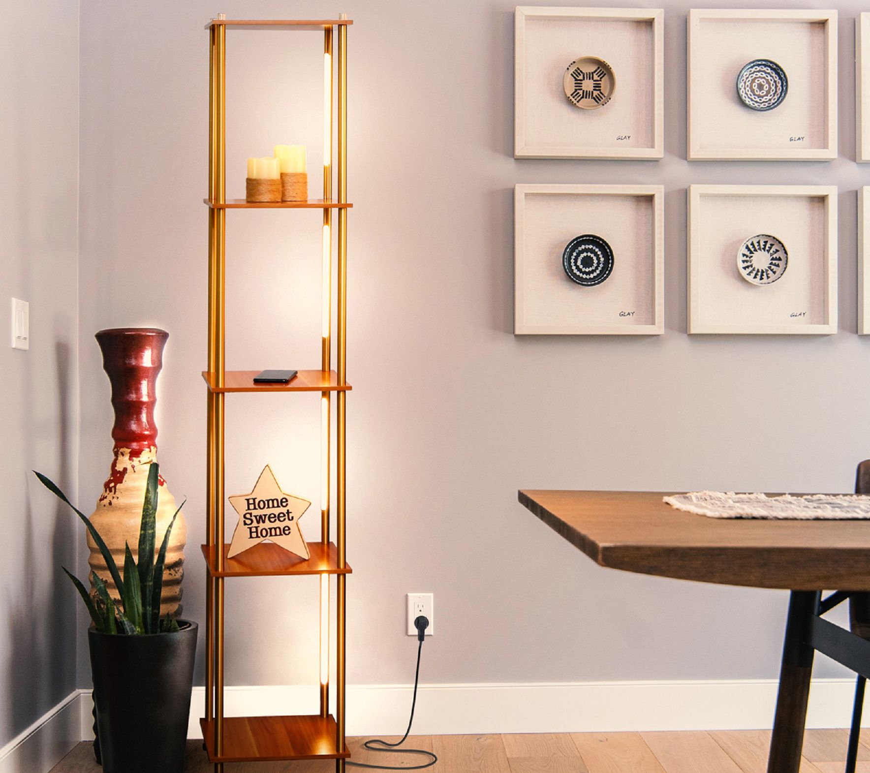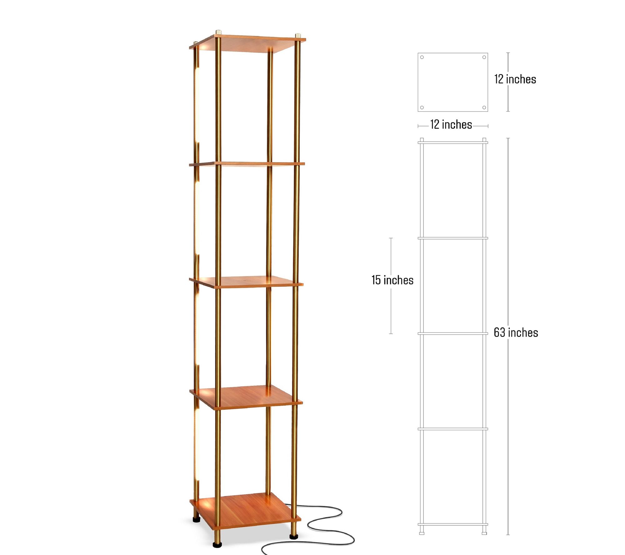 • Measures 12" x 12" x 63"; Cord 82"; Each shelf supports up to 4 lbs