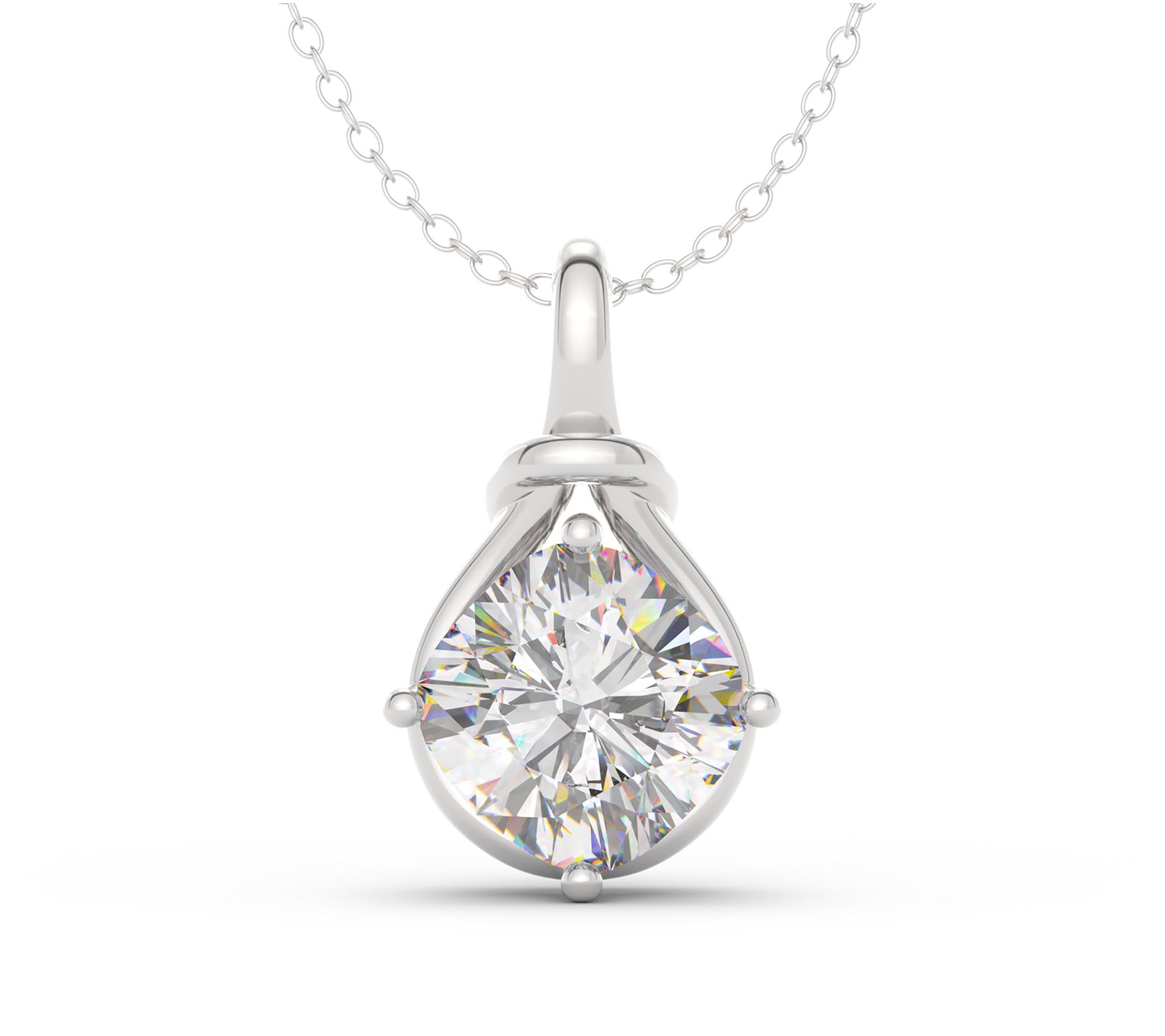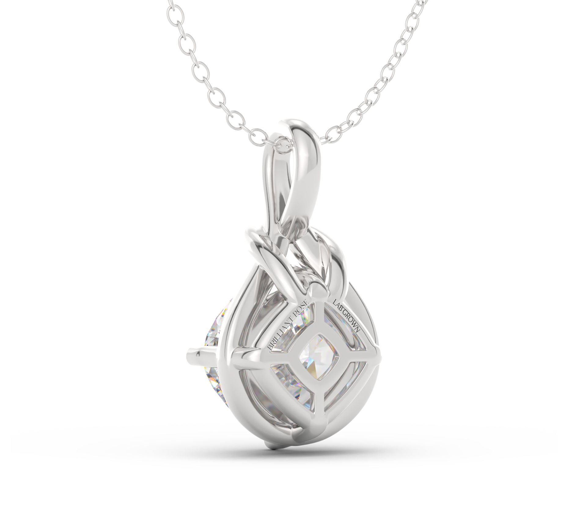 Cushion-cut, lab-grown diamond in a four-prong setting; oval-link chain