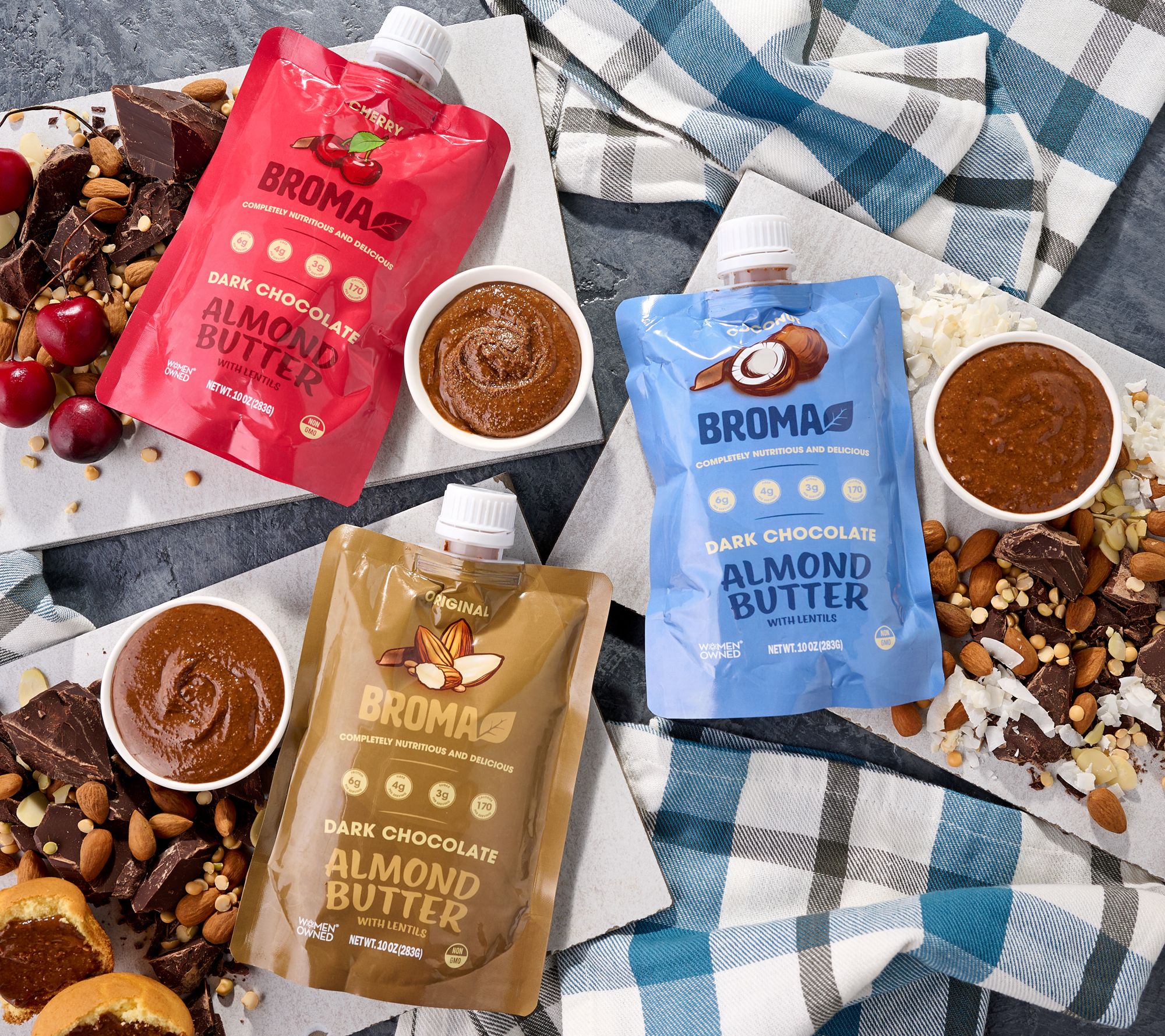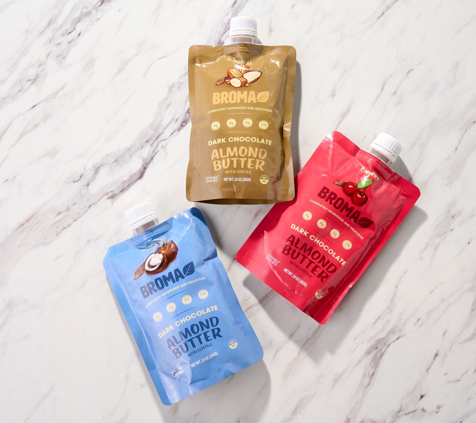 Indulge in the rich flavors of Broma's dark chocolate almond and lentil butters. Spread them on your favorite crackers and bread or enjoy them straight from the pouch for a delightful treat. From Broma.