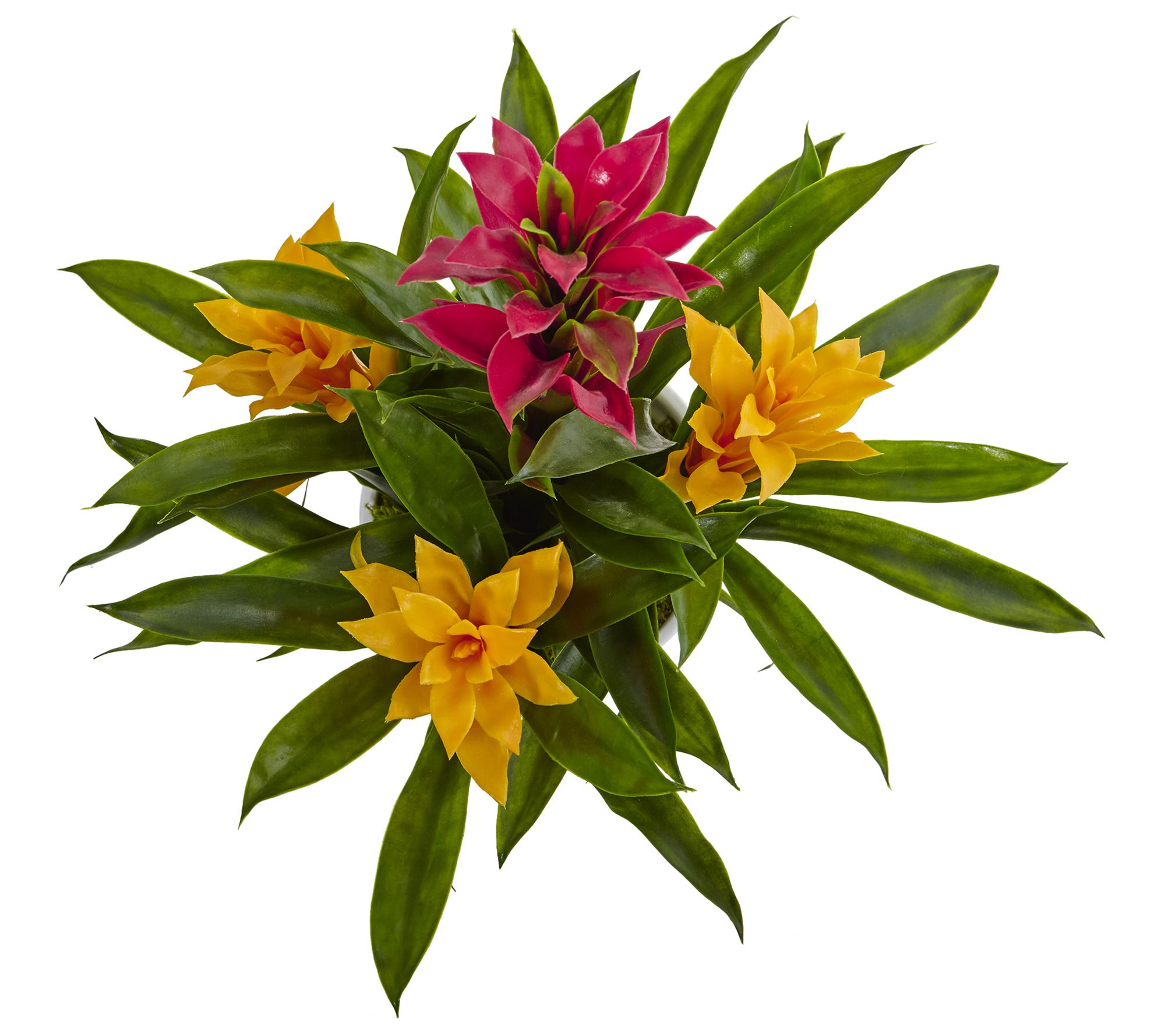 Brilliant yellows, broad greens, and bright reds instantly liven up any table or corner of your home when you add this realistic bromeliad plant. From Nearly Natural.