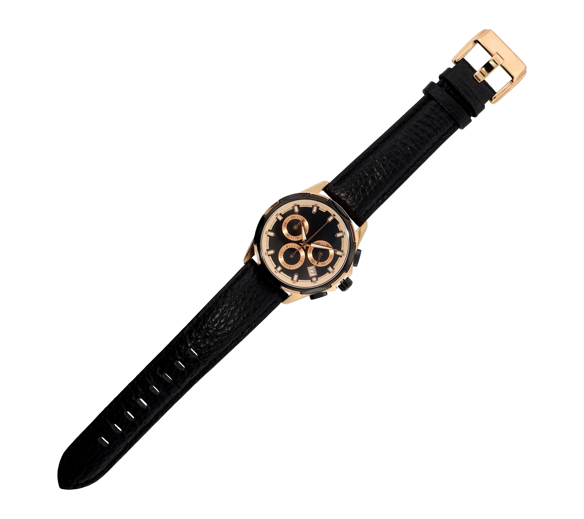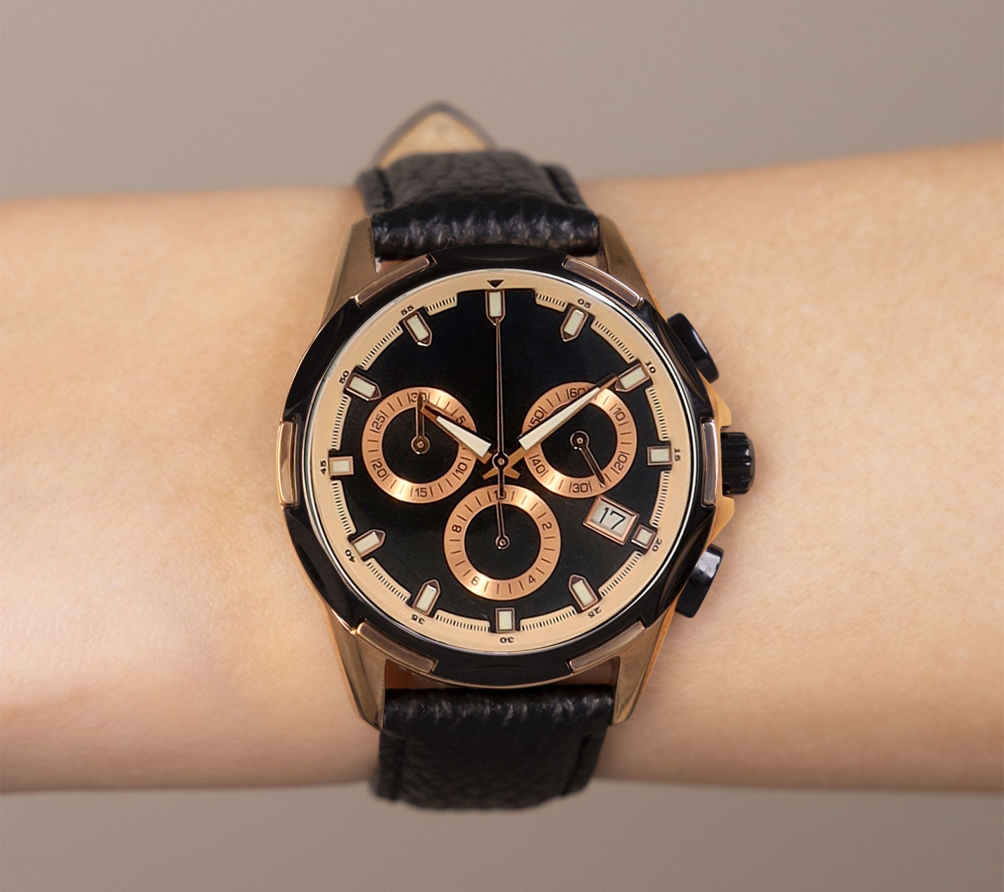 • Round black analog dial; rose gold-tone hour markers; date display; three subdials for chronograph function; side pushers; rose tone crown