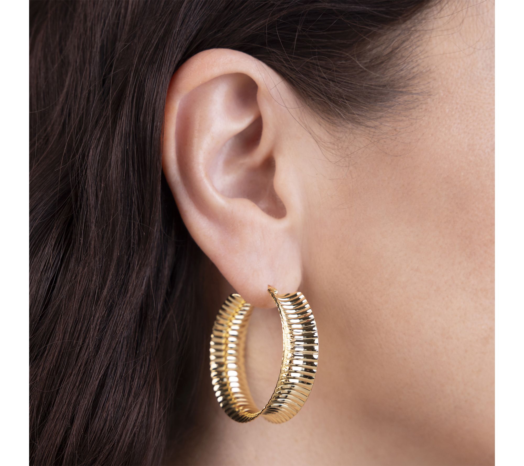 Add a touch of Italian artistry to your ensemble with these hoop earrings, effortlessly blending modern elegance with classic charm. The striped texture and subtle concave detailing catch the light beautifully, making them a stylish choice for day or evening wear. From Bronzo Italia®.