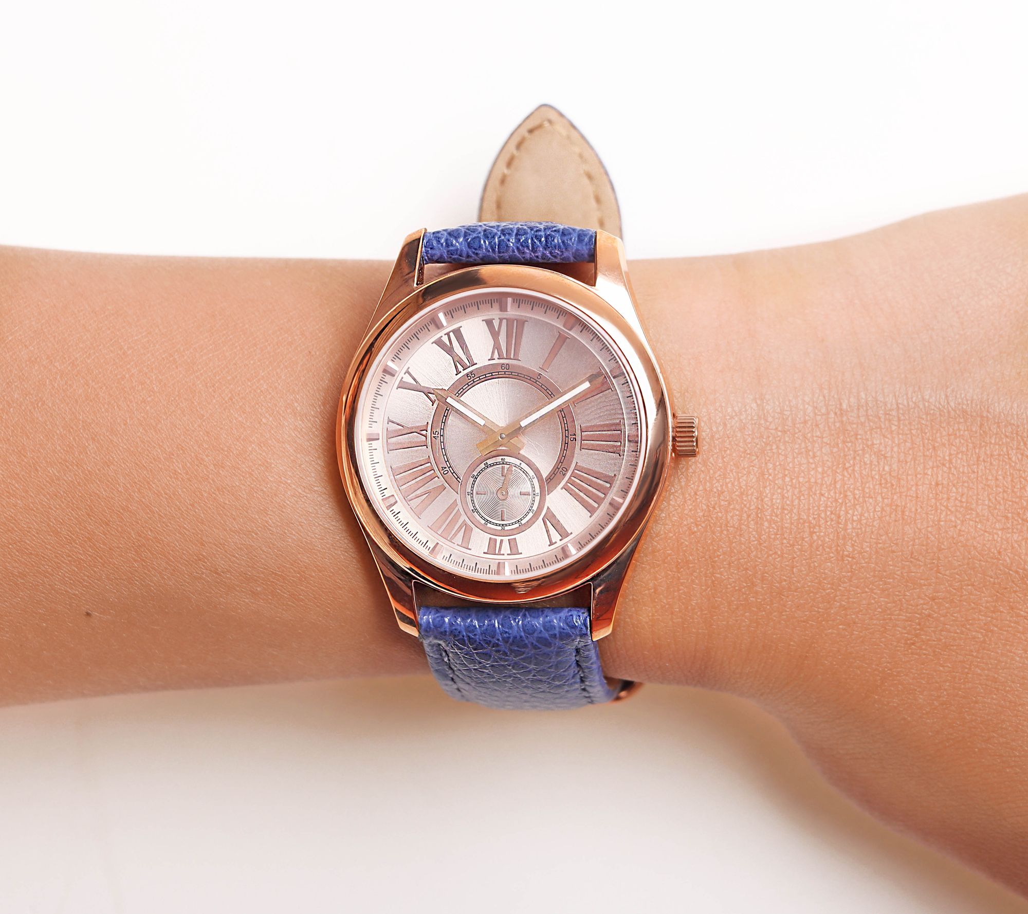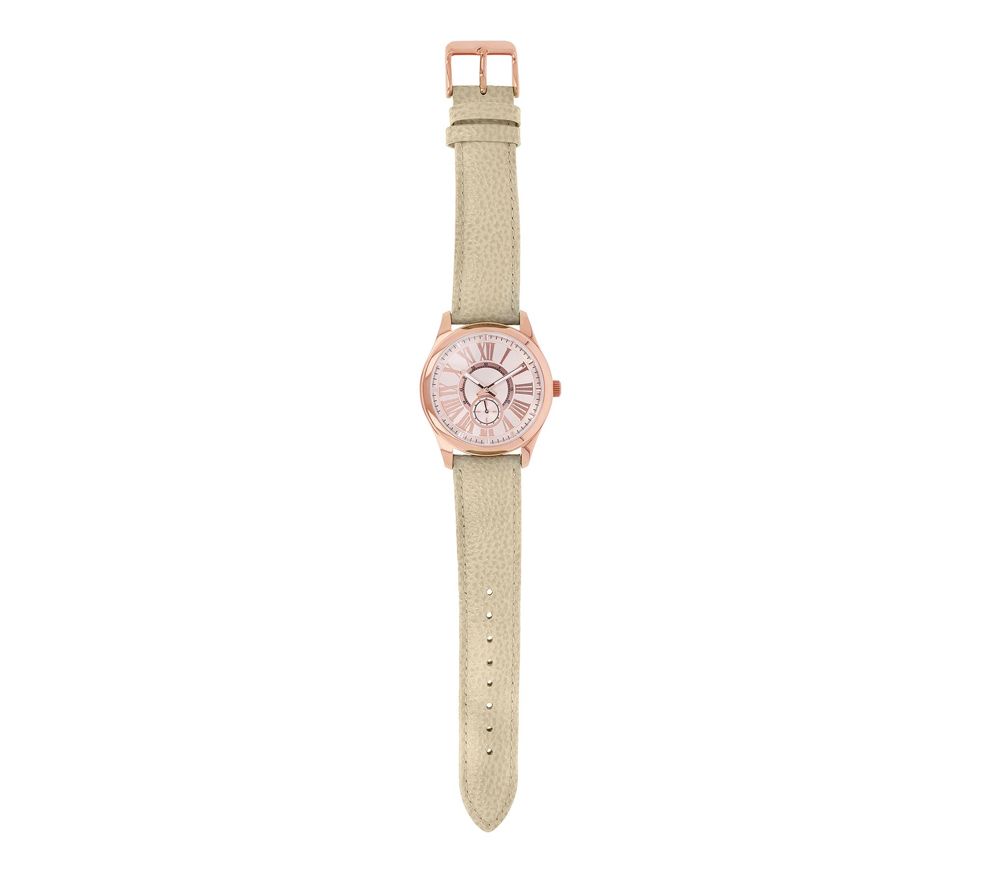 • Round case; stainless steel caseback; rosetone crown; rosetone dial