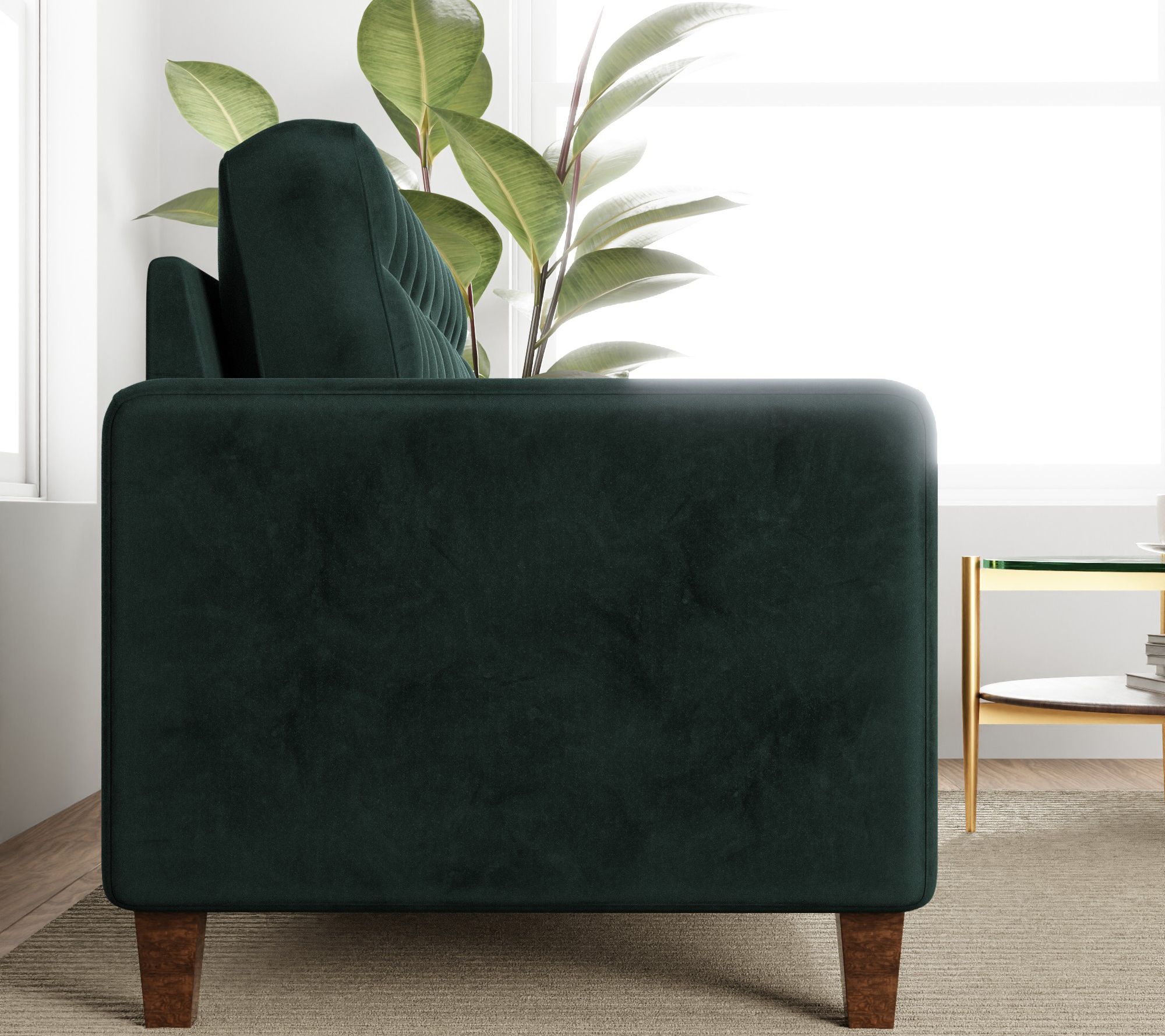 • Square arms; linen-like velvet-finished upholstery; buttonless tufting; thick foam cushions