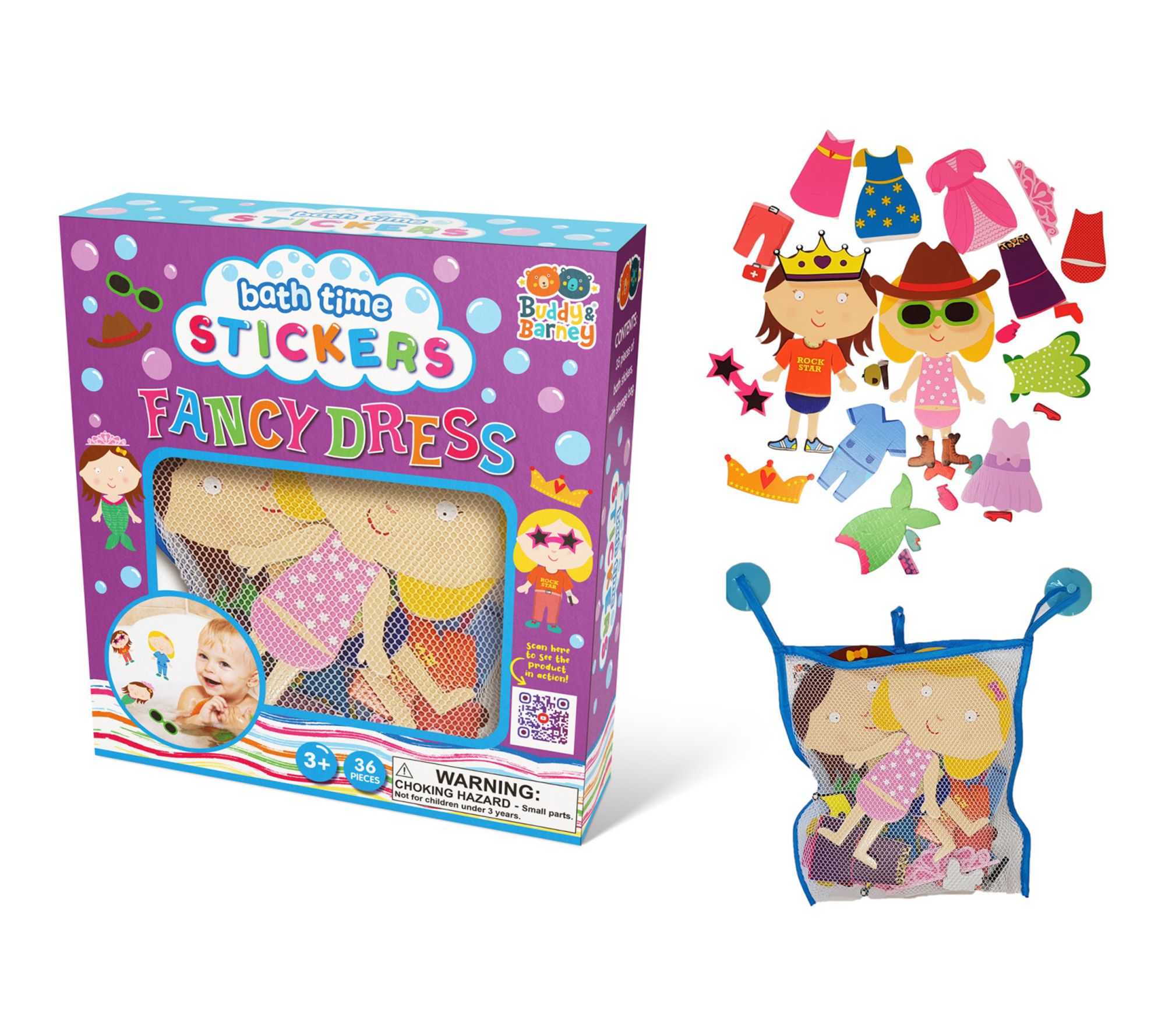 Bath time becomes an adventure in creativity with these Fancy Dress bath stickers. Colorful foam clothes and accessories invite children to mix and match imaginative outfits as they stick pieces to the bath or tile, turning routine washes into splashy fashion shows. Cleanup is a breeze with the included mesh storage bag, making every session both playful and organized. From Buddy & Barney.
