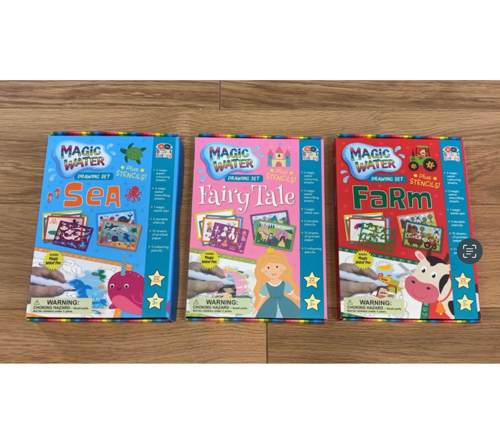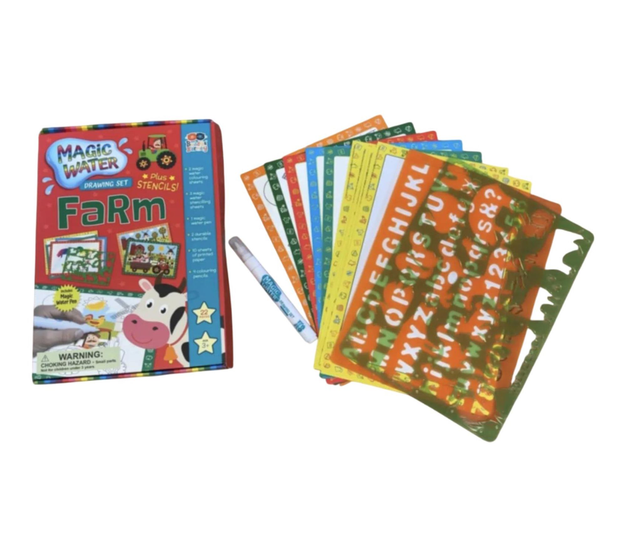 • Includes two magic coloring sheets, three water stencils, one water pen, two stencils, ten sheets of paper, and four coloring pencils
