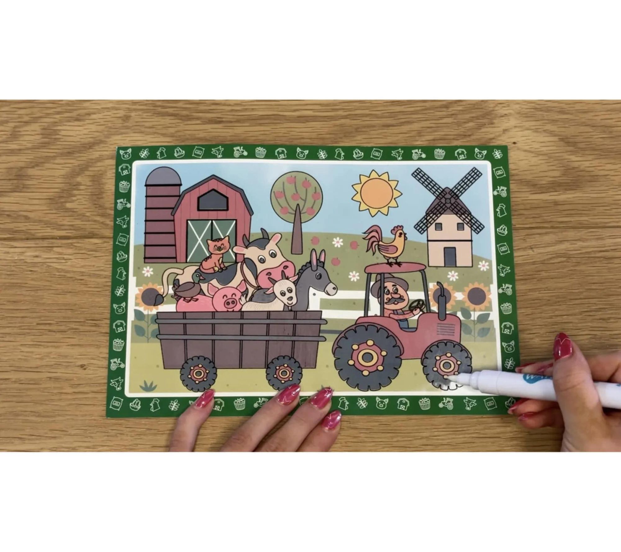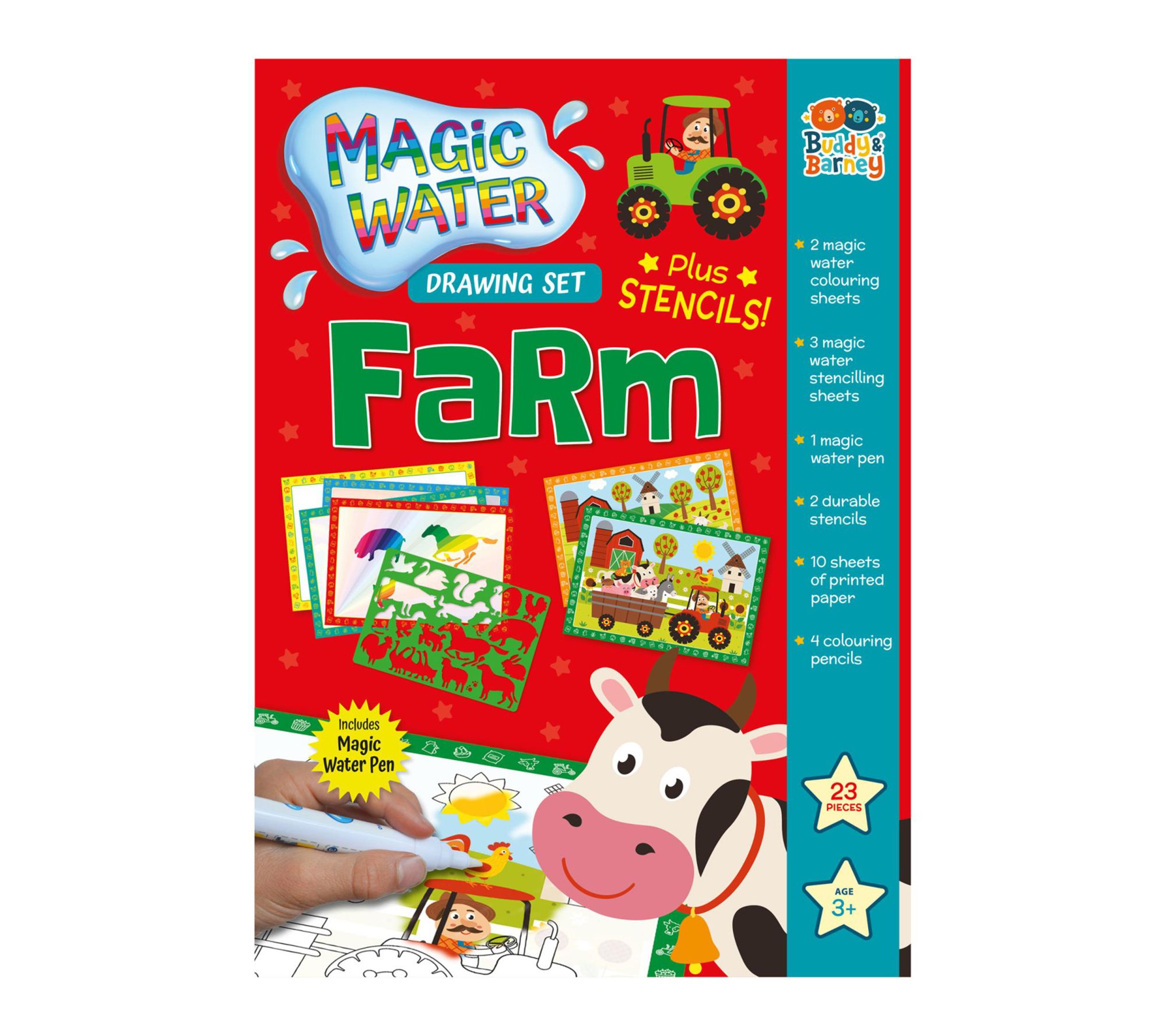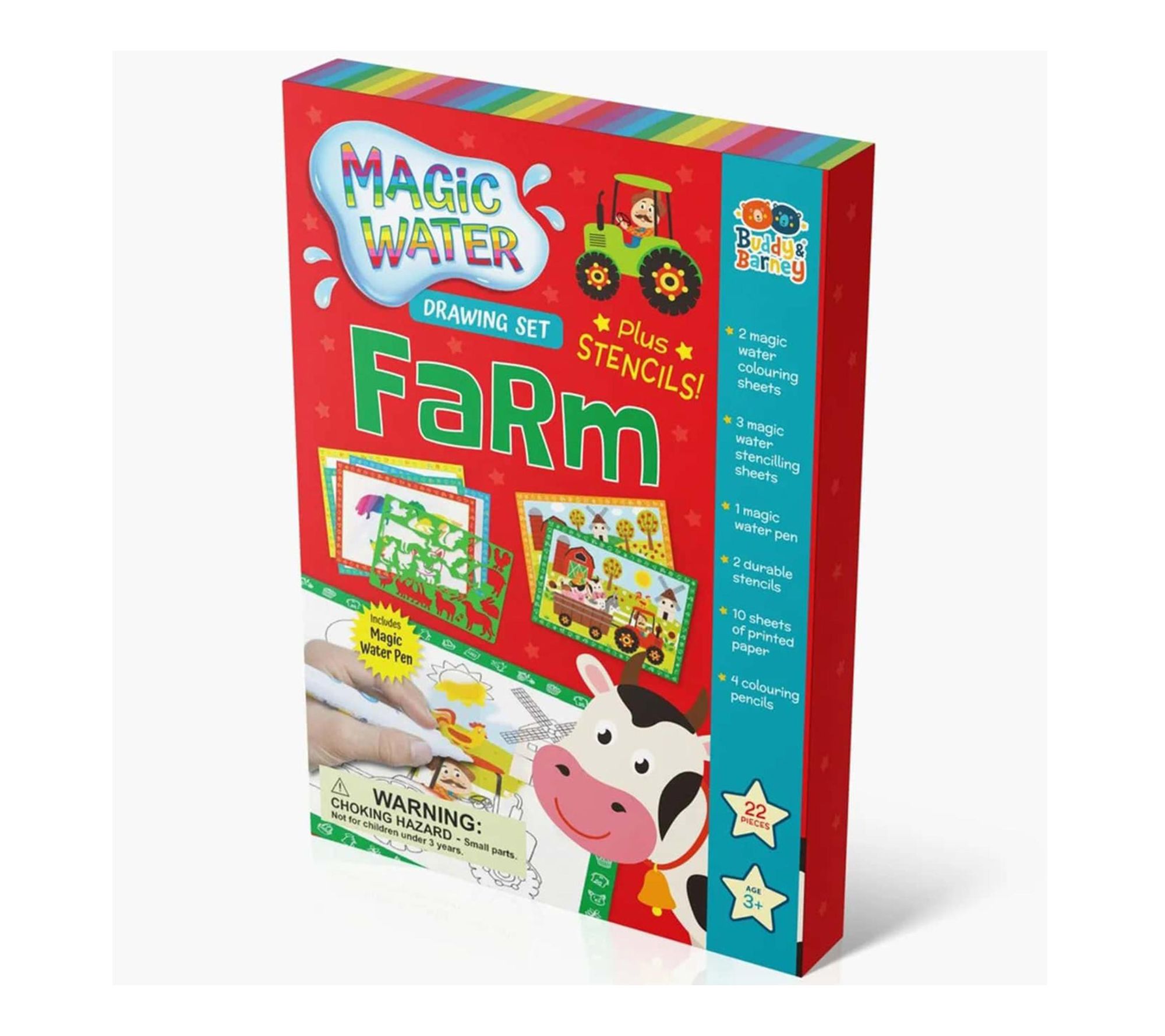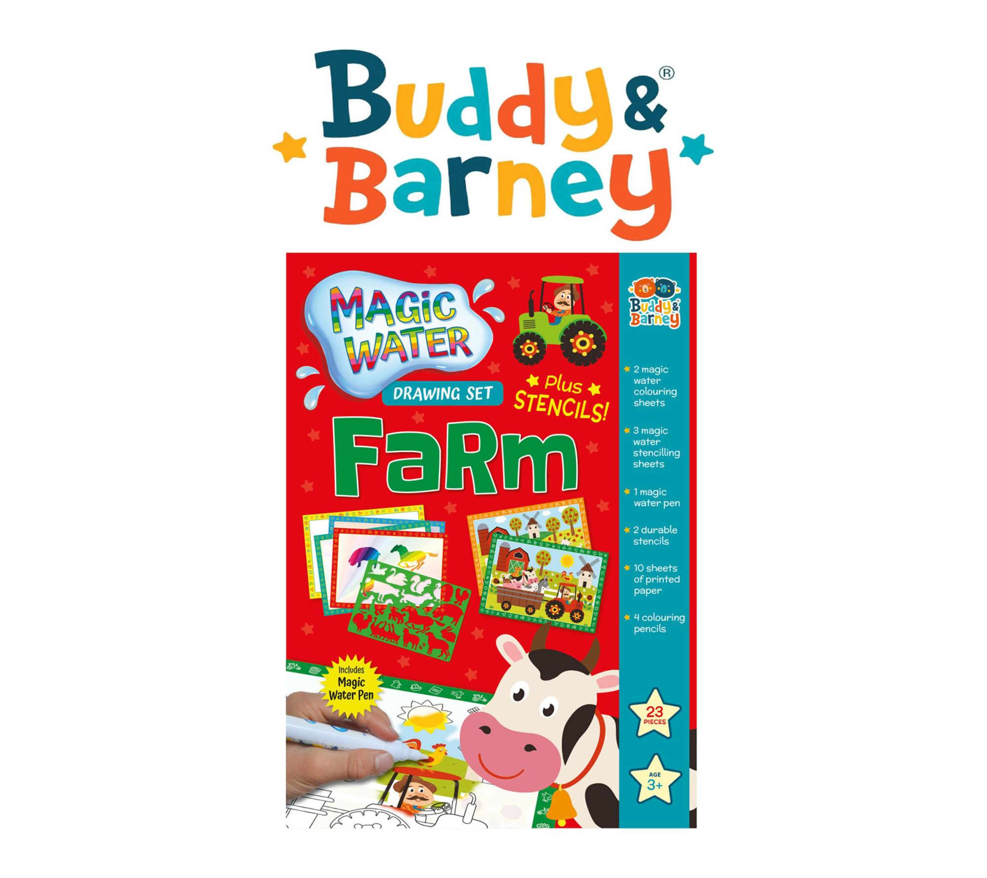 Little artists can reveal vibrant farmyard adventures again and again with this mess-free drawing set. Filled with reusable coloring sheets, stencils, pencils, and a magic water pen, it's the ultimate crafty companion for road trips, rainy days, or quiet moments at home -- no cleanup required. From Buddy & Barney.